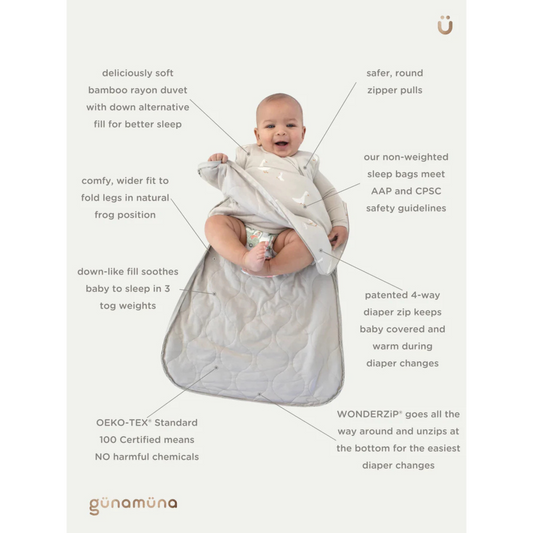 With their roots in family and their name inspired by the Sanskrit word for “innocence,” Gunamuna reflects the values of care, safety, and love. Everything they create is focused on keeping babies happy, healthy, and cozy. Their tagline, “a change for the better,” embodies not only their approach to baby sleepwear but also their commitment to continuous improvement.