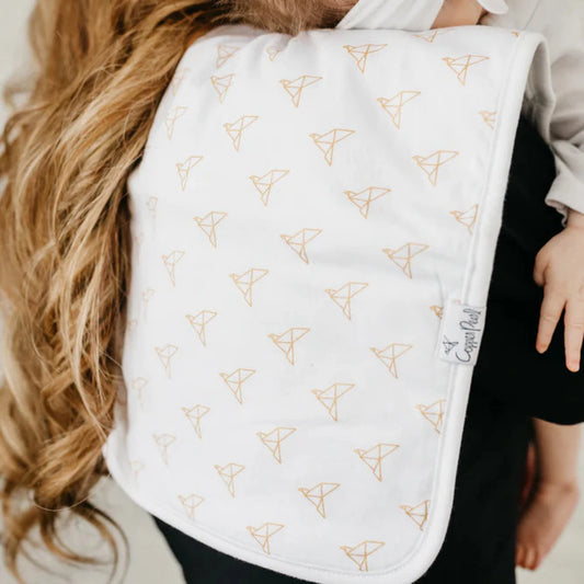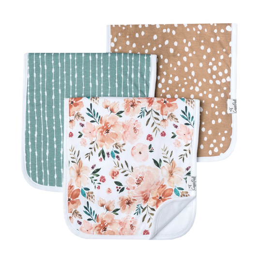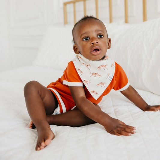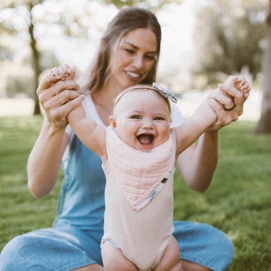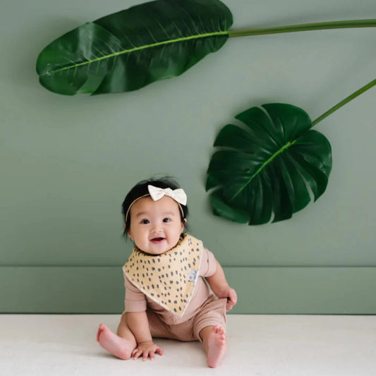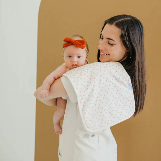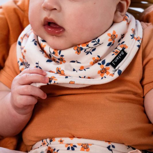 Soft terracotta bandana bib with snap closure, designed to keep babies dry and comfortable during feeding or teething.