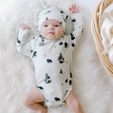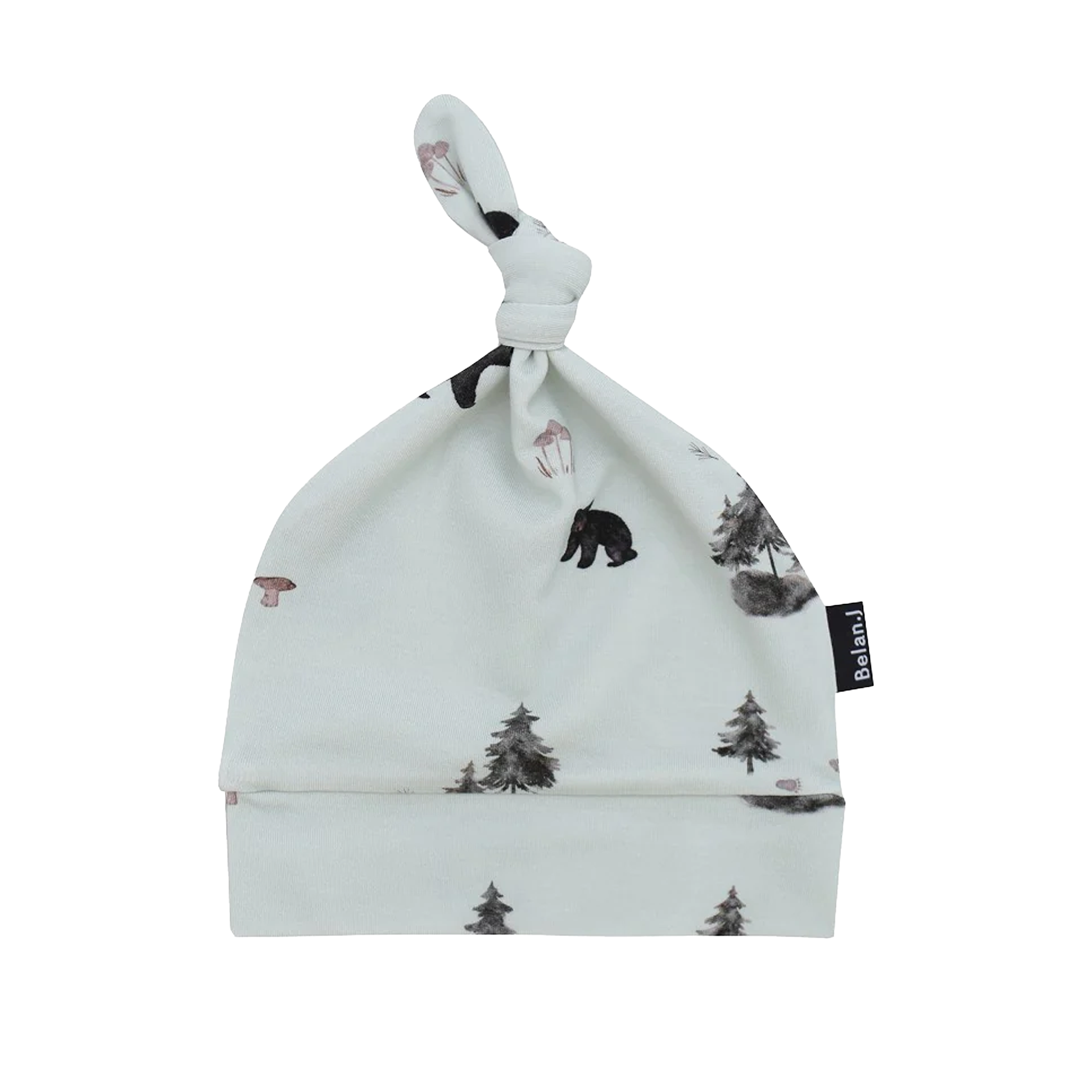 Gardez la tête de bébé bien au chaud avec ce bonnet noué en rayonne de bambou. Le nœud s'ajuste à mesure que bébé grandit. Le tissu présente un imprimé aquarelle personnalisé représentant une maman et son bébé ours, des arbres et des champignons.