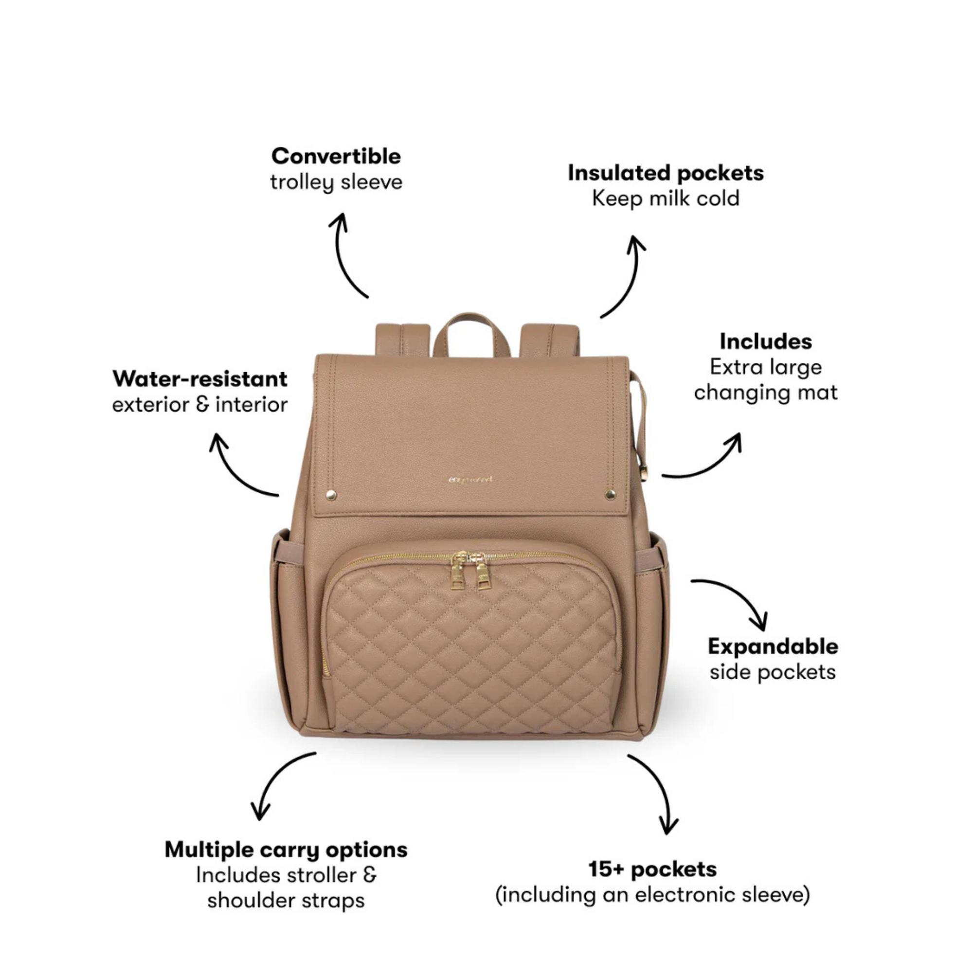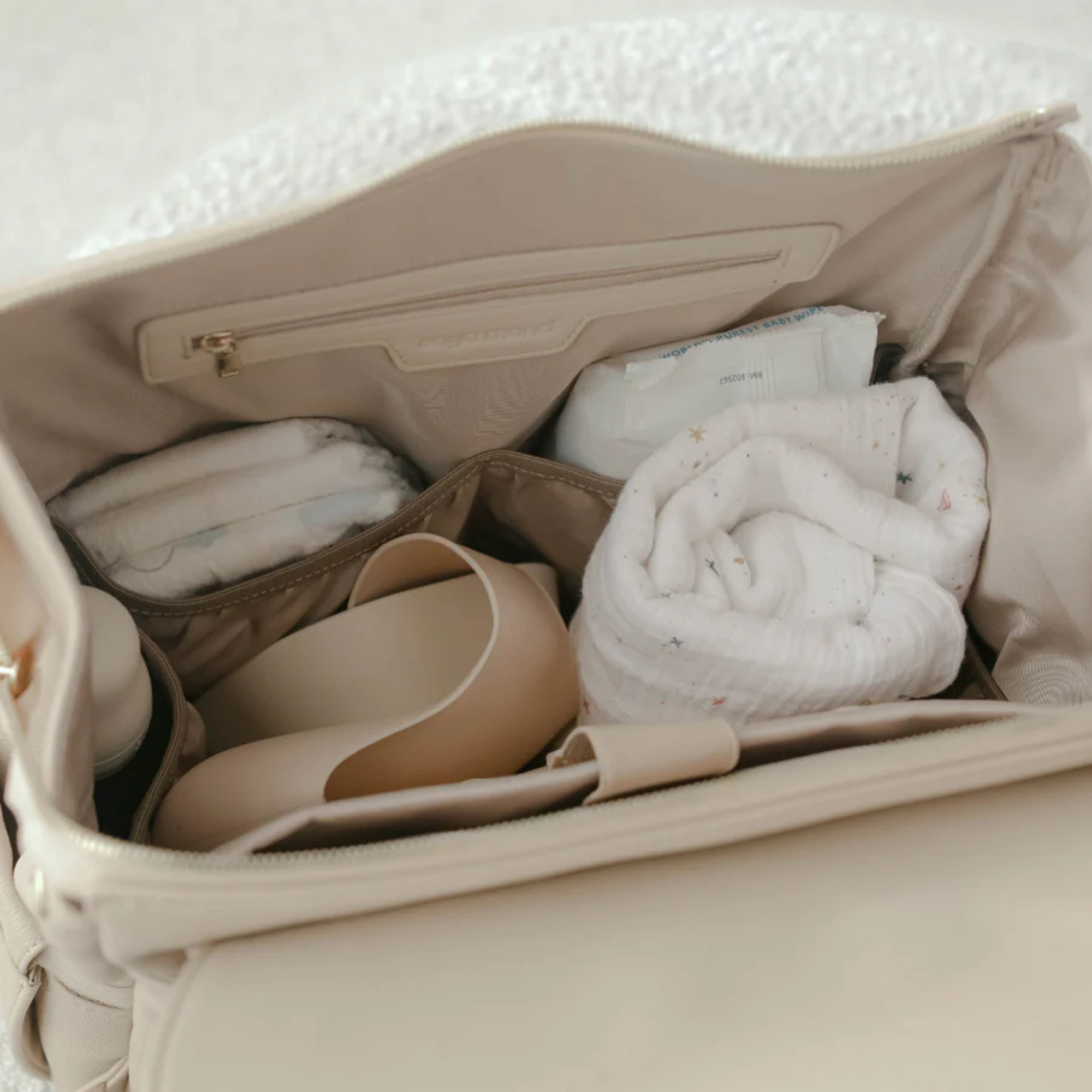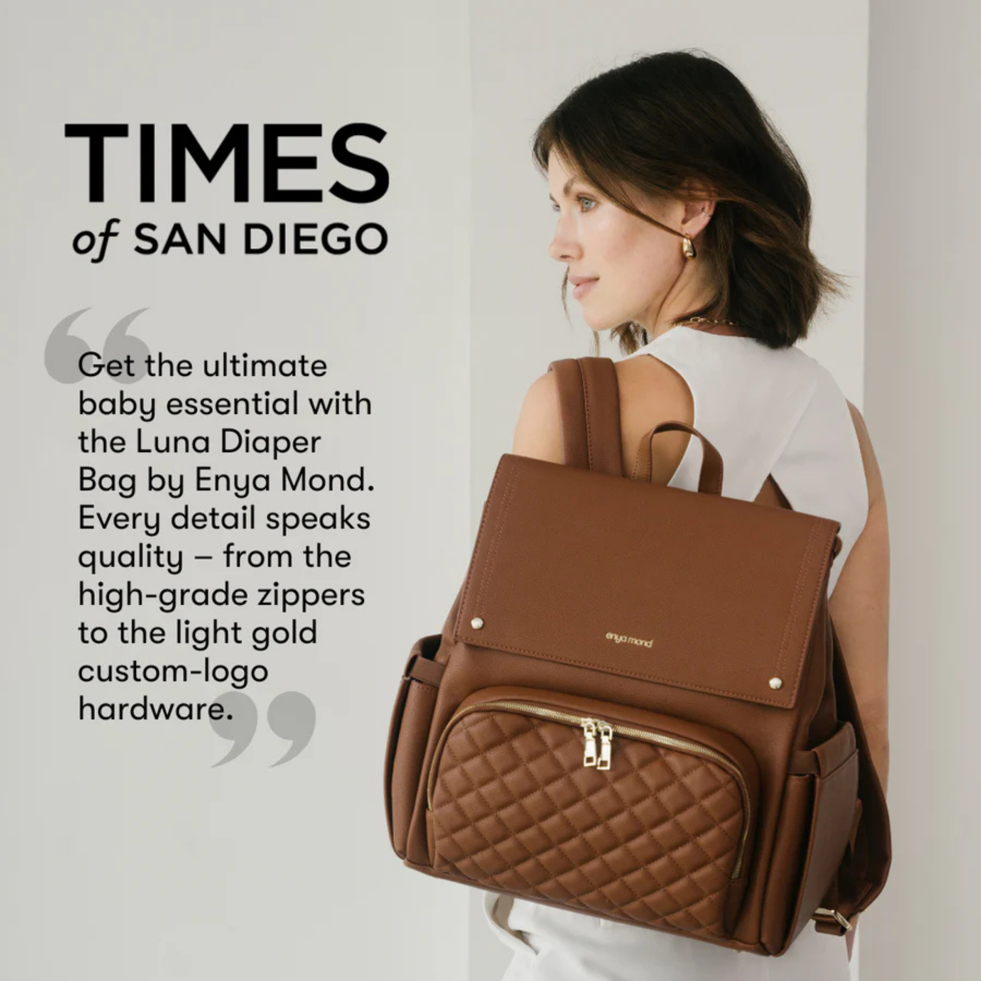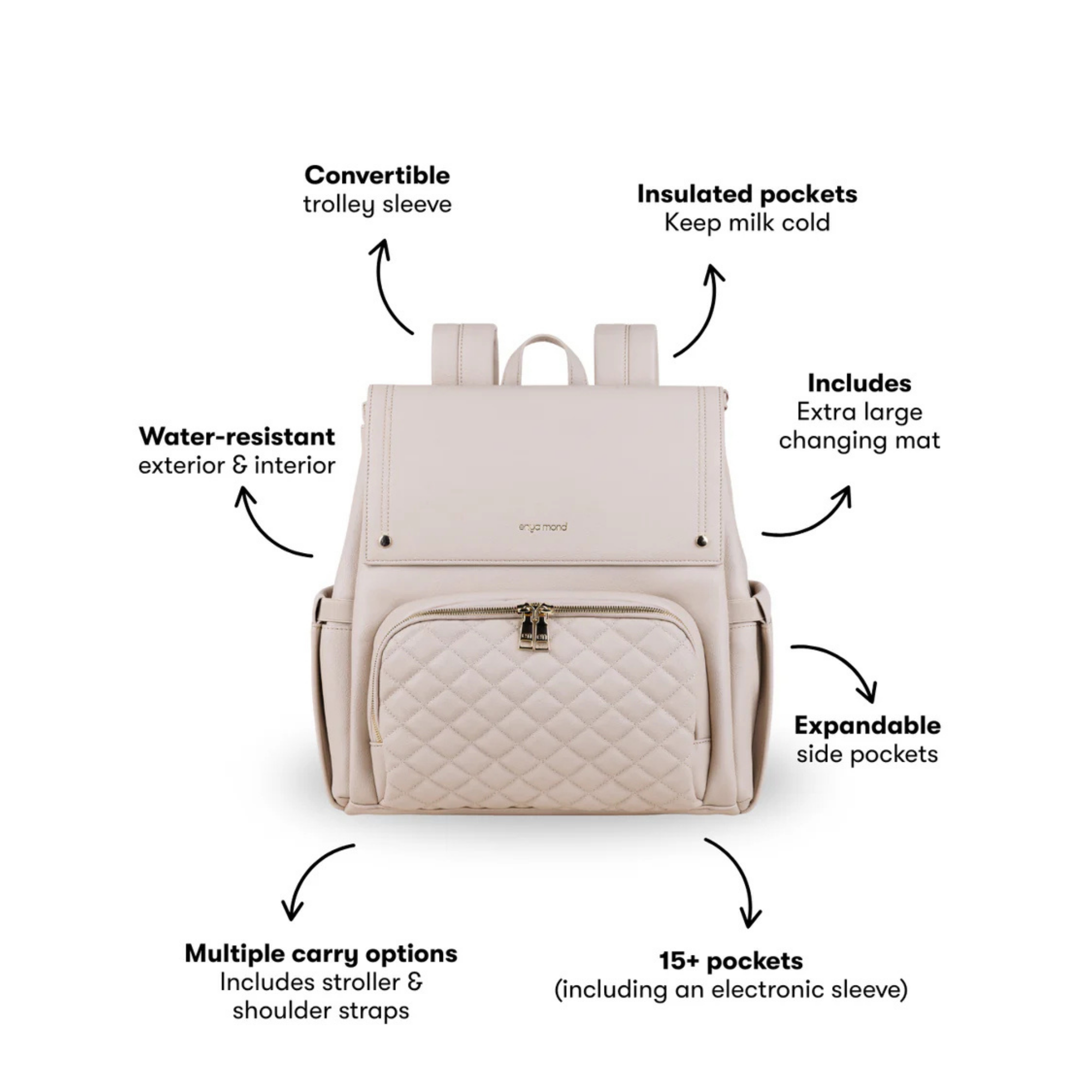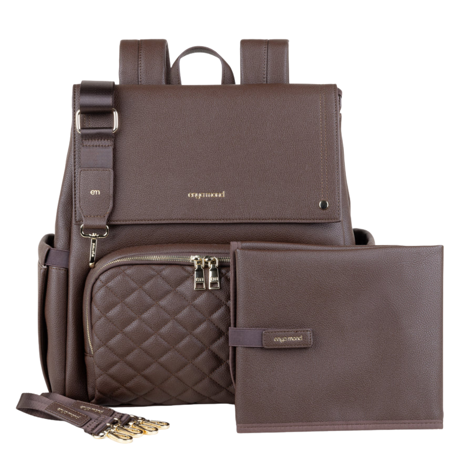 Confectionné en cuir végan haut de gamme à la finition grainée raffinée, le sac Luna respire l'élégance. Chaque détail témoigne de sa qualité, des fermetures éclair de qualité supérieure aux finitions dorées ornées du logo personnalisé. Et pour les petits accidents du quotidien ? Sa doublure imperméable vous protège efficacement.
