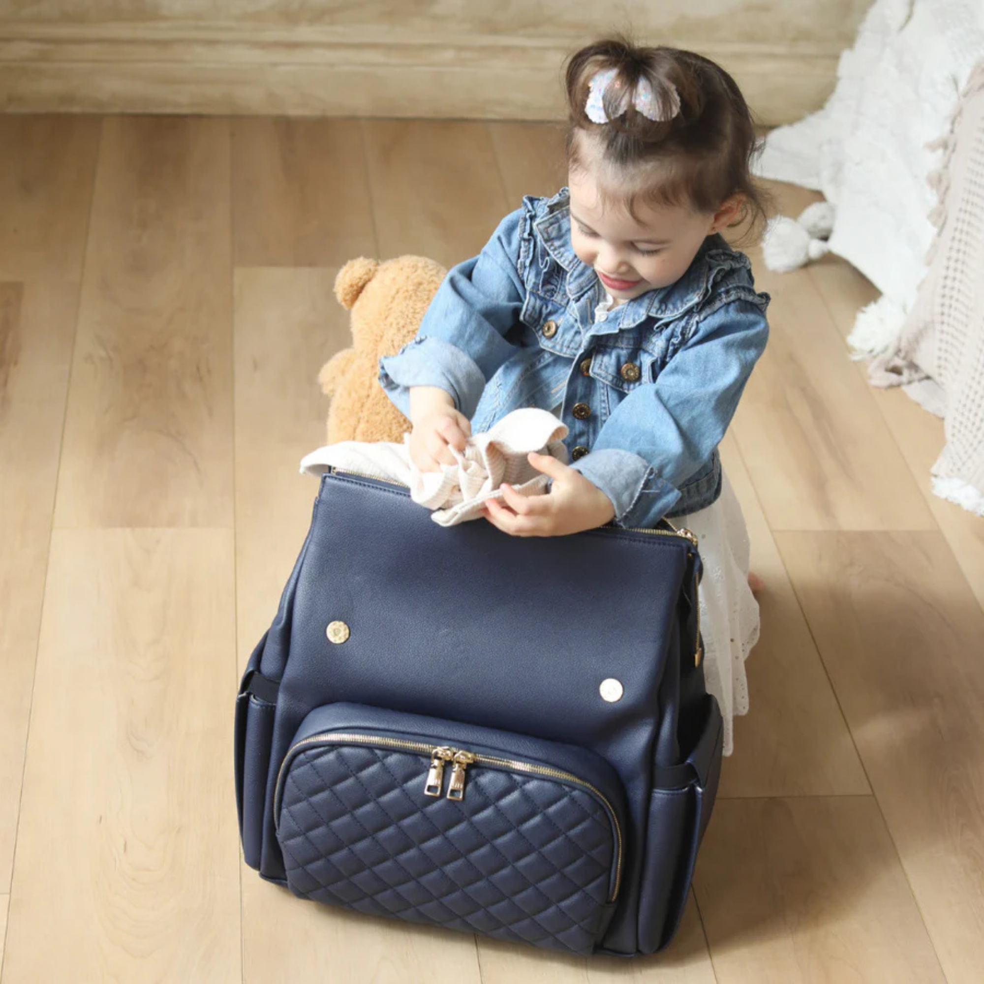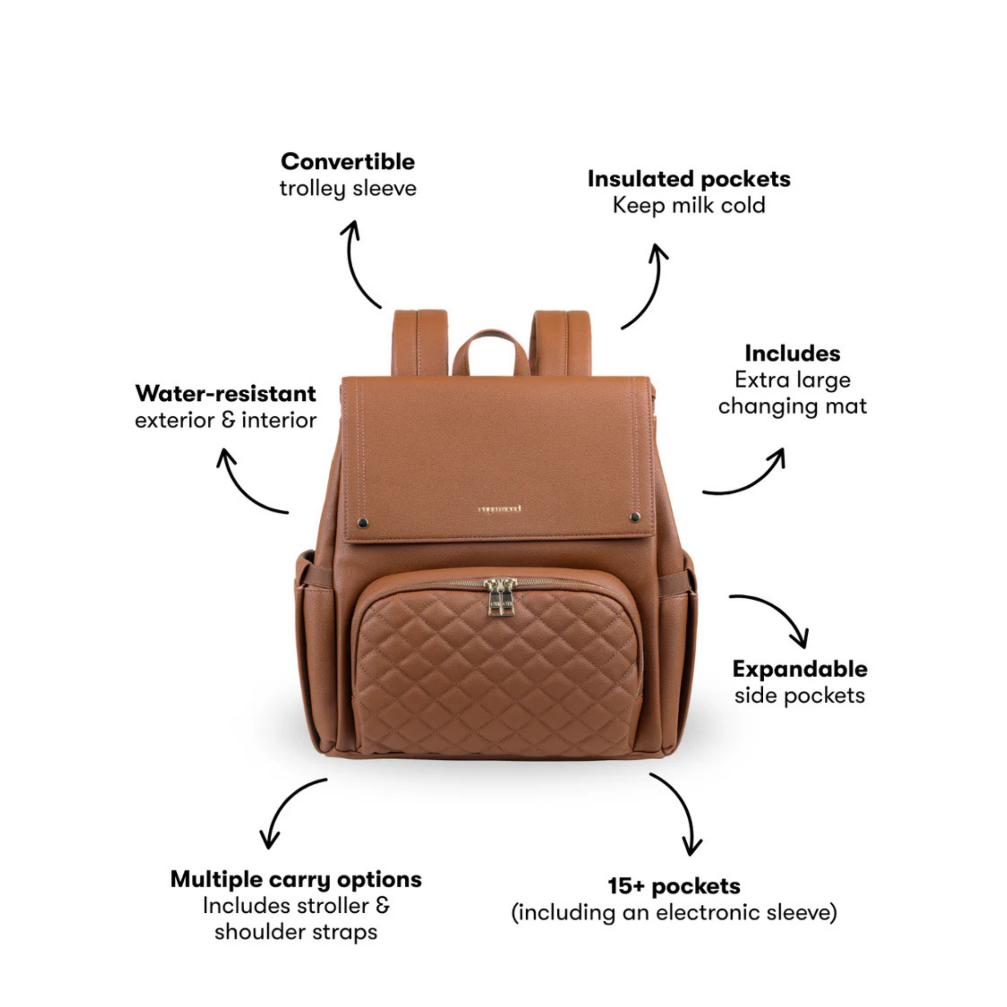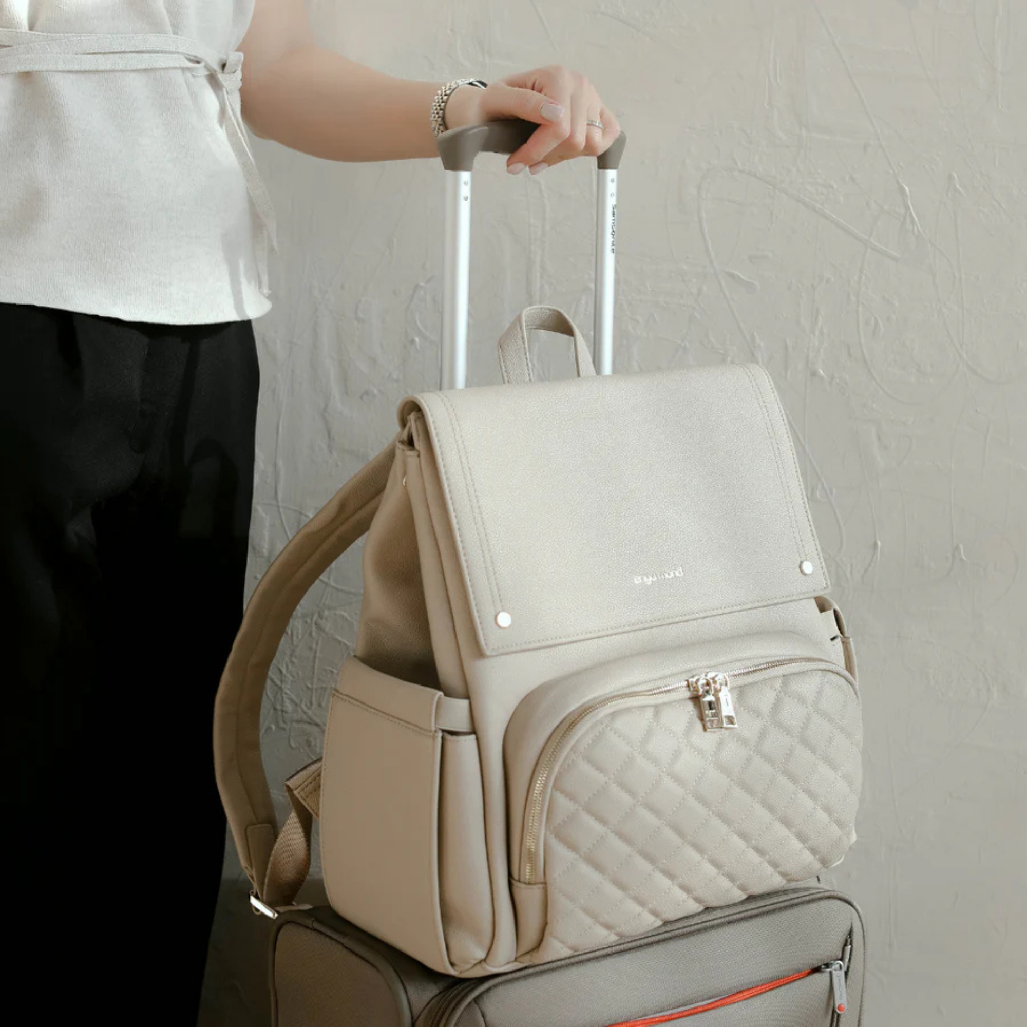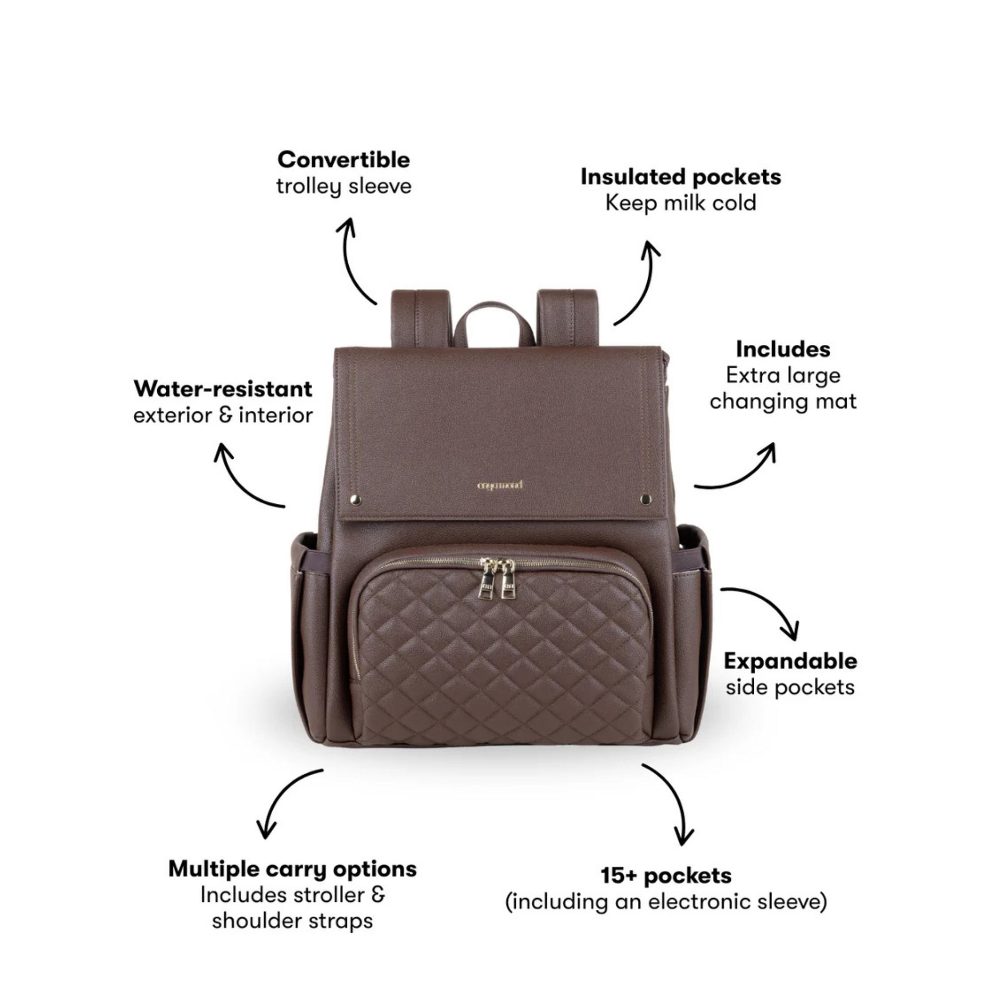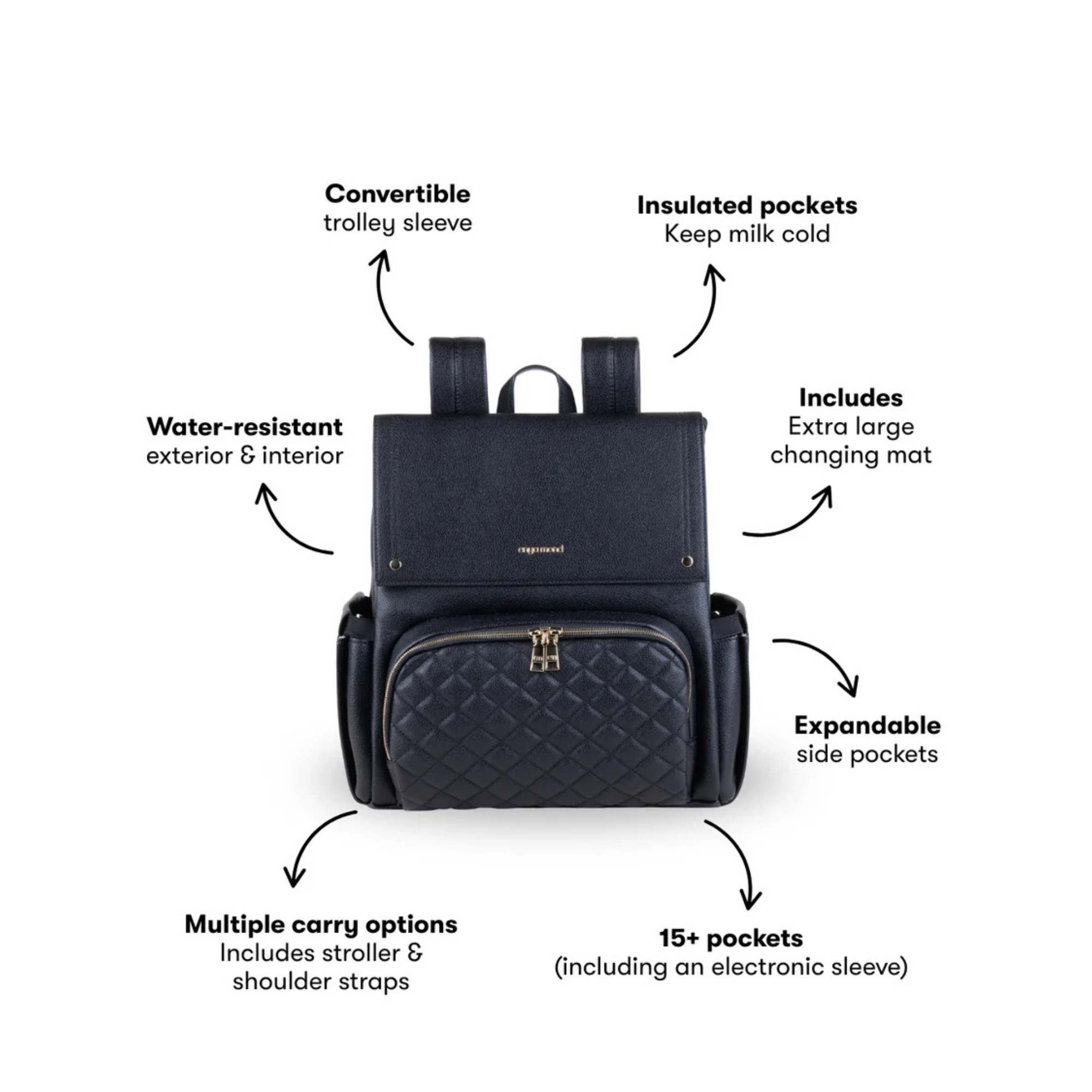 Confectionné en cuir végan haut de gamme à la finition grainée raffinée, le sac Luna respire l'élégance. Chaque détail témoigne de sa qualité, des fermetures éclair de qualité supérieure aux finitions dorées ornées du logo personnalisé. Et pour les petits accidents du quotidien ? Sa doublure imperméable vous protège efficacement.