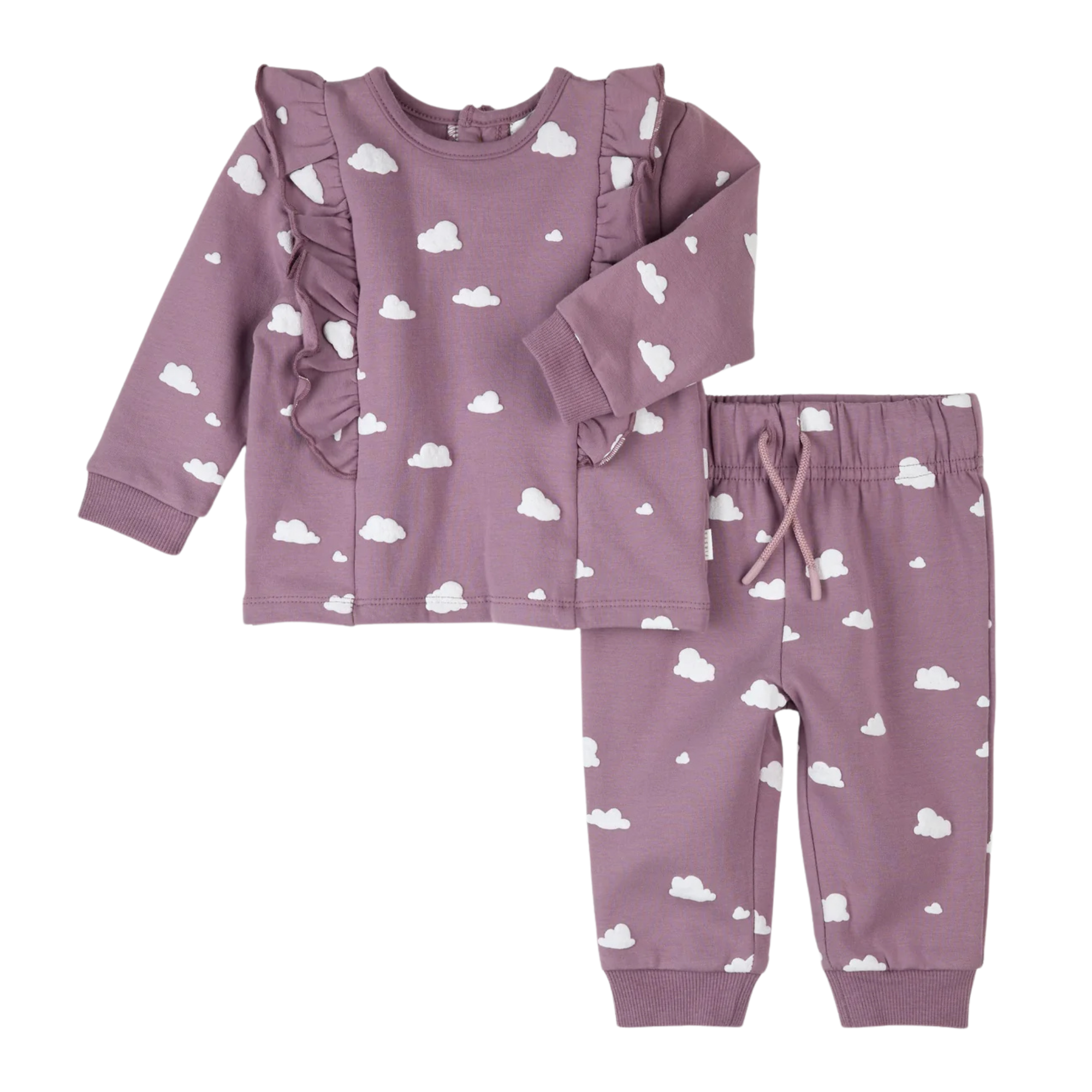 Cet ensemble en polaire de coton biologique est d'une douceur incomparable et vous garde bien au chaud et à l'aise pour toutes vos aventures. Il se compose d'un sweat-shirt à manches longues orné de volants et d'un pantalon de jogging assorti. Grâce à sa patte de boutonnage au dos et à sa taille élastiquée, le sweat-shirt est facile à enfiler et à retirer.