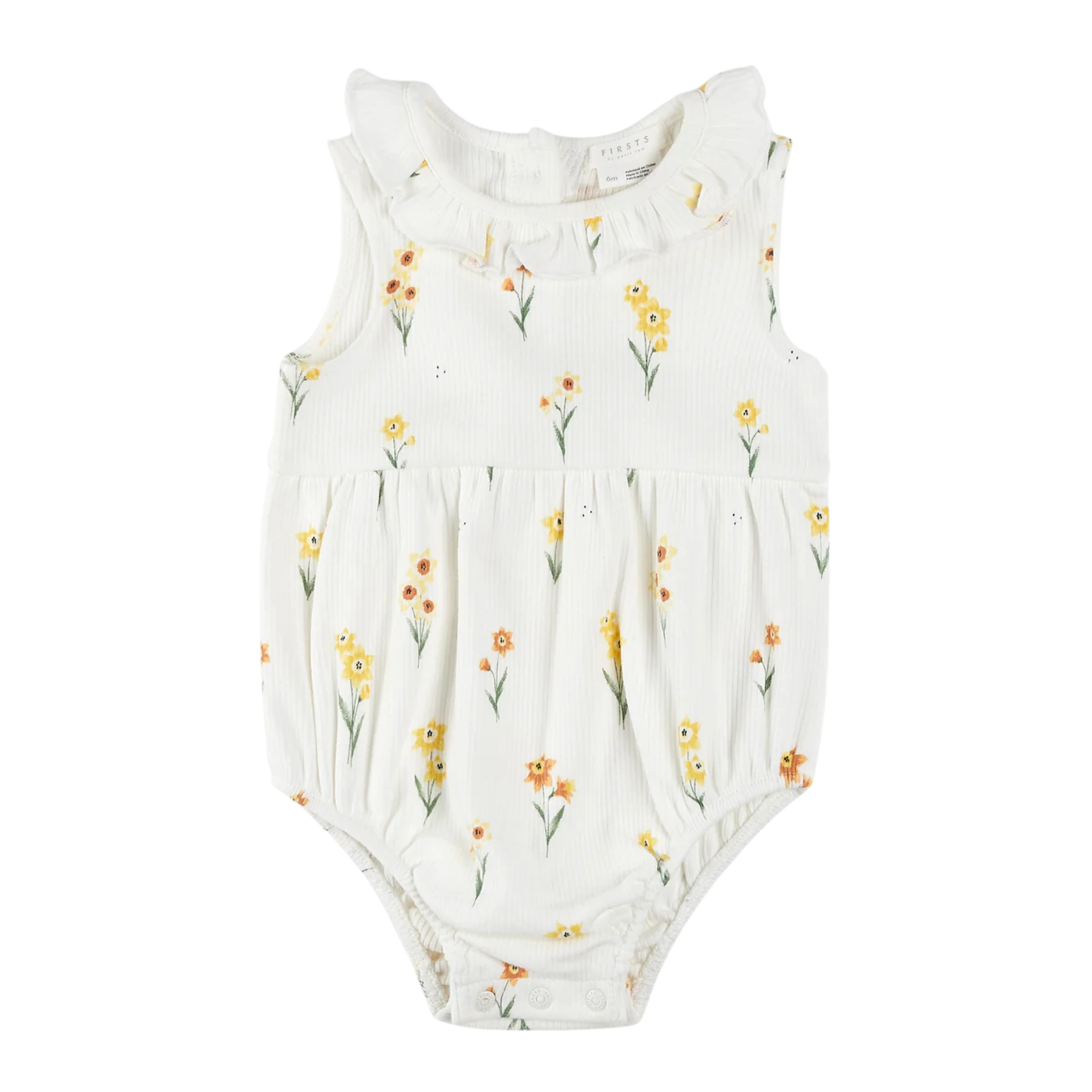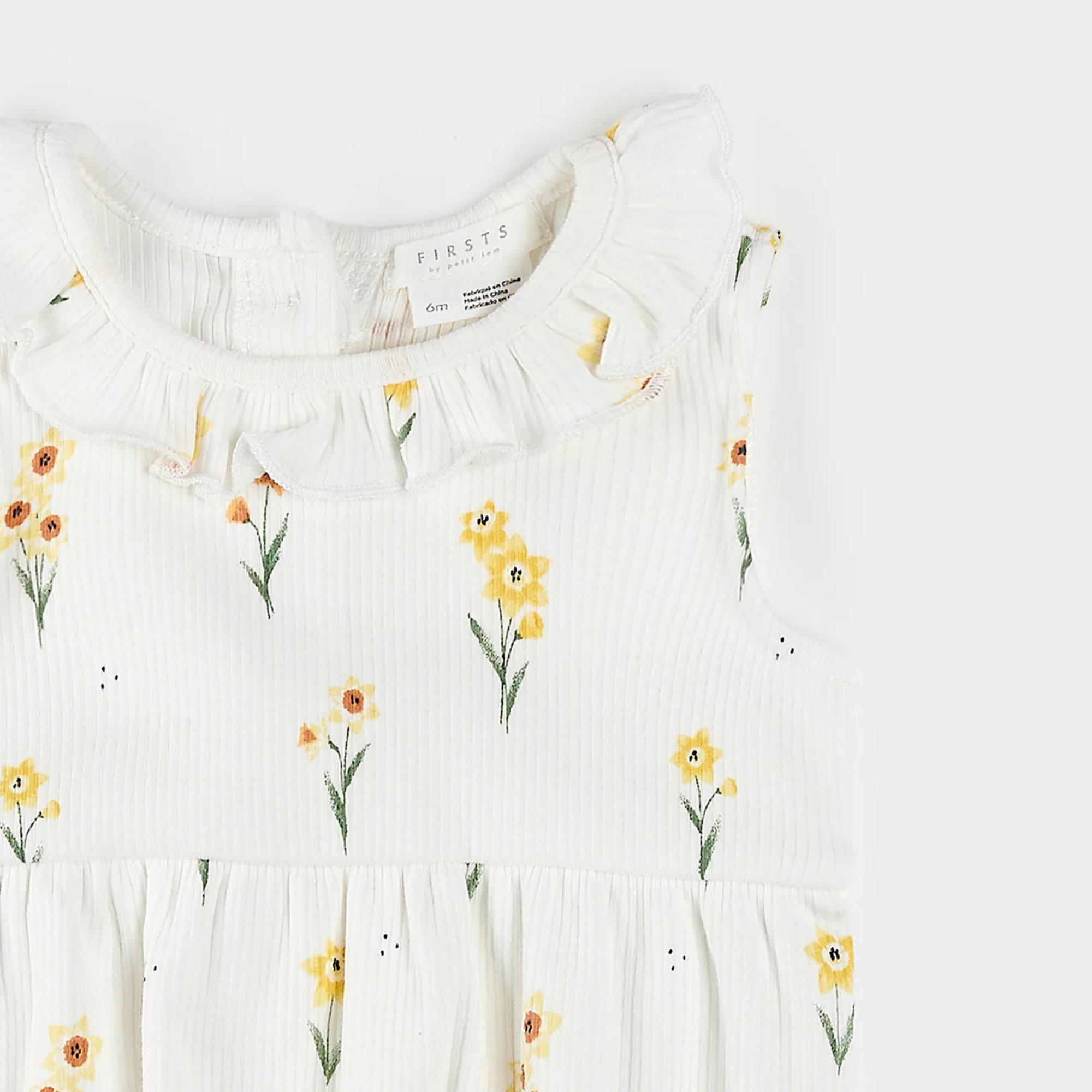 Idéal pour un pique-nique au parc, ce Cette jolie combinaison arbore la fleur de la saison et un décolleté à volants. L'élastique aux jambes crée une coupe ample qui laisse l'air circuler et la garde au frais. Fabriquée en coton côtelé issu de l'agriculture biologique . c'est léger et respirant mais peut être associé à un cardigan en tricot pointelle lorsque il y a Un léger frisson. La patte de boutonnage au dos et les boutons-pression en bas permettent de retirer la barboteuse par le haut ou par le bas tout en changeant les couches. un jeu d'enfant.