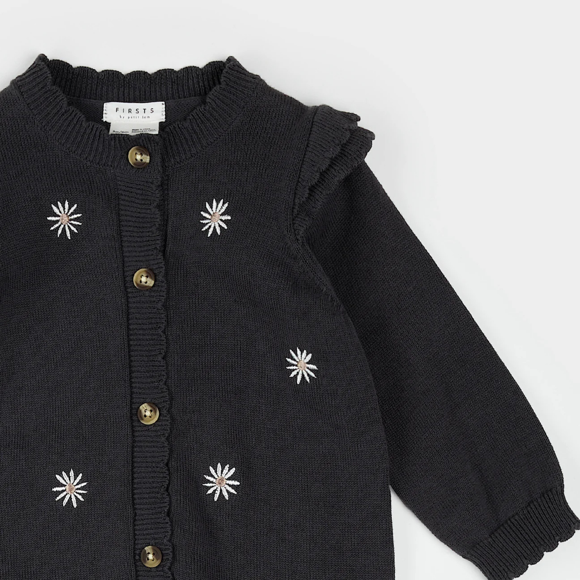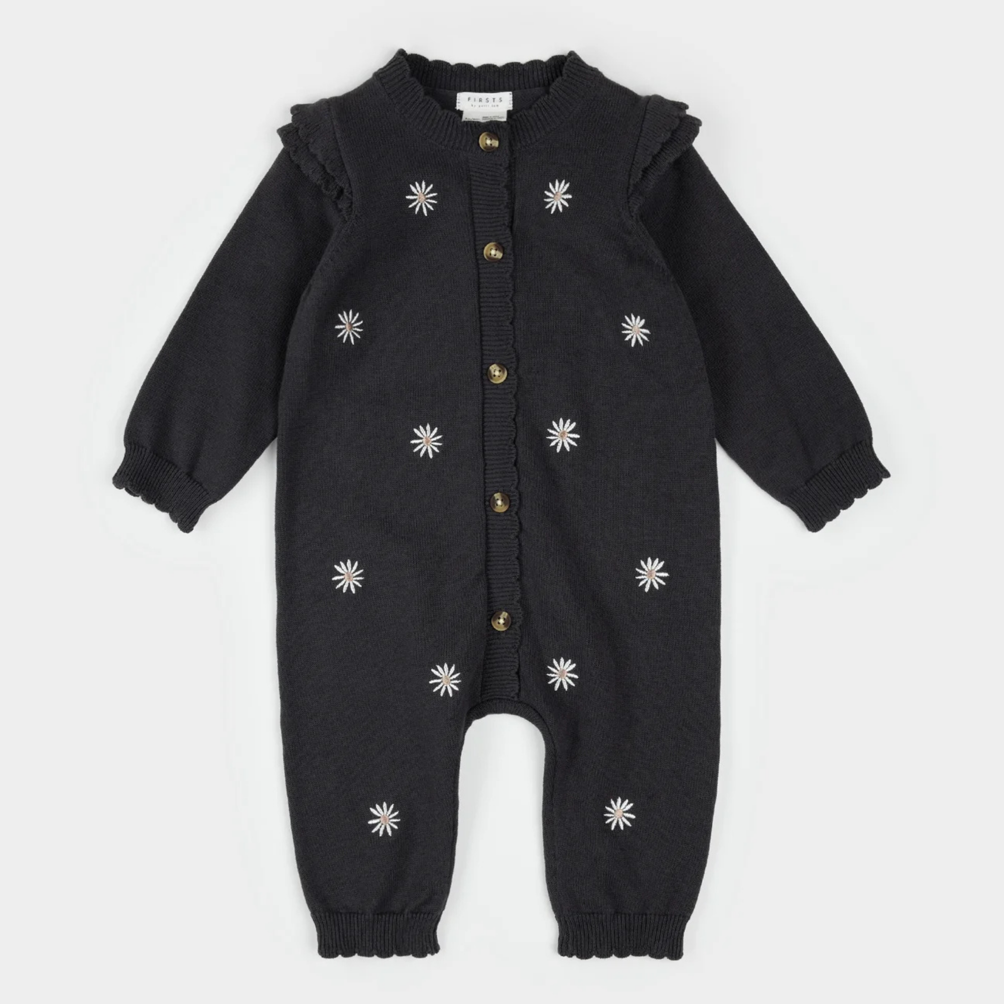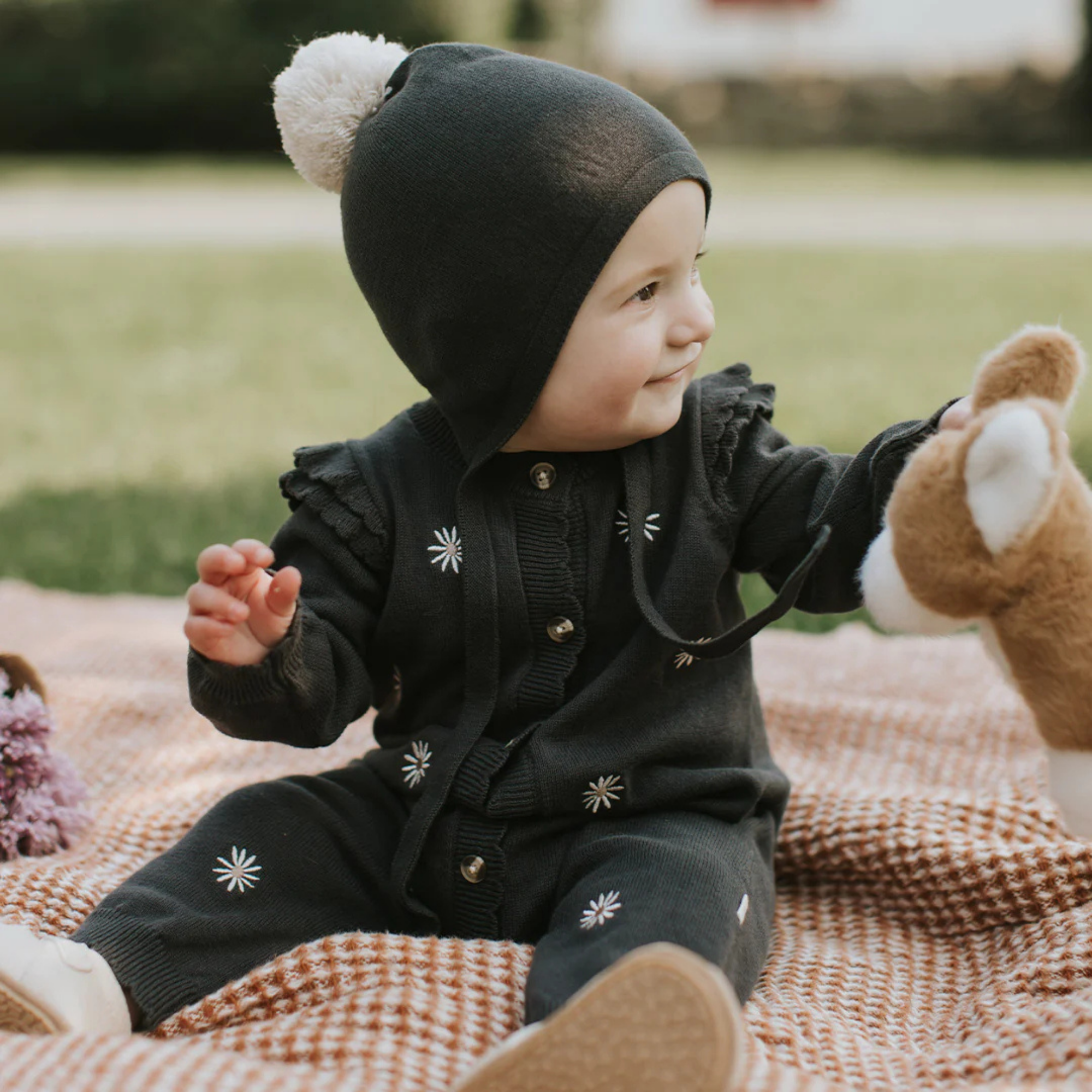 Cette combinaison en maille pull ornée de motifs marguerites est une pièce intemporelle à garder précieusement. Confectionnée en jersey de coton biologique doux, elle est confortable et douillette à porter toute la journée. Boutonnée sur le devant, elle s'enfile facilement et un bonnet assorti est disponible pour un style vintage adorable.