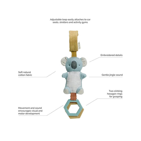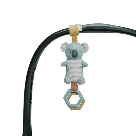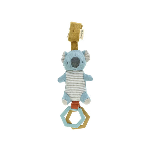 - Les jouets Koala, Panda et Lapin sont dotés d'anneaux qui tintent, d'un anneau de dentition doux, de rubans, d'un hochet et de tintements. Les jouets sont amovibles.