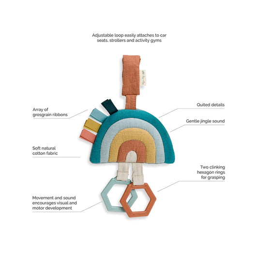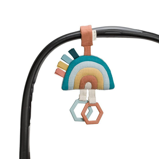 L'aventure vous attend ! L'heure du jeu devient encore plus douce avec le portique d'activités Ritzy Activity Gym™ de la collection Bitzy Bespoke™. Ce portique en bois haut de gamme et son tapis de jeu matelassé arc-en-ciel créent un espace de jeu confortable et moderne. Fabriqués en coton naturel, les jouets et le tapis de jeu sont ultra-doux pour la peau de bébé. Les adorables lapins, pandas et koalas amusent avec leurs textures et leurs sons, notamment un tintement, des cliquetis et un anneau de dentition doux, idéal pour attraper et attraper. Retirez facilement les adorables personnages pour les emporter partout avec vous !