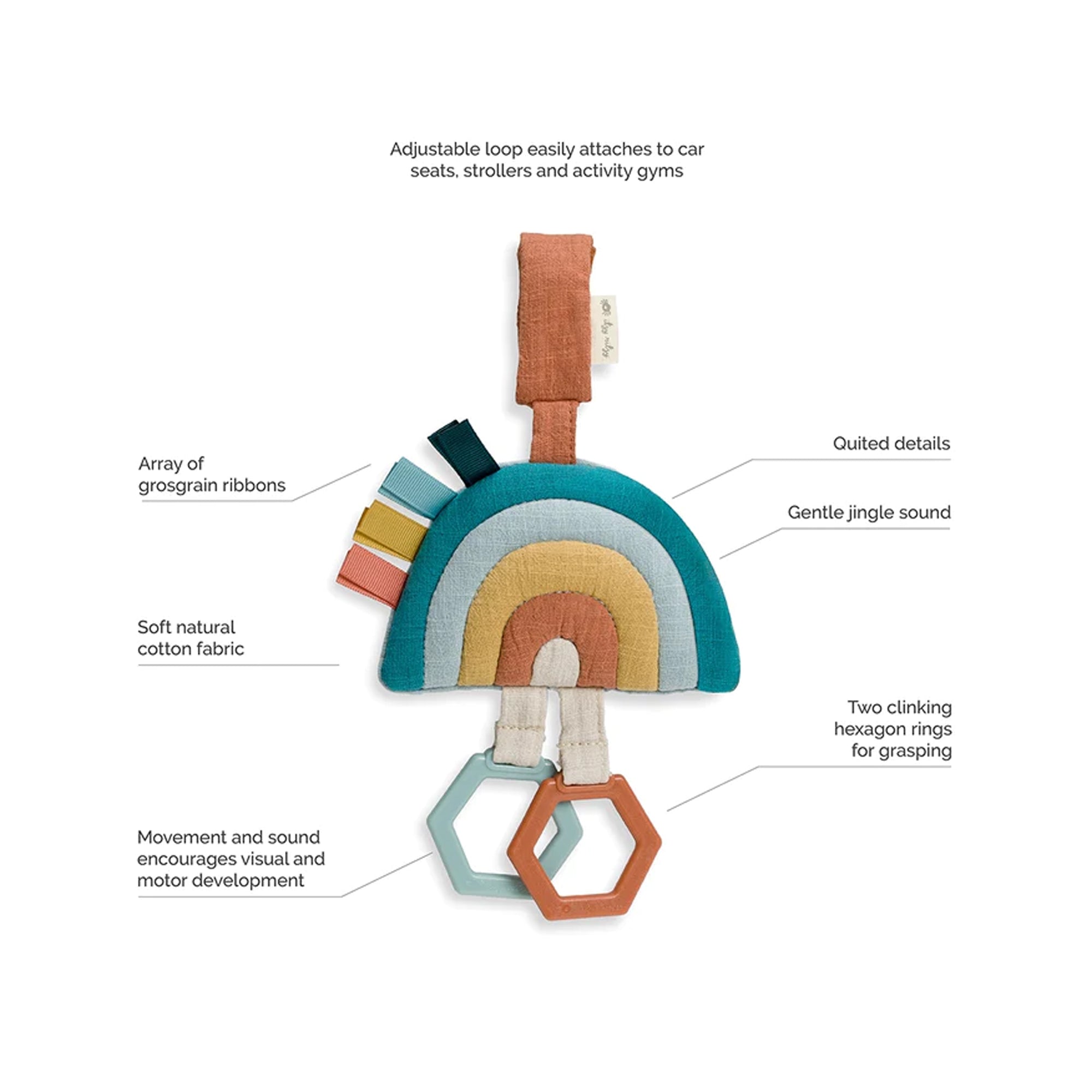 Partons à la découverte ! Notre Ritzy Jingle™, issu de notre collection Bitzy Bespoke, est le jouet ludique auquel votre tout-petit ne résistera pas ! Conçu pour stimuler les sens, ce jouet de voyage pour bébé est confectionné en coton naturel doux et doté d'une balle qui enveloppe bébé de son doux son. Anneaux et rubans suspendus créent différentes textures auxquelles votre bébé pourra s'accrocher lors de votre prochaine aventure. Que ce soit pour un road trip ou une promenade dans le quartier, attachez facilement le Ritzy Jingle à un siège auto ou à une poussette pour un plaisir en déplacement.