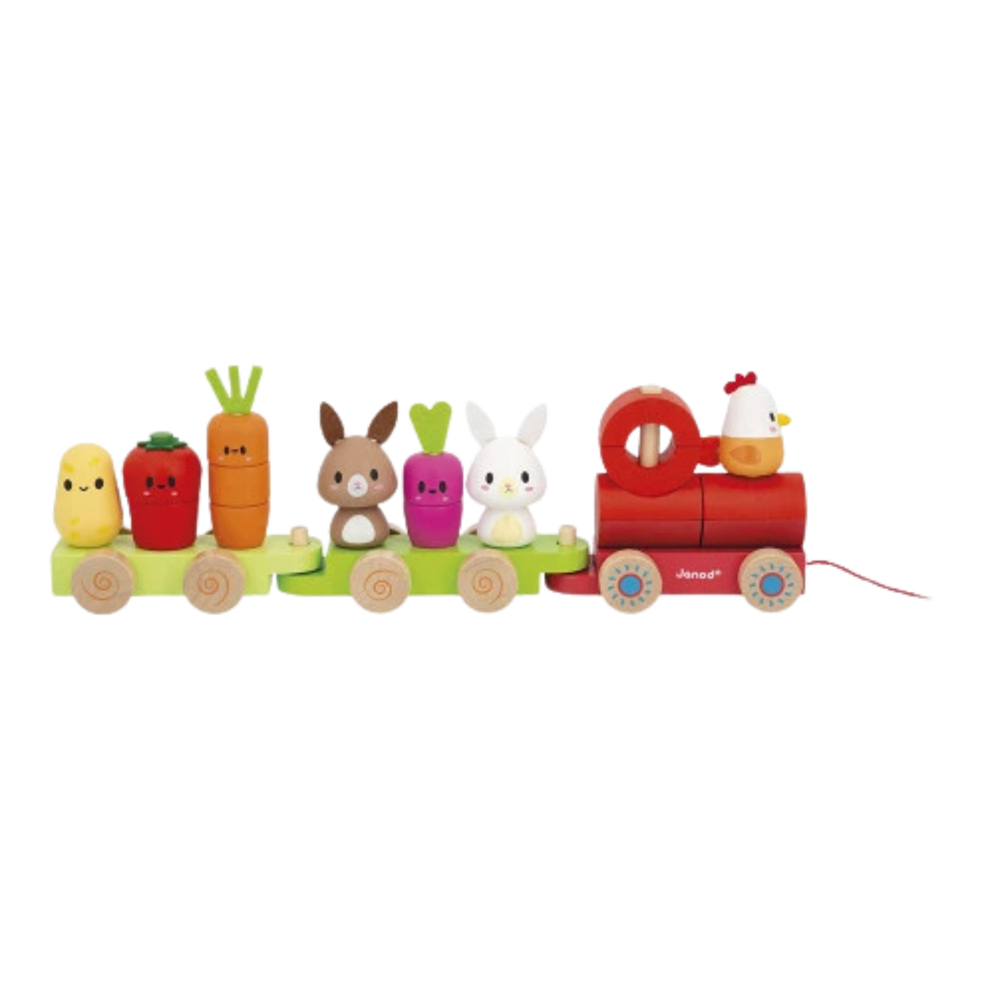 De la ferme au marché, le petit train vous emmène partout ! Dès 12 mois, votre bébé adorera son train à tirer. Avec ses 3 wagons et ses 19 pièces à assembler, ce train en bois est à la fois un jeu de construction et un jouet à tirer qui encourage le mouvement. Empiler les pièces ou faire un tour : pourquoi choisir si on peut faire les deux ? Dans l'univers ludique et coloré de la ferme, bébé sera ravi de découvrir des petits animaux (un lapin blanc, un lapin brun et une petite poule), ainsi que des légumes rigolos (pomme de terre, tomate, carotte et radis). Agrémentés de feutrine pour favoriser la découverte tactile, les animaux et les légumes sont à tomber ! Certains personnages sont constitués d'une seule pièce, jusqu'à 3 pièces pour la carotte et 6 pièces pour la locomotive. Leur taille a été spécialement conçue pour les petites mains. L'activité phare de ce jouet d'éveil est la motricité ! Tout d'abord la motricité fine, grâce à l'assemblage des pièces et des personnages, tous amovibles. Puis, en grandissant, il pourra partir à l'aventure avec son train en bois pour développer sa motricité globale. Pas de doute, l'univers de la ferme réserve bien des surprises à bébé ! Le train en bois mesure 42 x 7 x 14 cm et la ficelle qui le fait avancer mesure 50 cm. Ce jouet premier âge est fabriqué en bois issu de forêts gérées durablement, certifié FSC™. Le train de bébé, en route pour la ferme, entrera en gare sur la voie J !