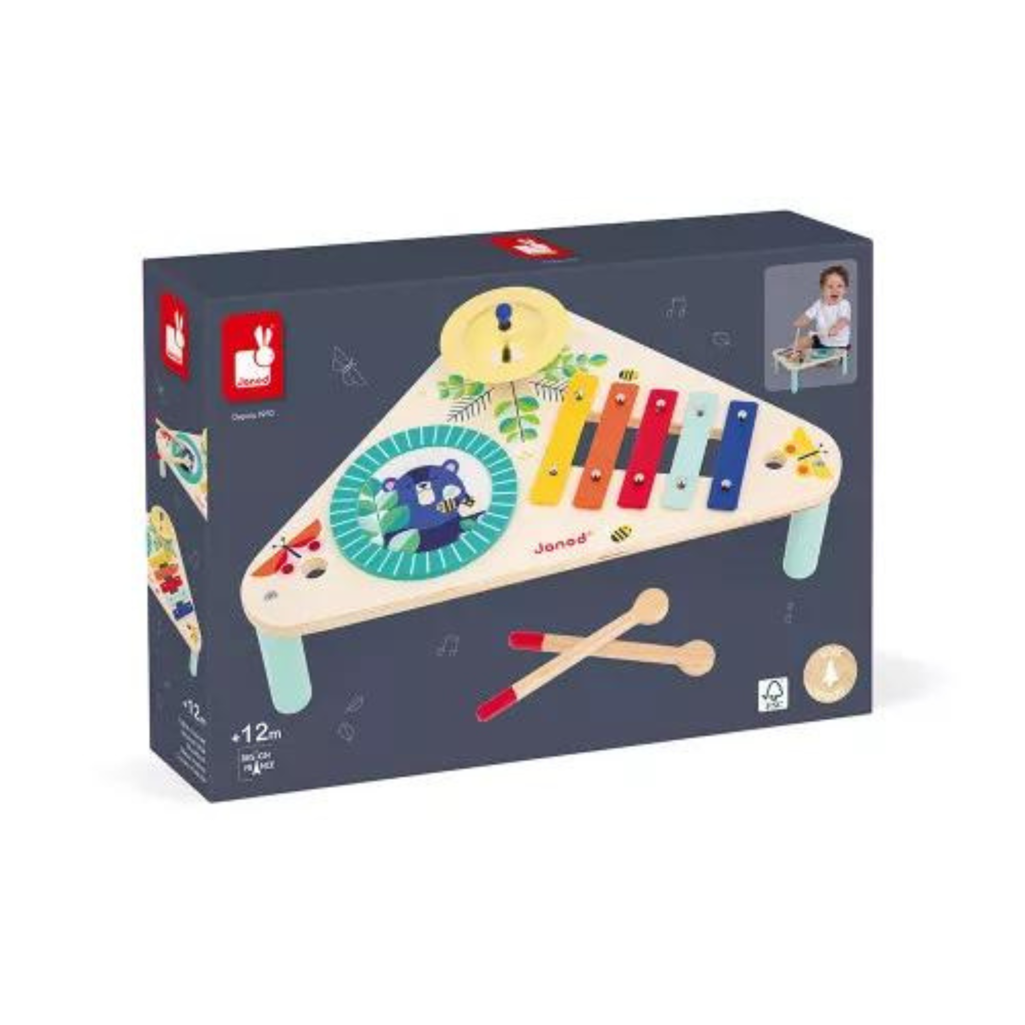 Laissez libre cours à votre imagination ! Plongez dans un monde de sons et de rythmes avec notre table musicale en bois pour bébés dès 12 mois. Ce jouet d'éveil musical est un véritable orchestre à portée de main. Il comprend 3 instruments : un tambour, une cymbale et un xylophone en métal à cinq tons. Chaque instrument initiera les tout-petits à la musique et leur permettra de découvrir le monde des sons de manière ludique et interactive. De plus, cette table musicale est dotée d'un espace de rangement intégré pour les baguettes, évitant ainsi tout risque de perte. Imaginez le visage joyeux de votre enfant lorsqu'il tient les deux baguettes fournies et explore les différents sons produits par chaque instrument. Chaque battement de tambour, chaque carillon de cymbale ou chaque son de xylophone est une nouvelle aventure musicale. En bref, notre table musicale en bois pour enfants est bien plus qu'un simple jouet d'éveil. L'exploration musicale est au rendez-vous, car elle ouvre les portes d'un univers de sons et de rythmes adaptés aux bébés. Prenez le temps de montrer à votre enfant toutes les jolies illustrations de la table d'activités : les abeilles, les papillons et leur nouvel ami, l'ours ! Alors, prêt à embarquer pour une aventure musicale ? Ce jouet sonore fait partie de notre gamme Gioia : un éveil musical joyeux attend les petits qui découvriront de nombreux sons de manière ludique et axée sur le partage. Jouet en bois certifié FSC™.