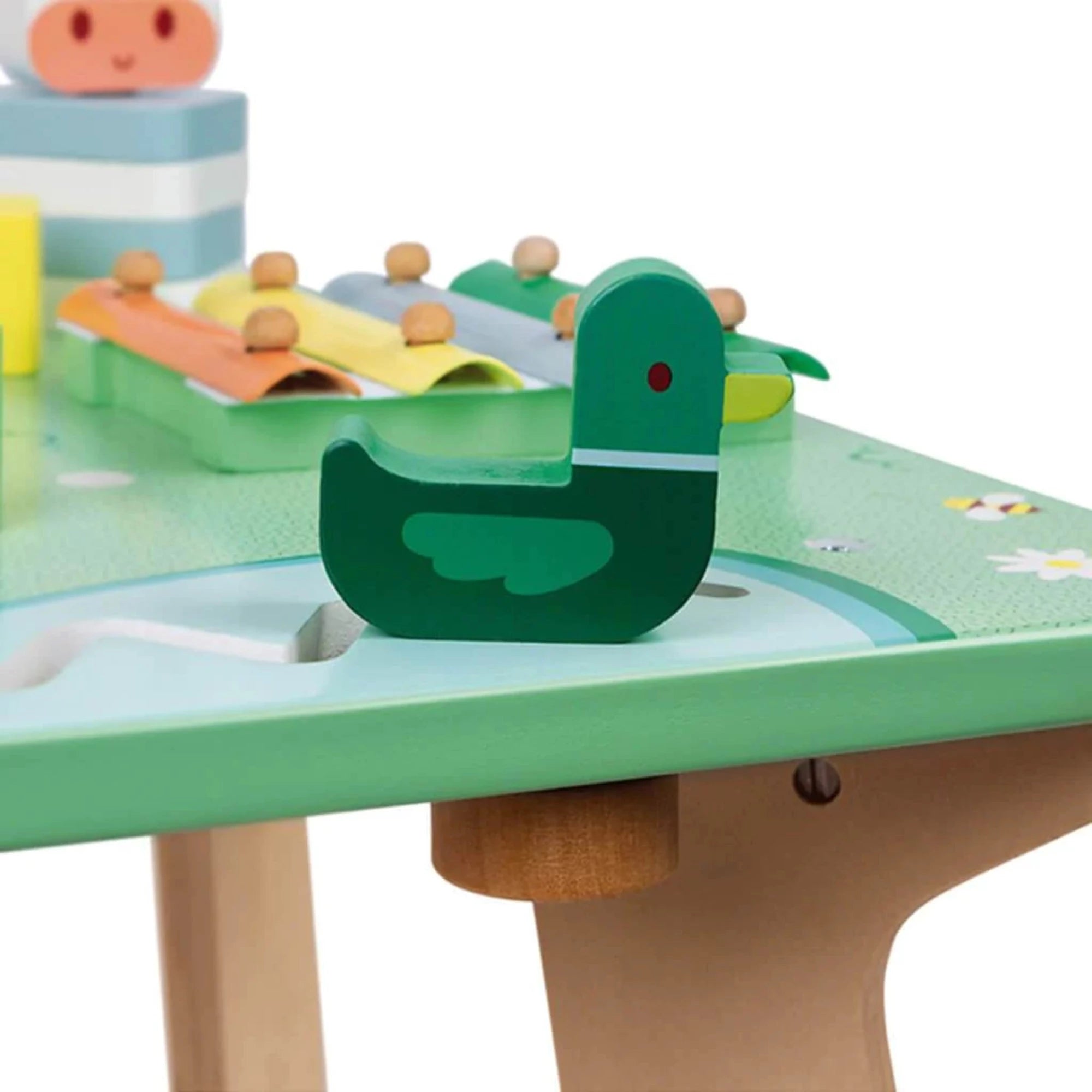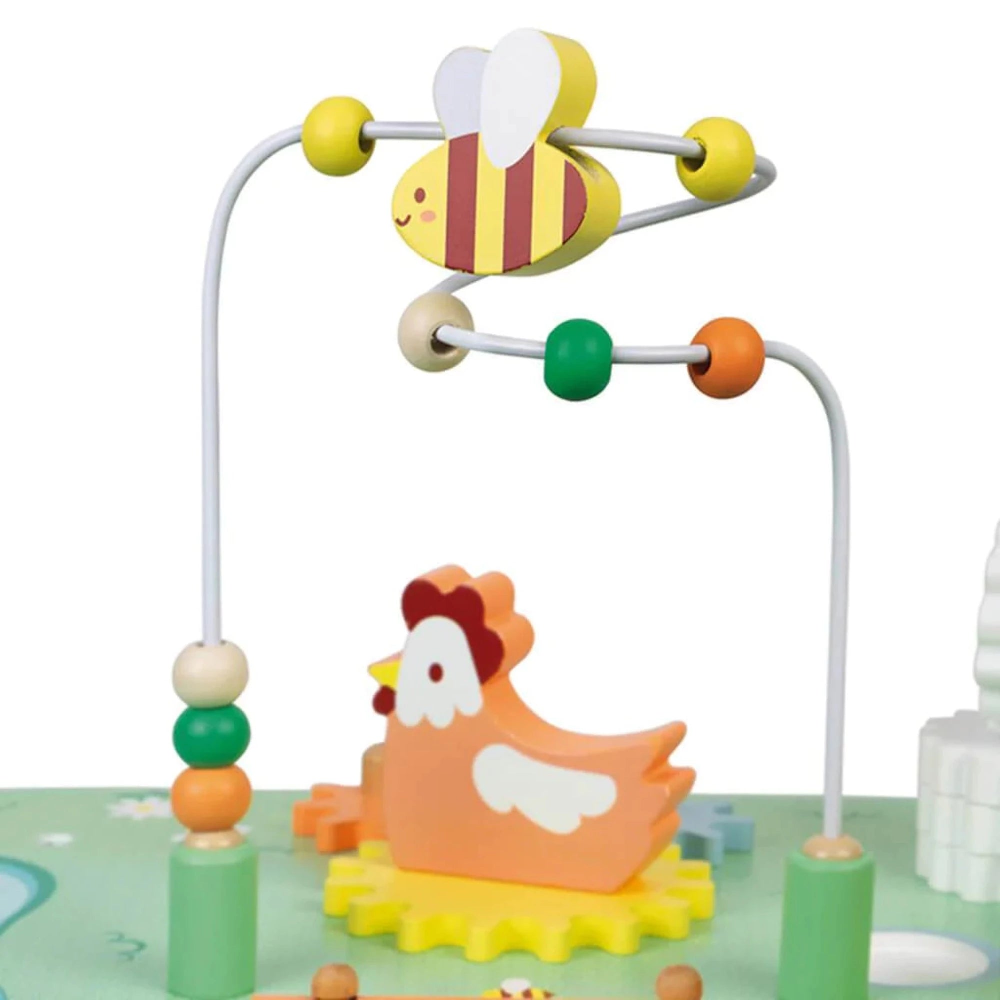 Direction la campagne et ses champs de fleurs sauvages avec cette table multi-activités, à l'effigie des animaux de la ferme préférés de bébé ! À vous de jouer et de faire découvrir à votre enfant les 7 activités de cette table polyvalente : 2 animaux empilables de 2 façons différentes pour développer sa motricité ; un labyrinthe avec un canard qui se promène autour de son étang, conçu pour renforcer la coordination œil-main ; un engrenage que bébé peut faire tourner pour apprendre le lien de cause à effet ; 3 cubes encastrés pour apprendre les formes ; un boulier pour développer la concentration et un xylophone en métal à 2 maillets pour développer ses talents musicaux ! Cette table d'éveil accompagnera les enfants de 12 mois et plus de découvertes en découvertes dans un environnement qu'ils adoreront ! Hauteur de la table : 32 cm. Peinture à l'eau.