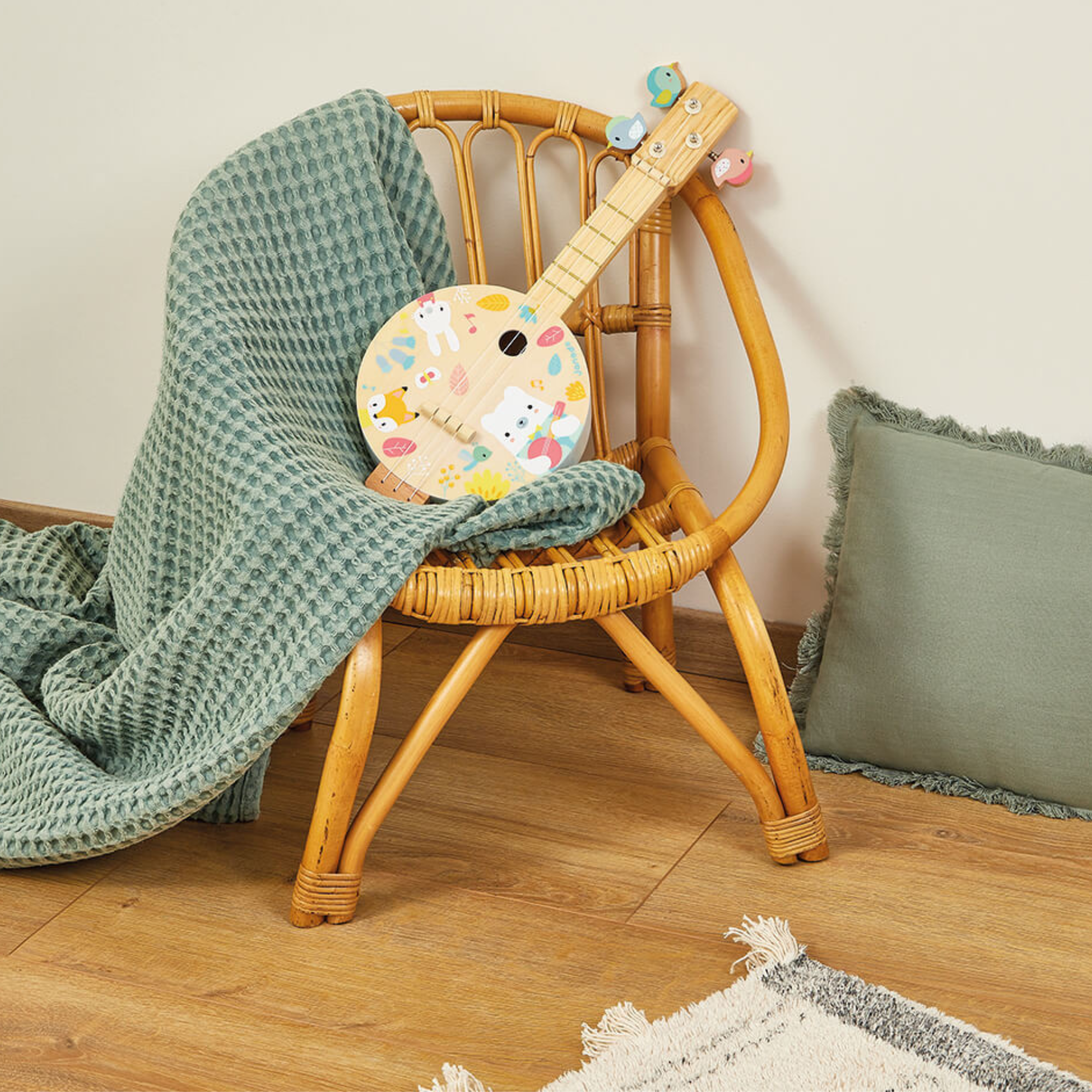 Tout pour la musique ! Ce joli banjo en bois aux motifs d'animaux de la forêt est adapté aux petites mains des enfants dès 3 ans.
