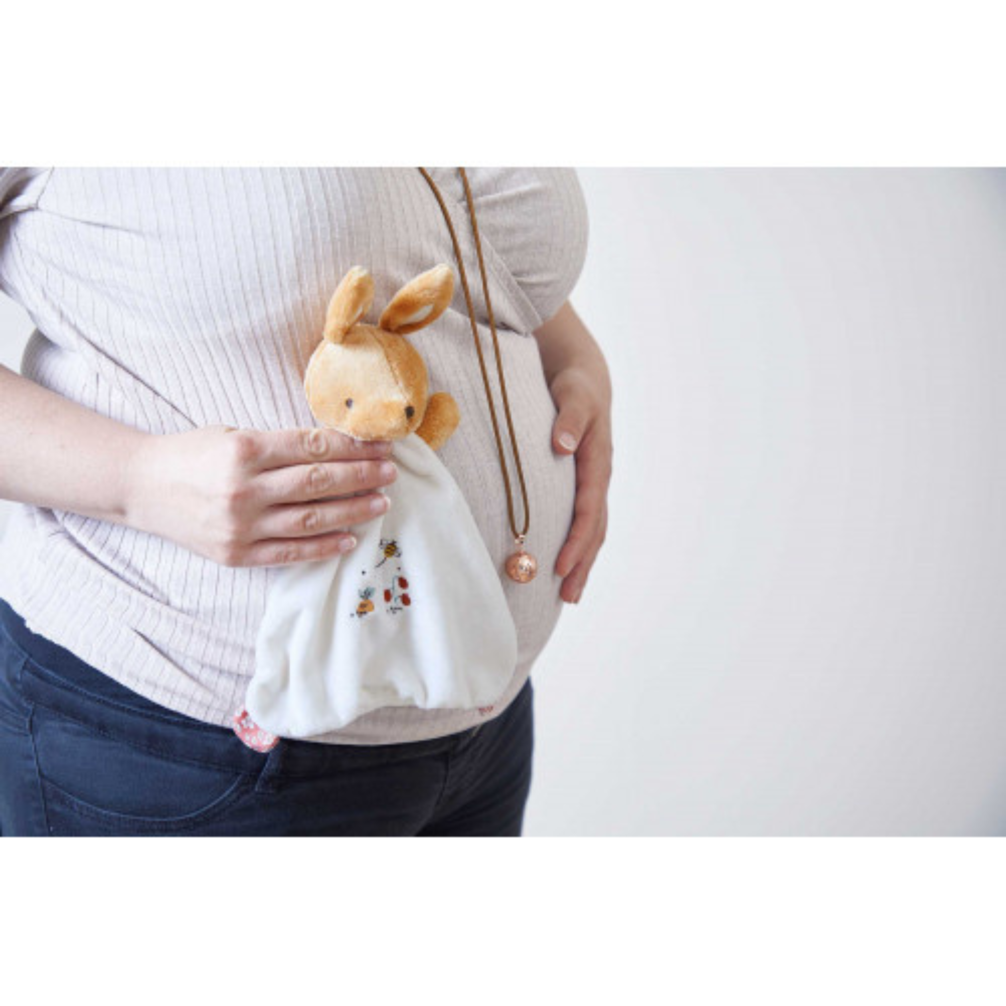 Le coffret naissance à offrir dès la grossesse ! Sur le thème de la comptine « Mon petit lapin », il se compose d'un magnifique collier bola pour la maman et d'un adorable doudou lapin avec bola intégré à la tête pour bébé. Dès la grossesse, rassurez et éveillez bébé aux sons en optant pour ce bijou traditionnel originaire d'Indonésie et d'Amérique latine, aussi appelé « l'appel des anges ». Porté par les femmes enceintes, le bola est synonyme de protection pour la mère et l'enfant, de paix et d'harmonie, grâce au doux tintement qu'il émet. Dès les premiers instants in utero de bébé, il sera réconforté par le son cristallin du bola roulant sur le ventre arrondi de sa maman. Le bola présent dans ce coffret mesure de 45 à 70 cm de long et se compose d'un collier en daim ainsi que d'un pendentif en laiton, couleur or rose (diamètre 2 cm). À conserver dans un endroit sec, entretien par essuyage à sec en surface uniquement. À la naissance, bébé trouve du réconfort dans son doudou lapin qui produit le même son, créant un lien continu et un cocon de douceur. En plus d'être rassuré, bébé s'éveille aux sons dans un environnement stimulant et sécurisant. Le doudou lapin mesure 24 cm et est décoré d'une broderie sur le ventre illustrant la comptine « Mon petit lapin ». Les matériaux utilisés pour la composition de ce doudou ont été soigneusement choisis : 76 % de matériaux recyclés, rembourrage compris. Le doudou lapin est lavable en machine à 30 °C. Tous ces produits dédiés à l'apaisement et à l'éveil de bébé sont présentés dans un joli coffret cadeau personnalisable, grâce à l'insert disponible sous le couvercle. Ce coffret bola et doudou lapin fait partie de la collection Petites Chansons de Kaloo : une gamme dédiée à l'éveil aux sons, développée avec une équipe de psychomotriciens et composée d'une variété de sons pour stimuler bébé.