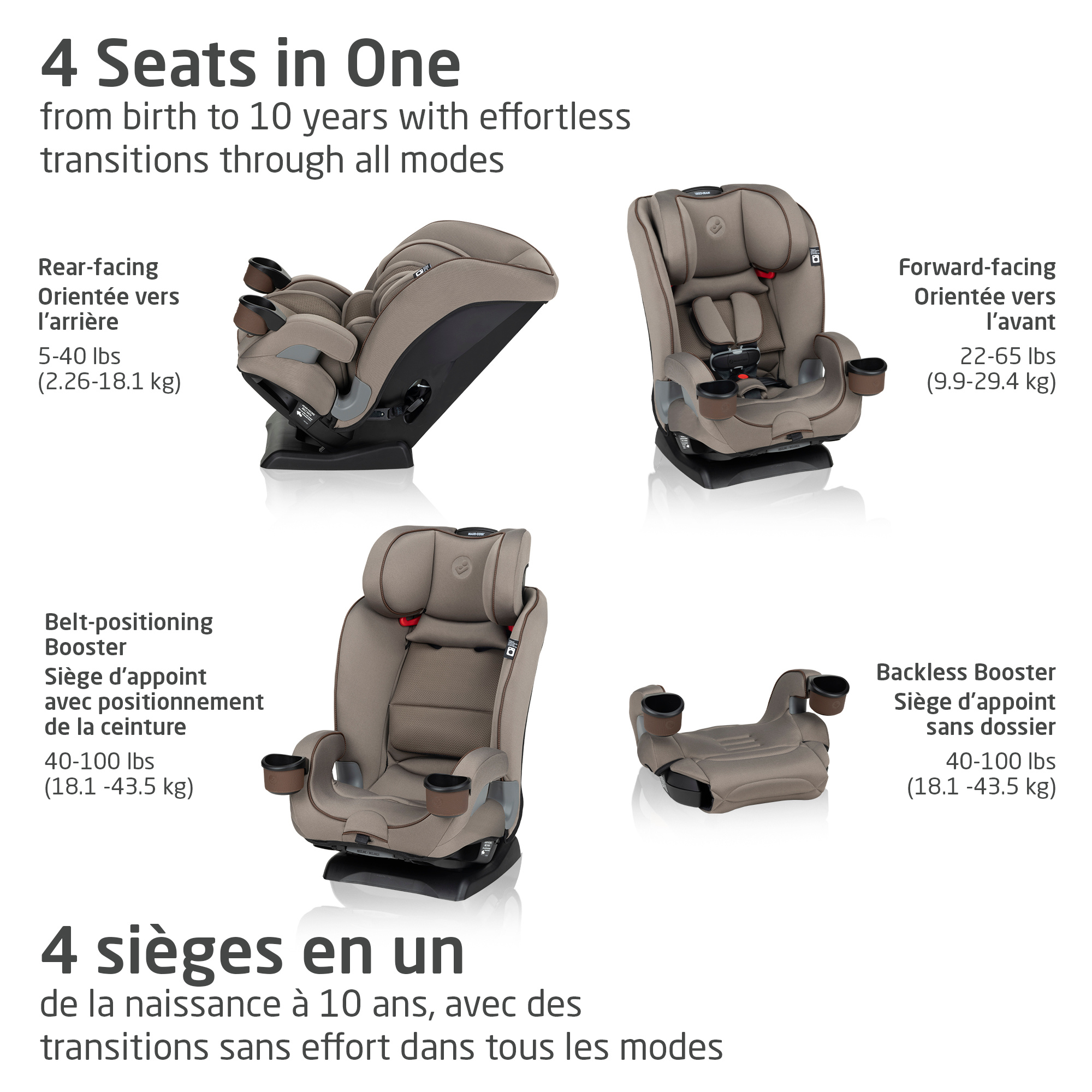 - 4 PLACES EN UNE : De la naissance à 10 ans avec des transitions sans effort à travers tous les modes, y compris orienté vers l'arrière (5 à 40 lb), orienté vers l'avant (22 à 65 lb), rehausseur de positionnement de ceinture (40 à 100 lb) et rehausseur sans dossier (40 à 100 lb).
