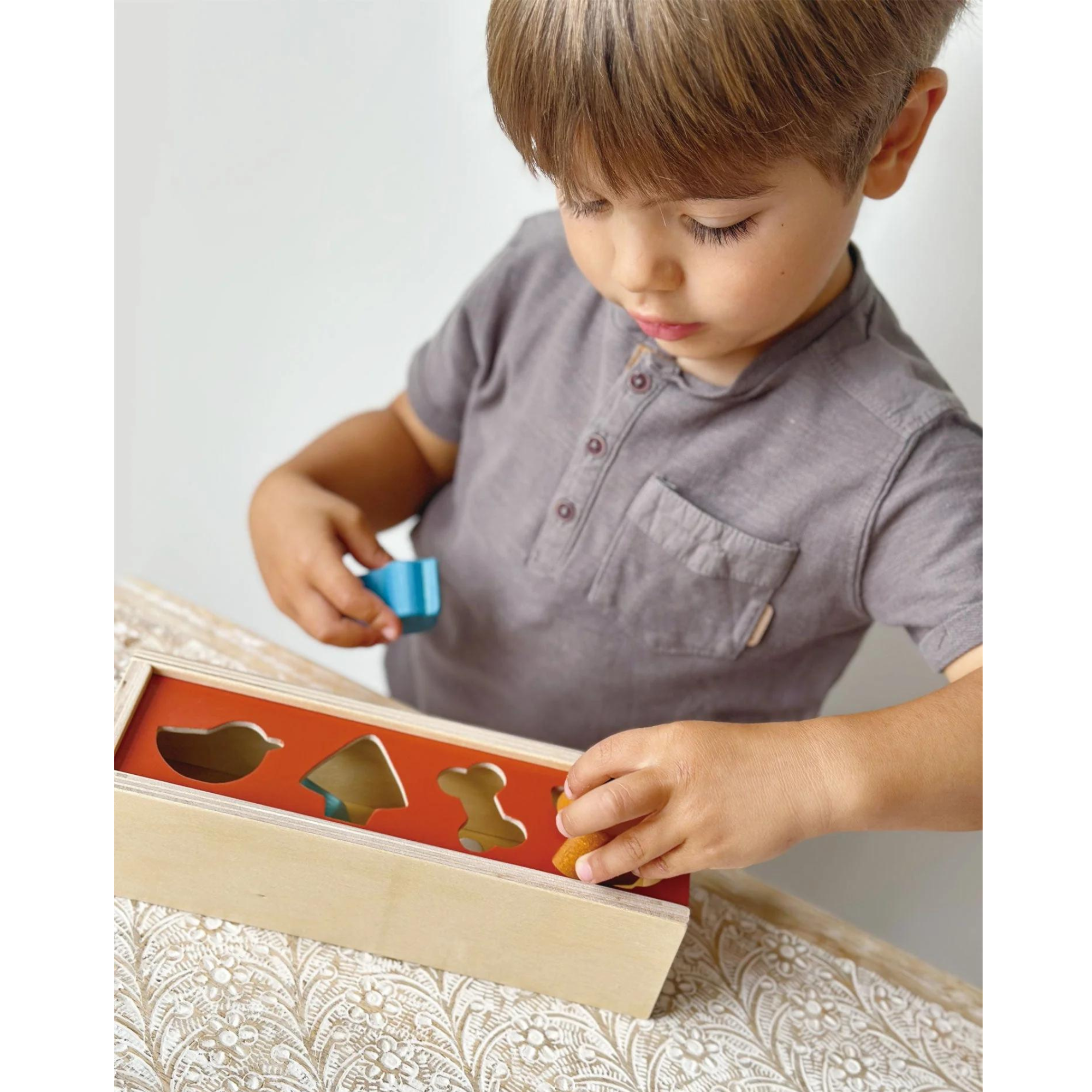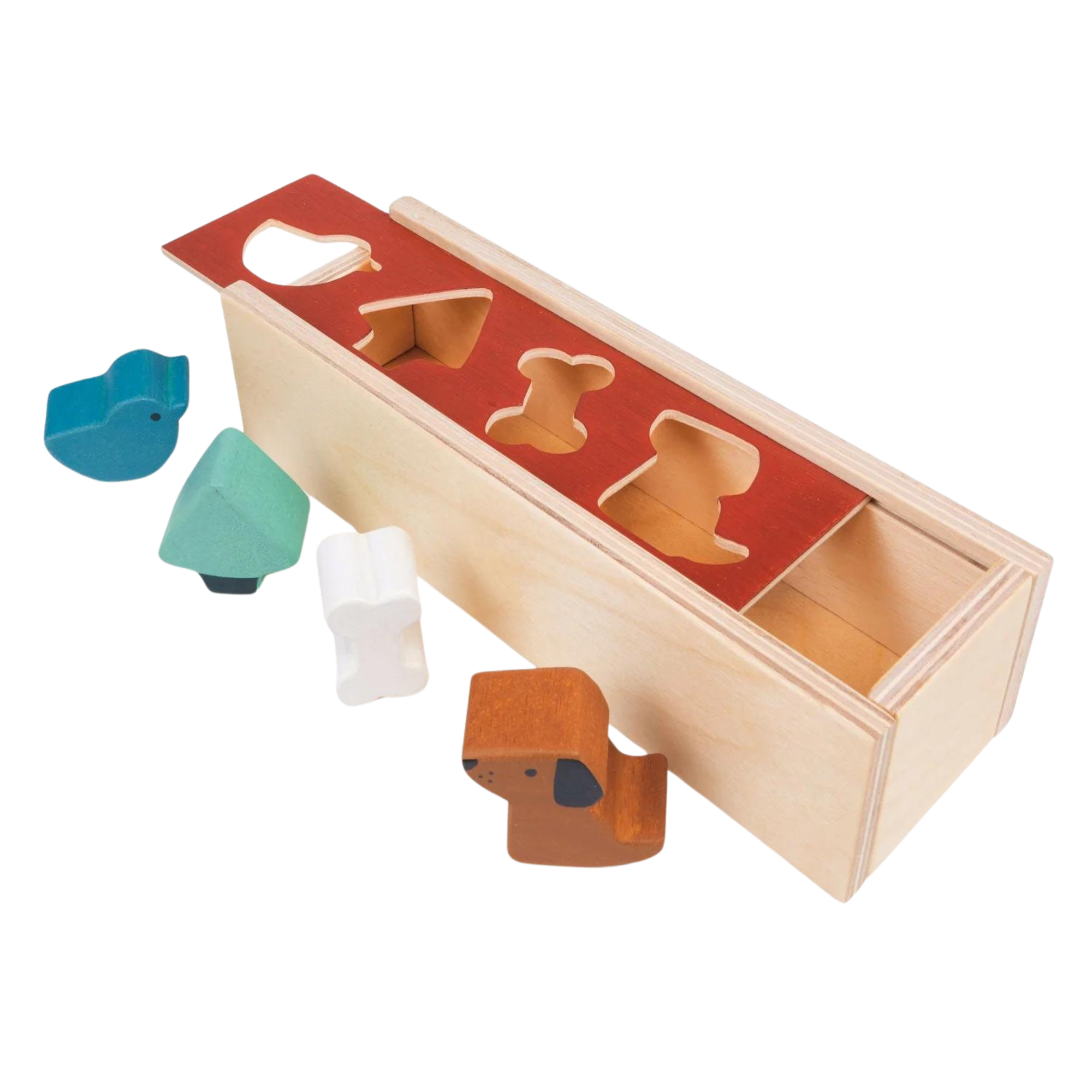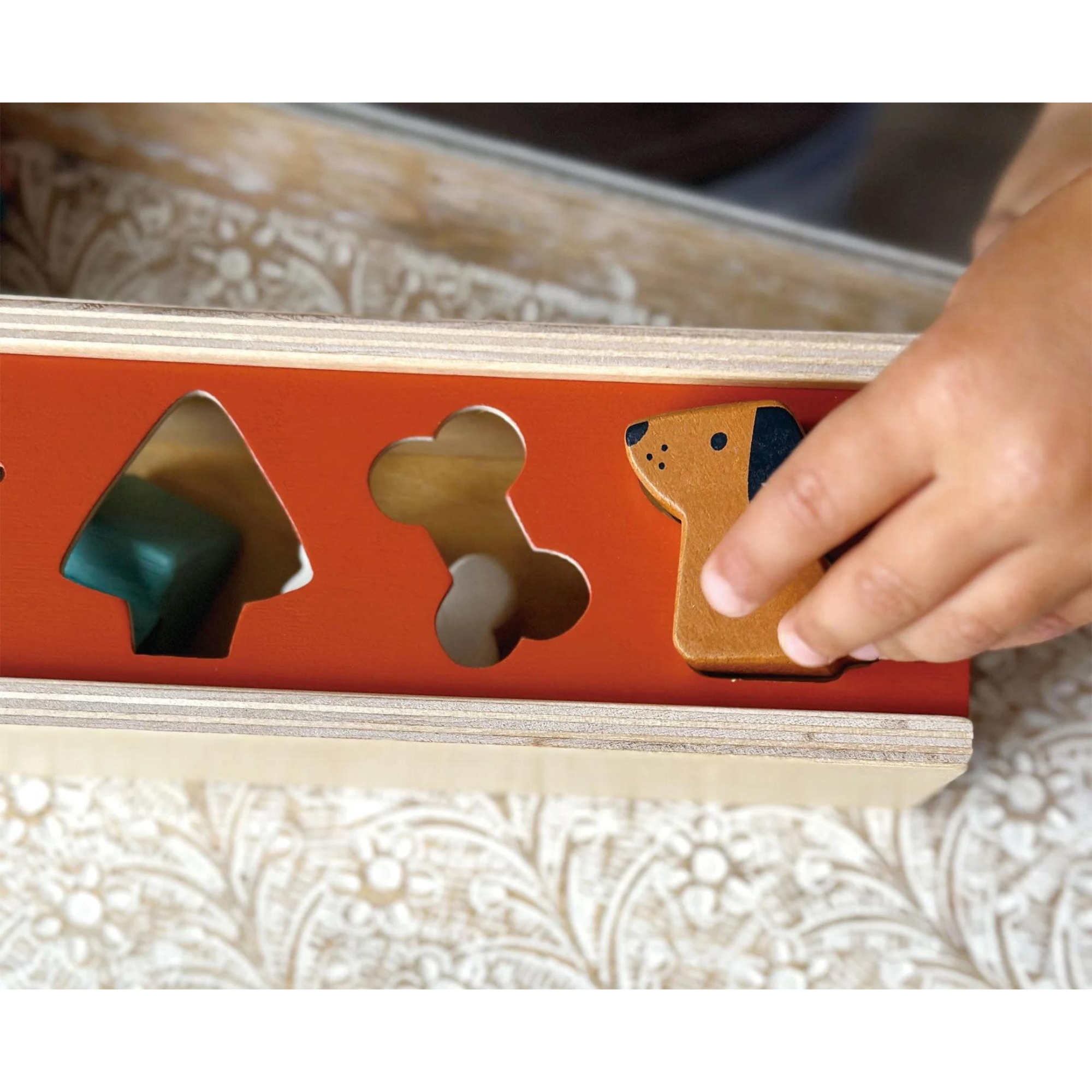 - Cette boîte a un couvercle amovible. 4 formes, un oiseau, un arbre, un chien et un os, avec les