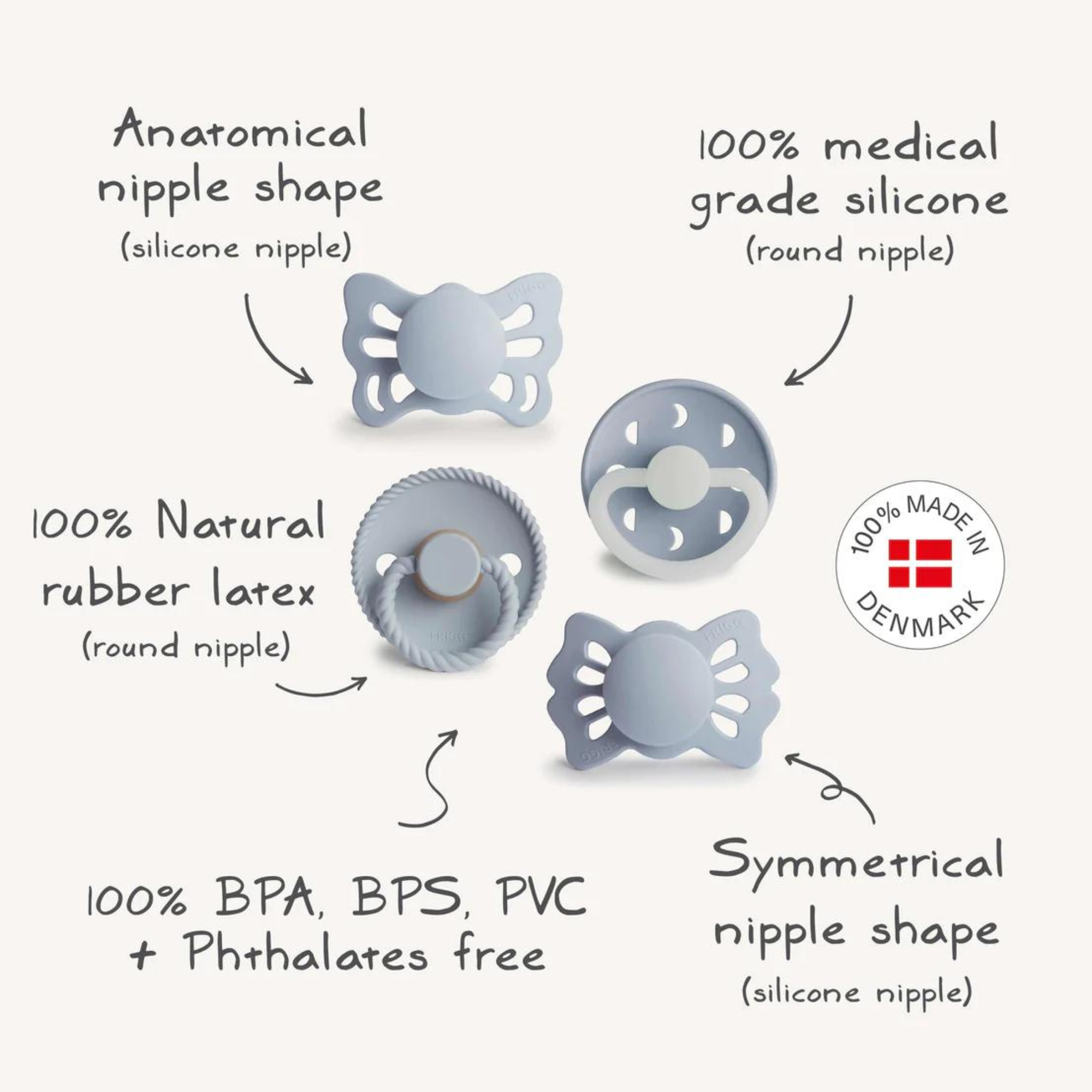 La gamme de sucettes en caoutchouc naturel et en silicone FRIGG a été soigneusement conçue pour le confort de votre bébé.