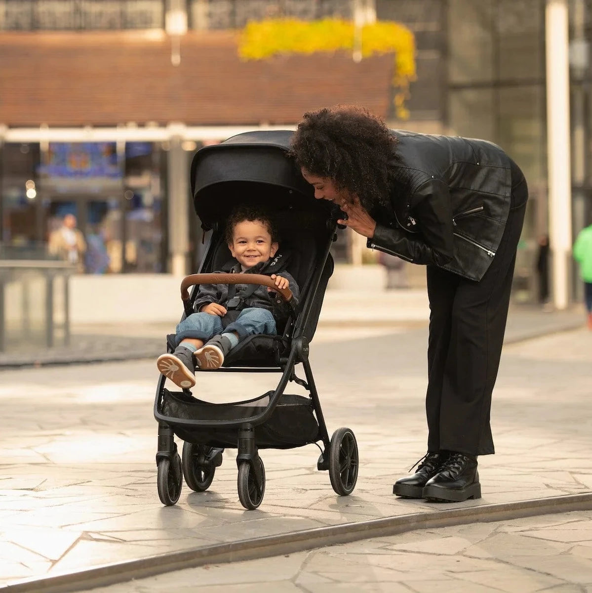 - Promenades élégantes. La barre de poussée et le guidon en similicuir luxueux ajoutent du style à vos promenades. Le guidon amovible et rotatif s'adapte à toutes les tailles d'enfants pour des promenades en douceur, de la naissance à 22,7 kg.