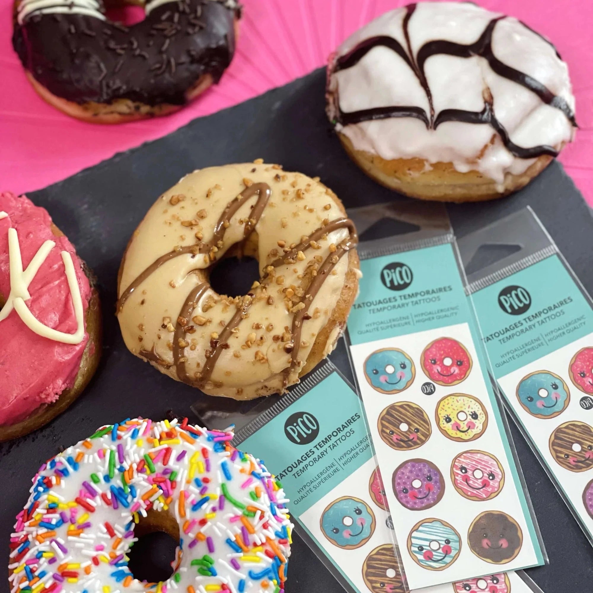 Qui n'aime pas les beignets colorés et délicieux ? C'est une excellente idée d'utiliser nos tatouages lors d'une dégustation de beignets maison.