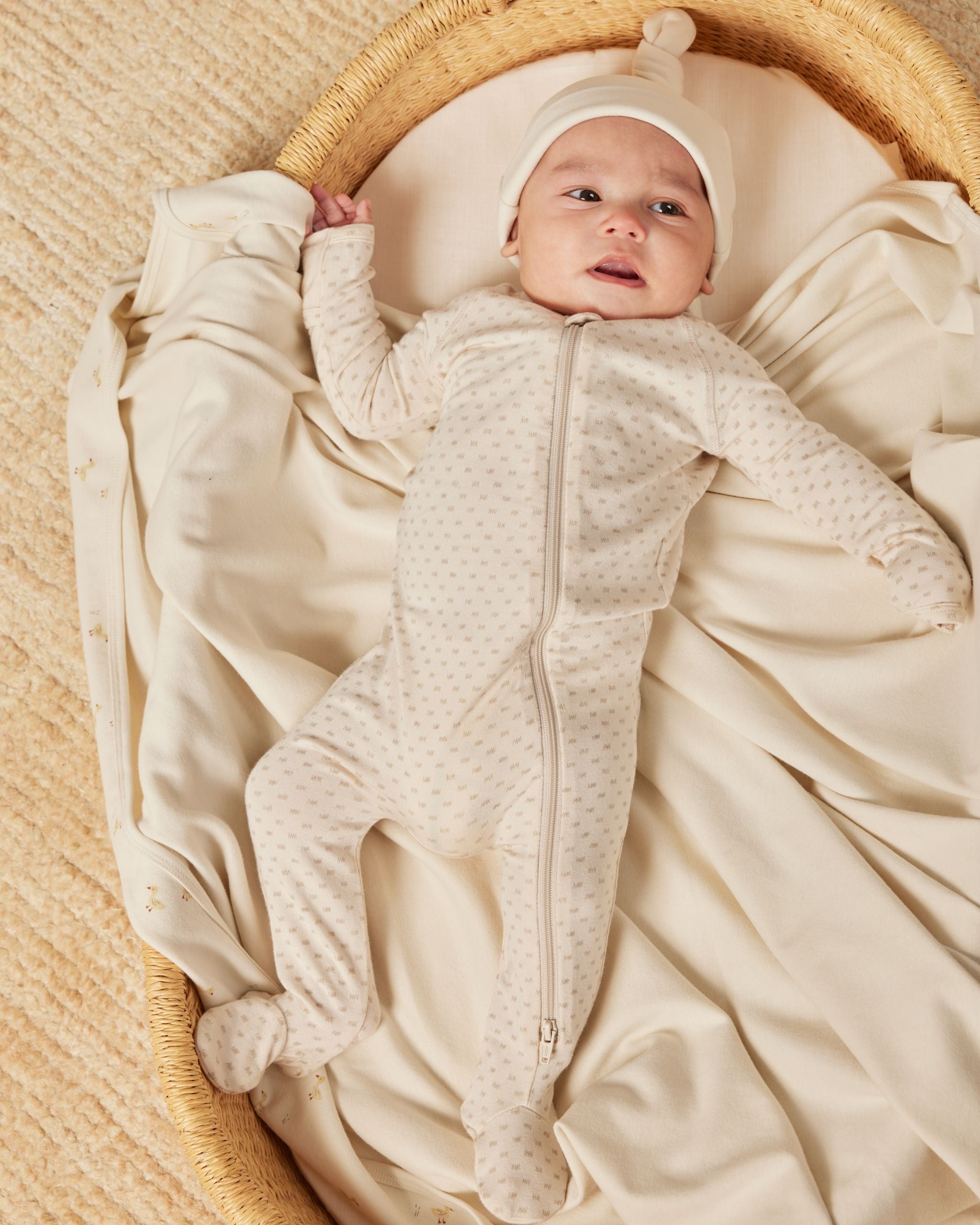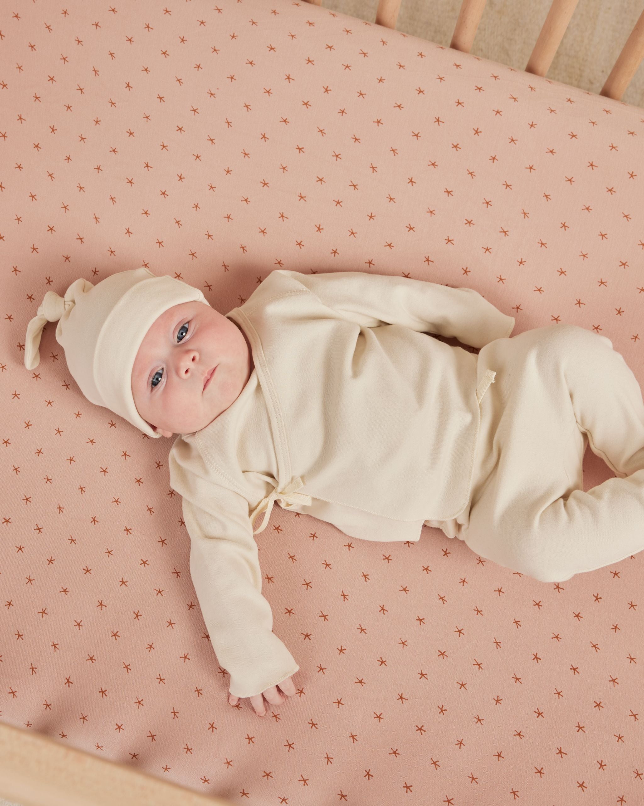 Bonnet bébé noué dans notre tissu jersey doux et extensible.