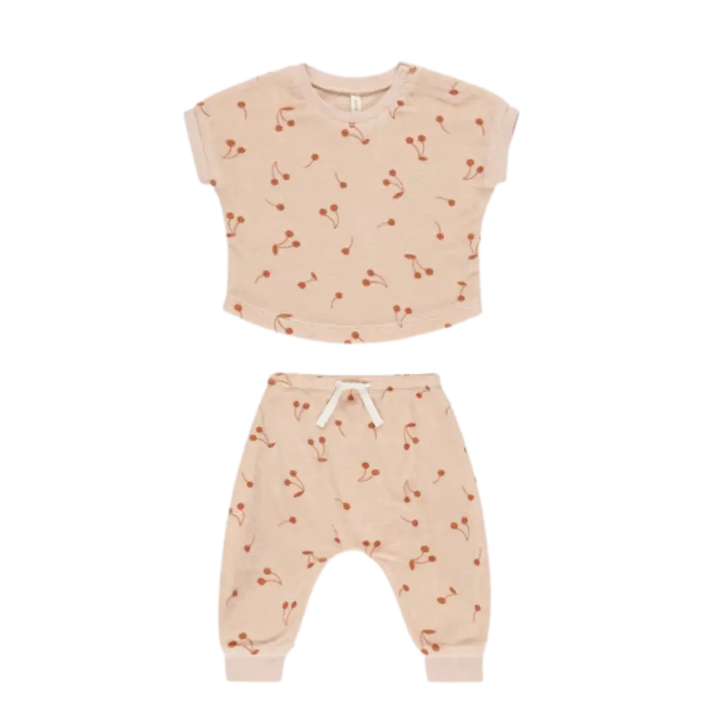 Gardez votre tout-petit au frais et élégant : achetez dès maintenant chez Kido Bebe l'ensemble t-shirt + pantalon en éponge QUINCY MAE - Cerises !