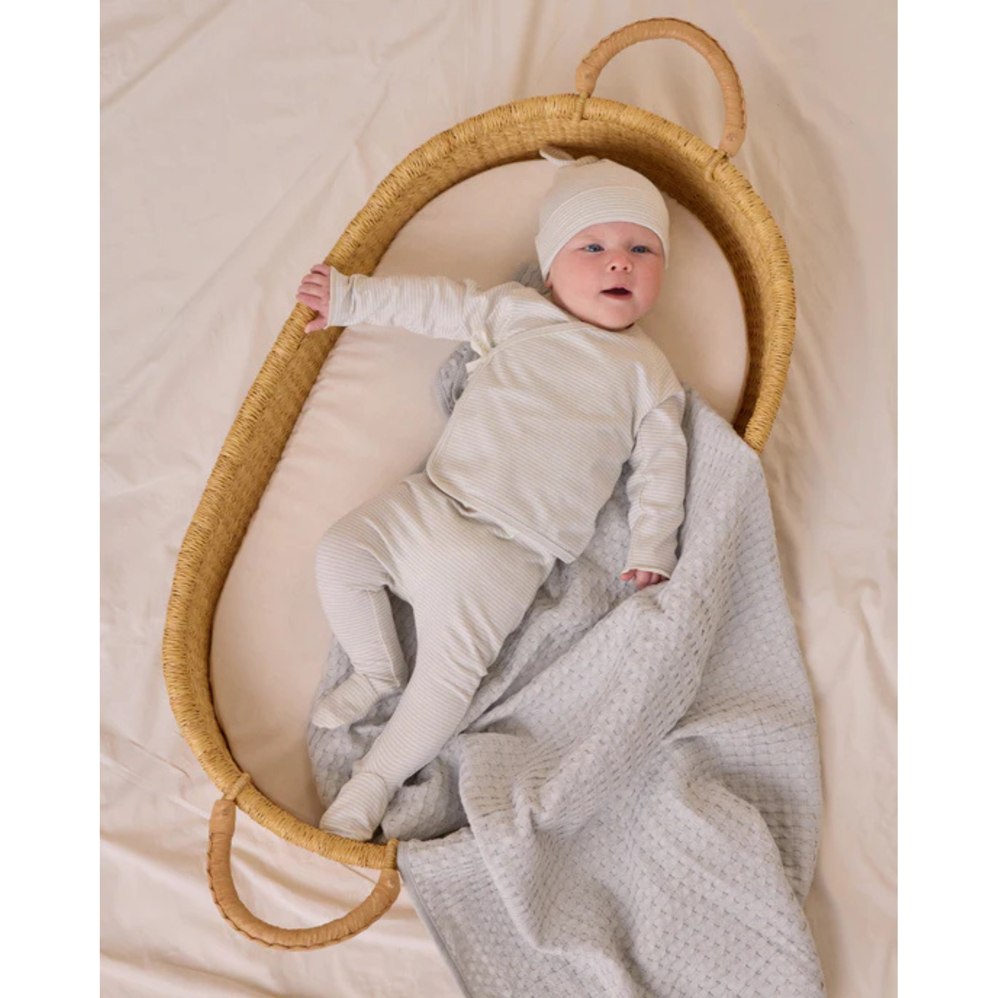 Enveloppez votre nouveau-né dans le confort et le style. Achetez l'ensemble haut cache-cœur + pantalon à pieds QUINCY MAE - Sky Micro Stripe maintenant chez Kido Bébé !