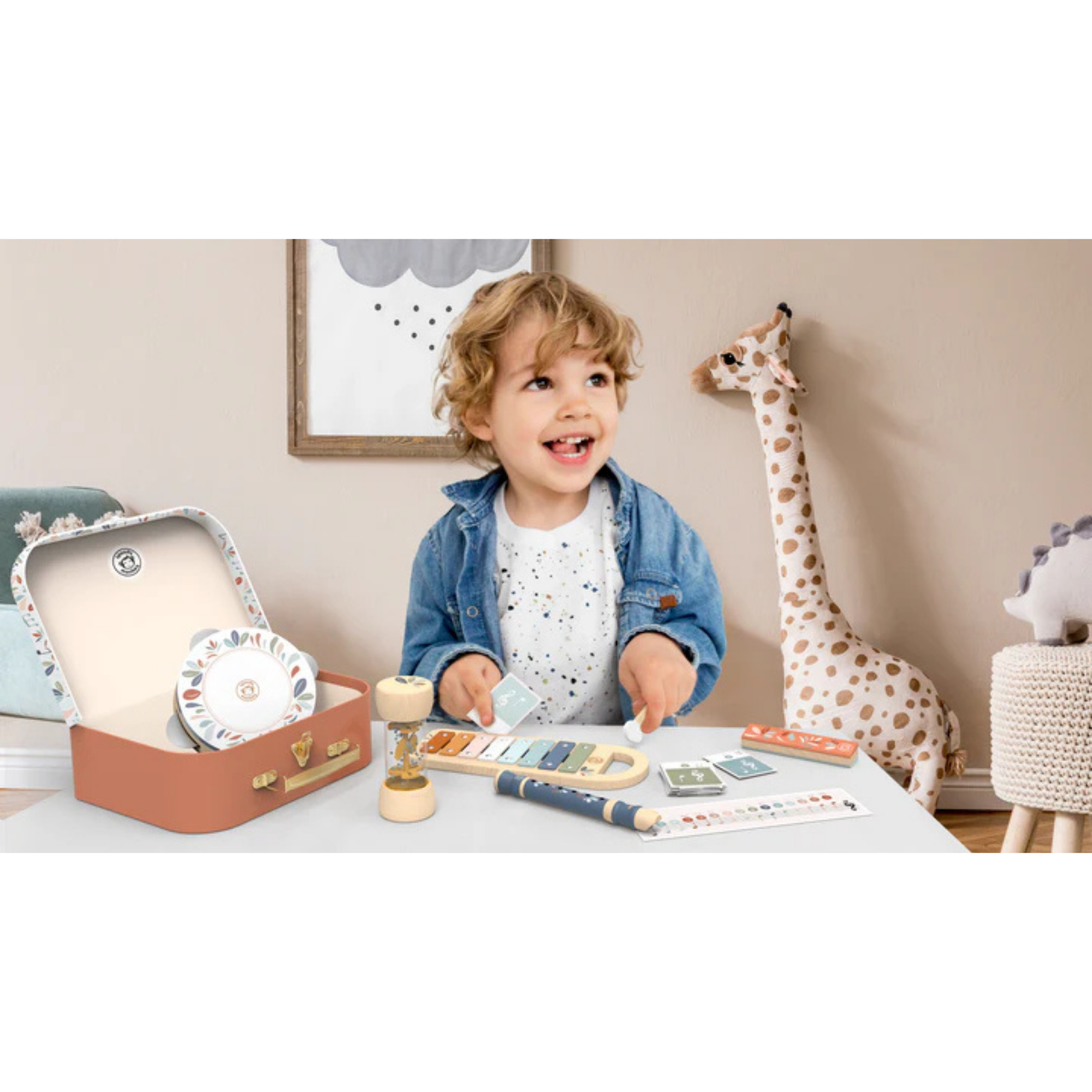 Parce que la musique stimule tous les aspects du développement de l'enfant, comme la créativité et les sens, cette valise comprend 5 instruments de musique : un xylophone à huit touches métalliques colorées, un tambourin qui produit un son doux et amusant, un instrument à pluie en bois qui recrée le doux bruit de la pluie lorsque les perles tombent en cascade en tournant l'instrument, une flûte à bec colorée avec une peinture non toxique et sans goût conçue pour les débutants, et un harmonica qui ravira les jeunes enfants car aucune expérience n'est requise.