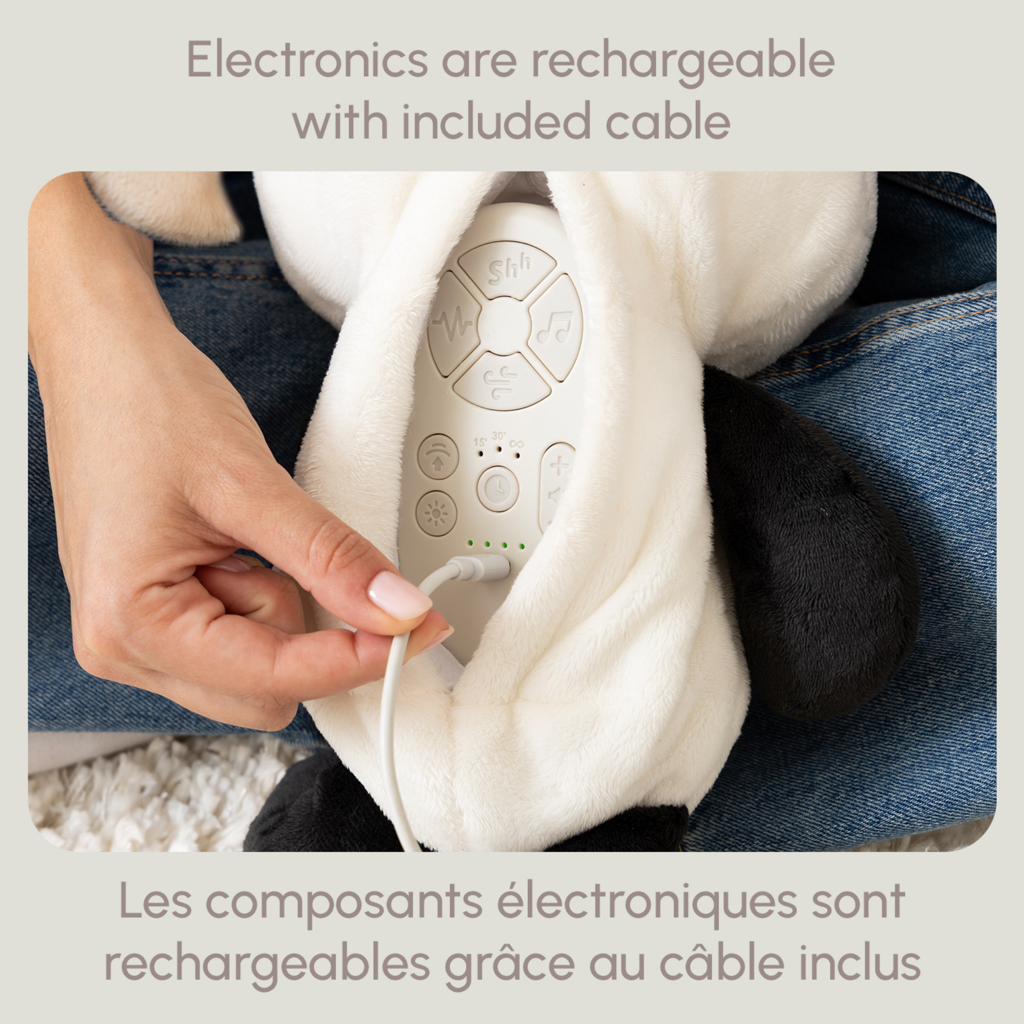 The soother’s customizable settings allow you to tailor the experience to your child’s individual preferences. As the panda’s belly moves up and down in a rhythmic breathing motion, it mimics natural breathing patterns to comfort babies and encourage their developing ability to self-soothe, supporting relaxation and more restful sleep.