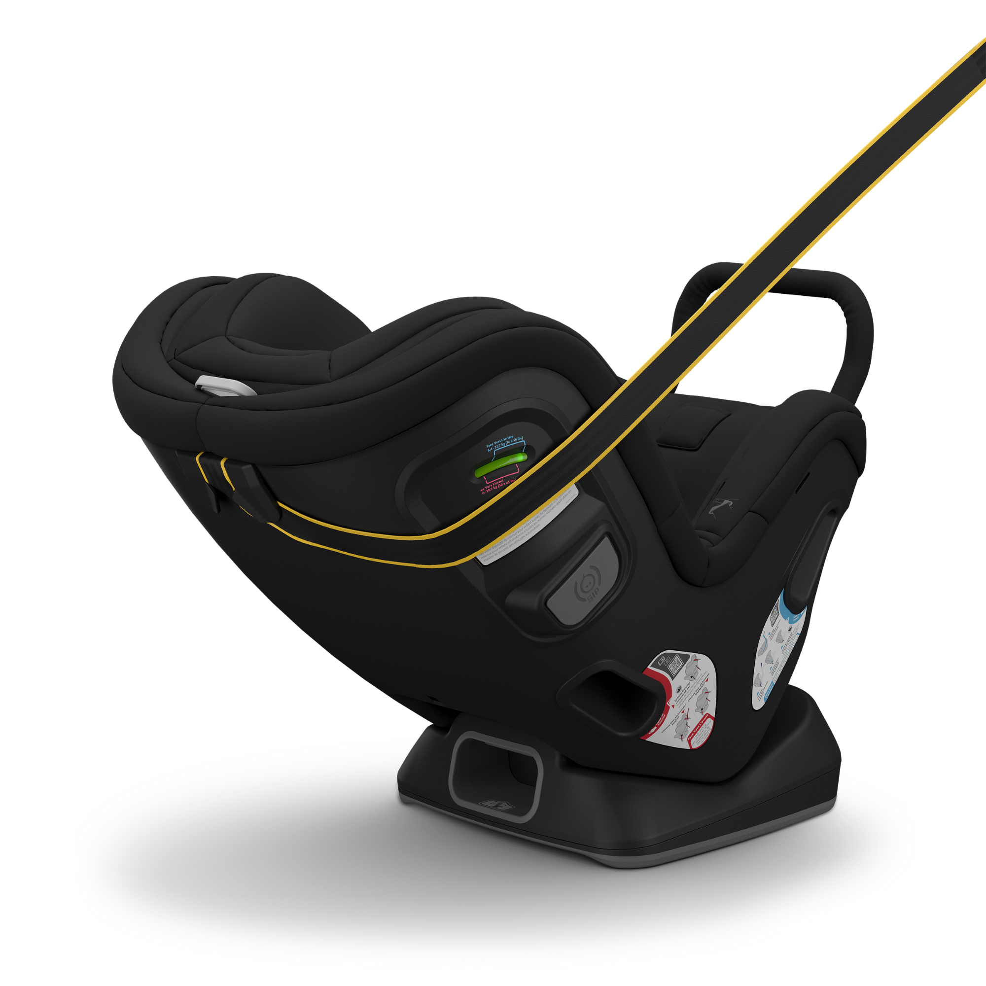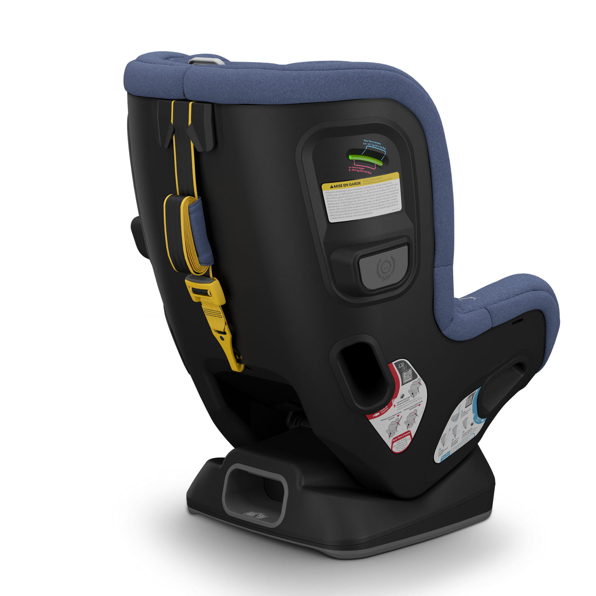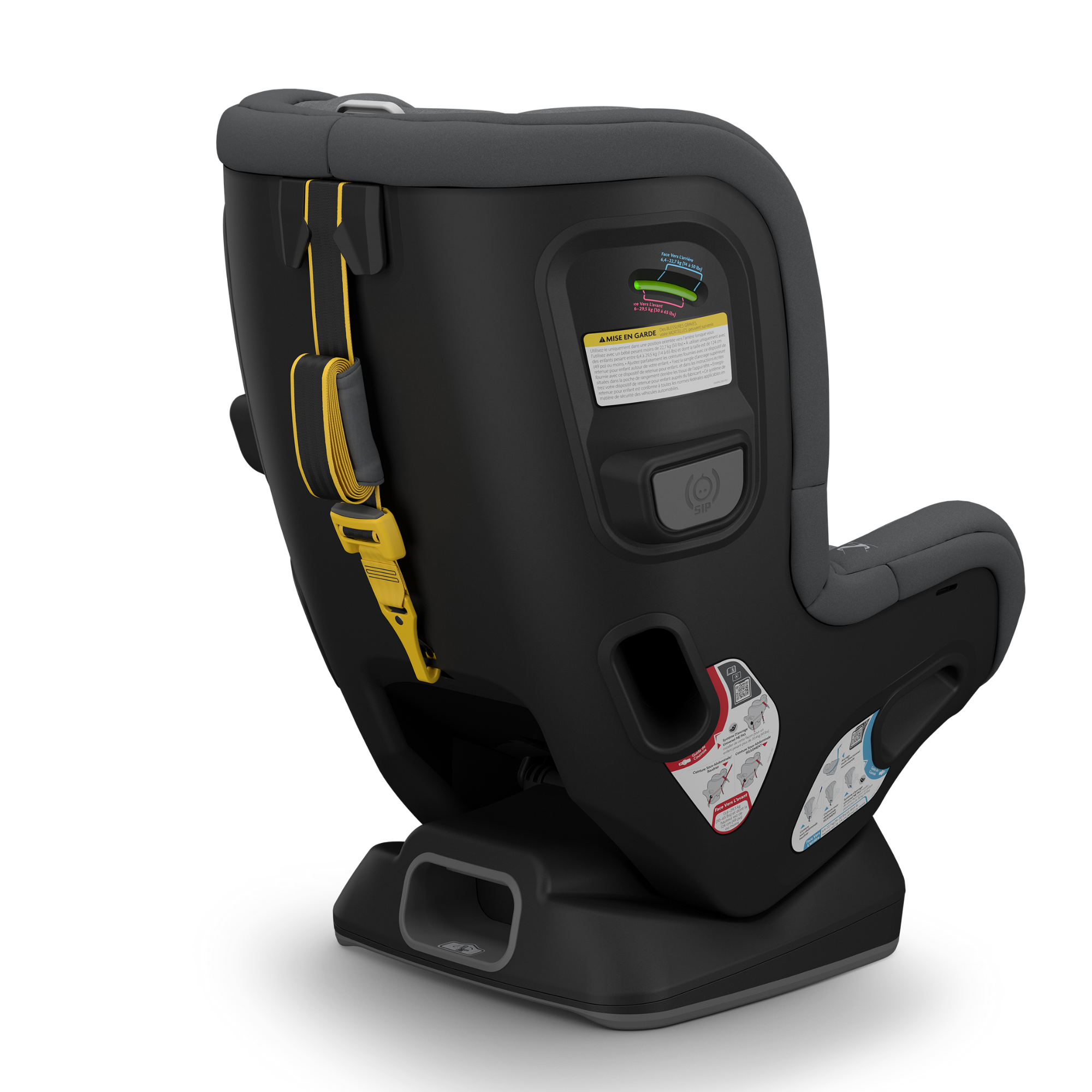 - La sangle multidirectionnelle pour les voyages orientés vers l'arrière et vers l'avant réduit la rotation du siège et la tension sur la tête et le cou de l'enfant en cas d'accident
