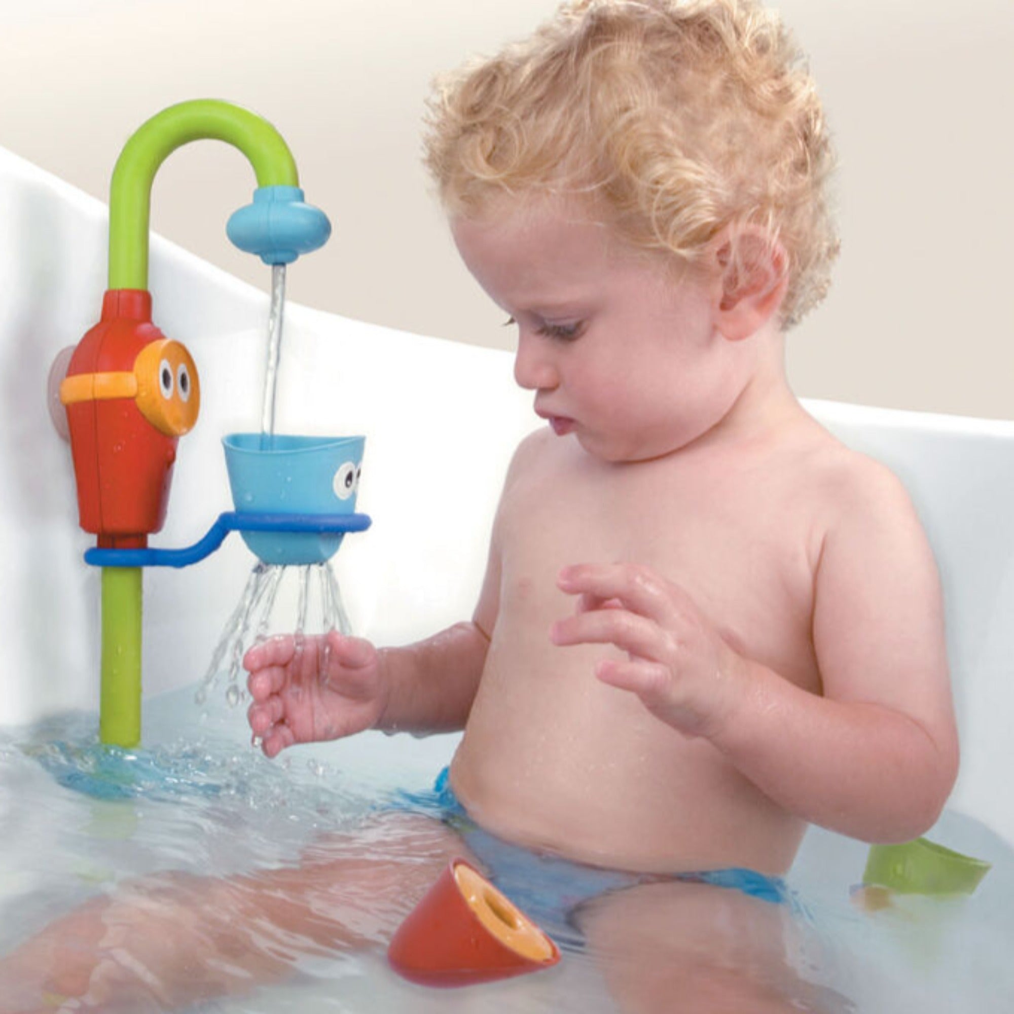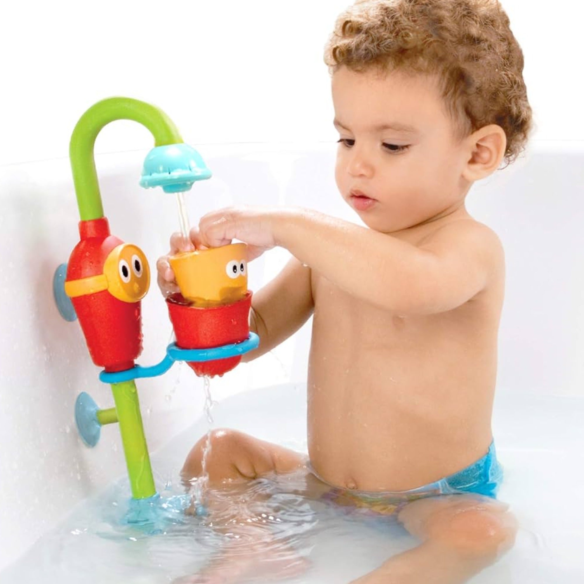 Laissez votre enfant remplir et renverser de l'eau dans la baignoire et sur son corps, en déplaçant le bras pivotant d'un côté à l'autre et en essayant d'activer les culbuteurs.