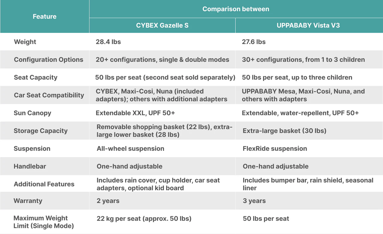 The CYBEX Gazelle S weighs 28.4 lbs and is built for easy handling. Its compact fold, even with two seats, makes storage a breeze—perfect for city life. The UPPABABY Vista V3, also at 27.6 lbs, offers a sleek design and a one-step fold, providing more room for your growing family while staying effortlessly portable for busy parents.