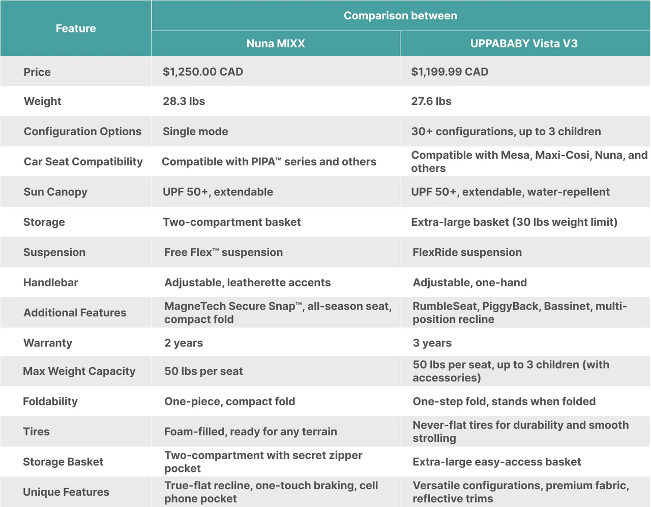 The Nuna Mixx Next delivers exceptional value at $1,250.00 CAD, offering a smooth ride, one-hand maneuverability, and a compact fold—ideal for busy families. For $1,299.99 CAD, the UPPABABY Vista V3 takes versatility to the next level with 30+ configurations and the ability to grow with your family, making it the ultimate long-term investment.