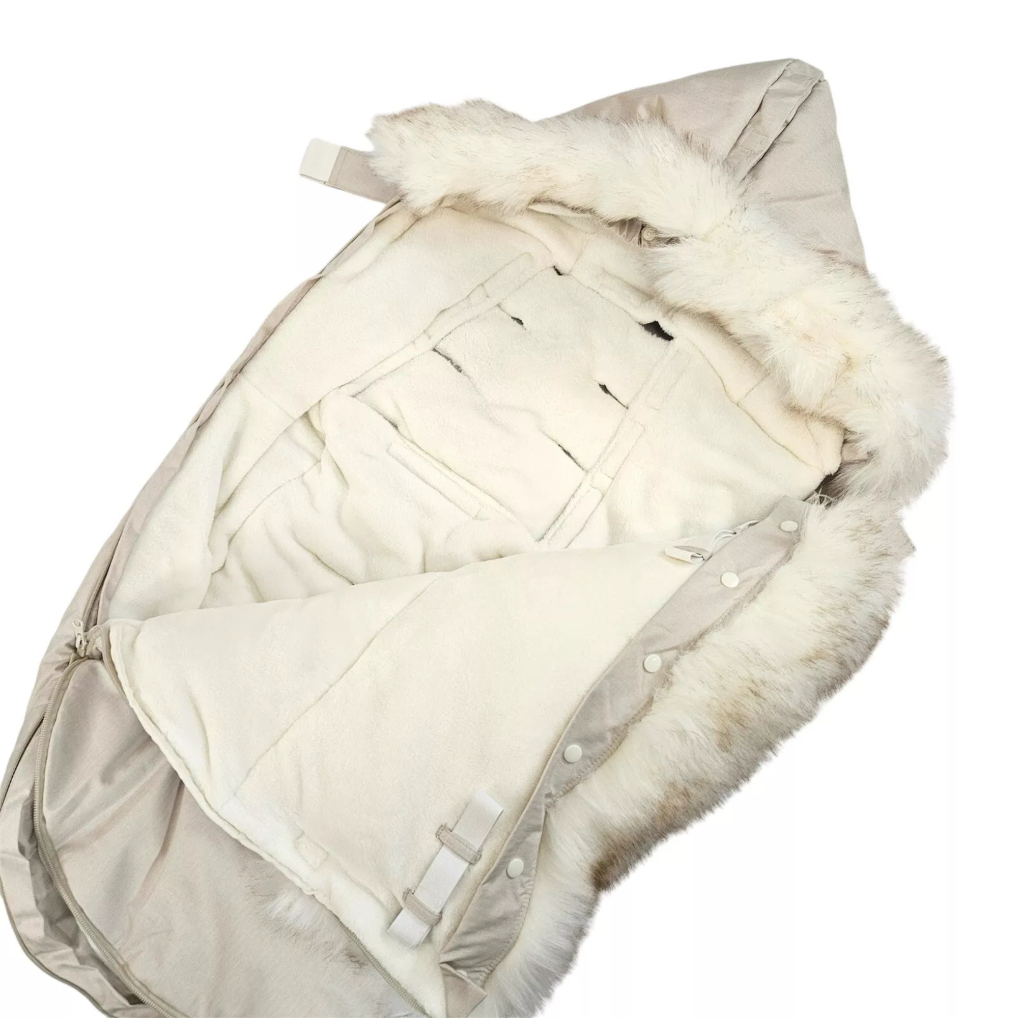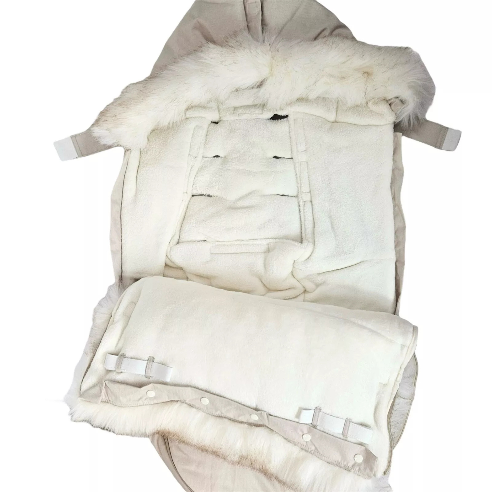 The outer shell is water repellent, and the poly insulation and plush lining is extra soft— effectively blocking out any cold air. On warmer days, remove the faux fur trims for a lighter-weight footmuff. Bonus: the entire thing (except for faux fur trims) is machine washable and dryable.