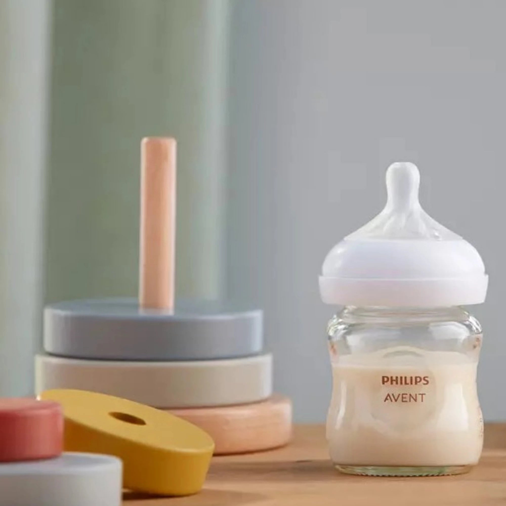 The Philips Avent Natural Glass Bottle features a wide breast-shaped nipple with a soft feel that mimics the shape and feel of a breast. Its Natural Response nipple lets your baby control the pace of the milk flow.
