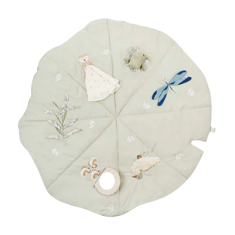 Our Lilypad shaped activity mat features all our favourite friends from the Riverbank Collection. With sensory elements such as a mirror, frog toy, crinkly leaves and a squeaky fluffy duck, this activity mat is designed with playing at home in mind. Made from 100% organic cotton and recycled polyester filling, this mat will entertain your little ones and fit perfectly into your home. Comes with a drawstring canvas bag for easy storage.
