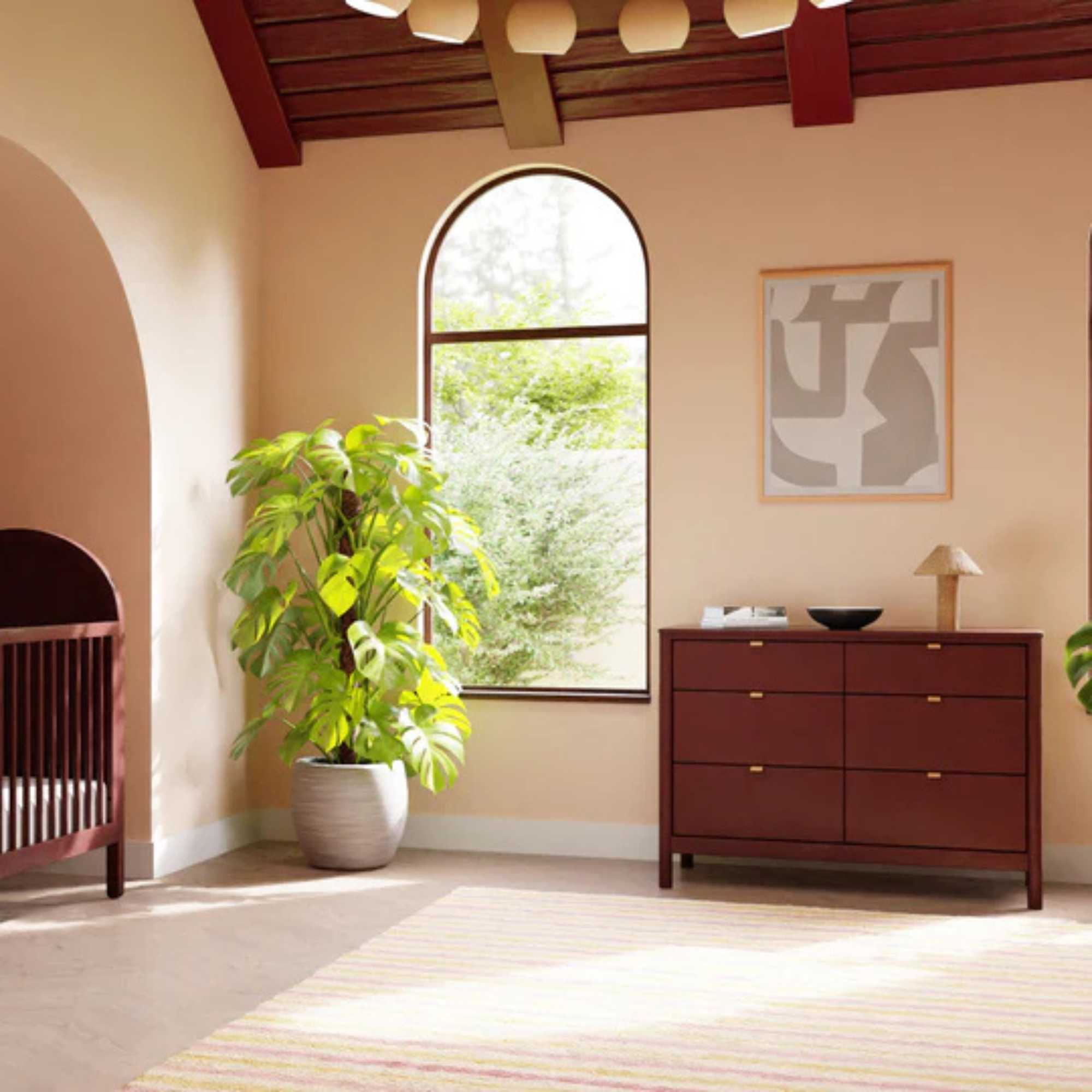 The simple yet sophisticated Bondi 6-Drawer Assembled Dresser complements both (sold saparately ) the Babyletto Bondi Cane 3-in-1 Crib and the Bondi Boucle 4-in-1 Crib with its warm wood finish and tonal vegan leather drawer pulls, rounded posts and minimalist silhouette. It's designed for the nursery with spacious smooth-glide drawers, included anti-tip kit for safety, and best-of-all it arrives fully assembled, ready out of the box.