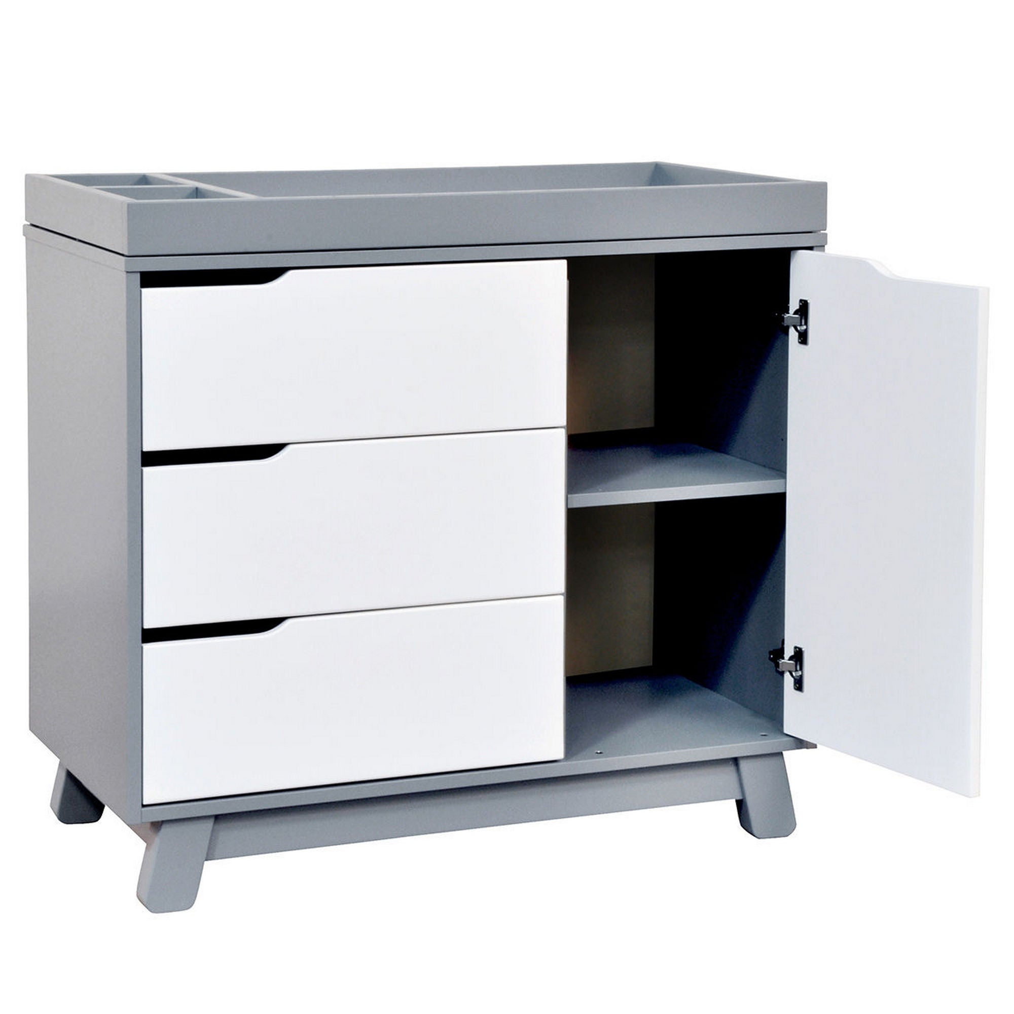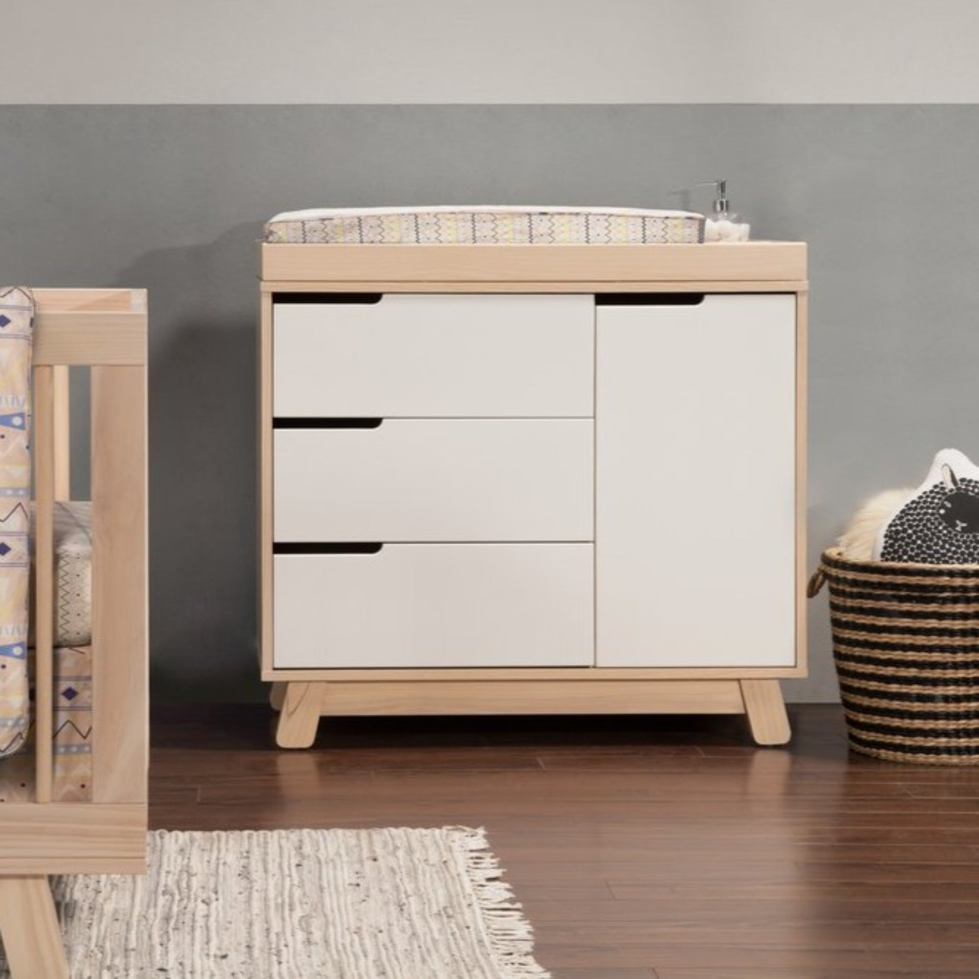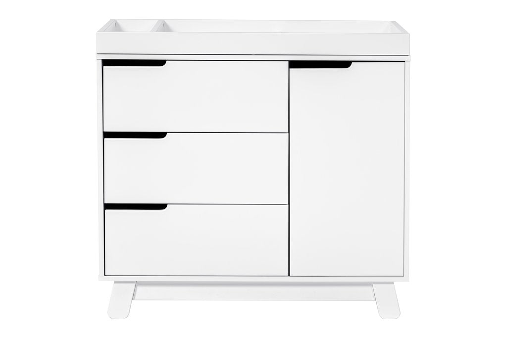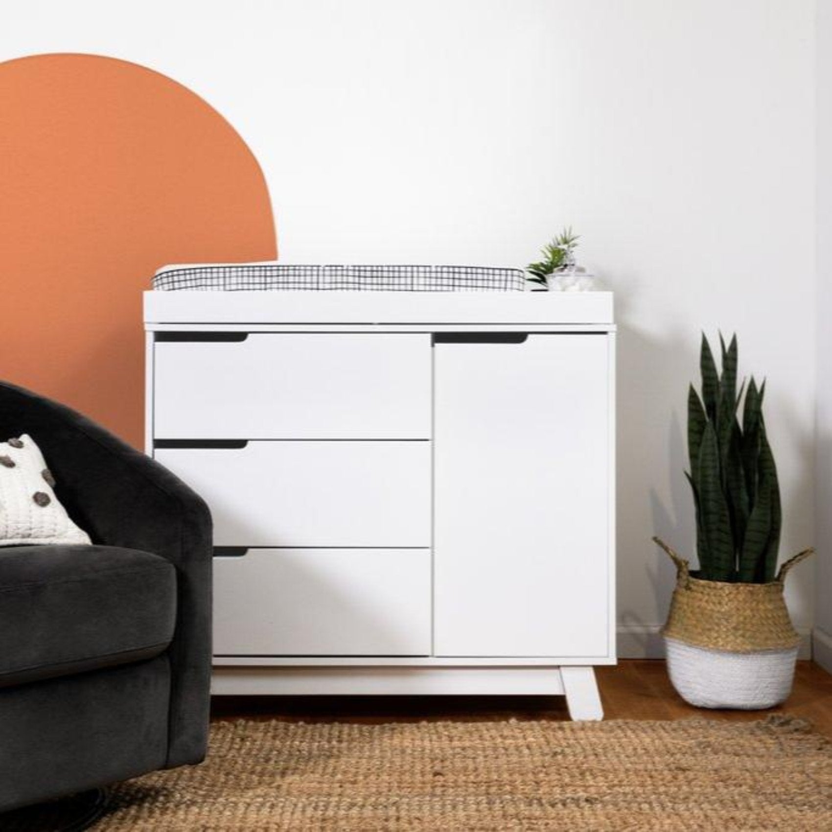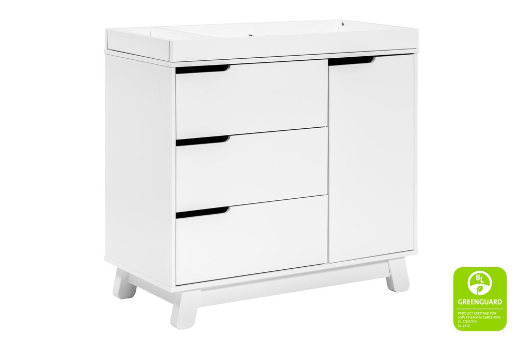 The Hudson 3-drawer Changer Dresser is a modern space-saving convenience! Combining an included changing table, 3-drawer dresser, and storage cabinet all in one versatile package. Truly built for baby, the storage cabinet includes an adjustable shelf which is perfect for keeping diapers and wipes handy. Additional details include smooth-glide drawers, hidden hardware, and an included anti-tip kit. Complement the best-selling Hudson 3-in-1 Convertible Crib for an essential modern nursery.