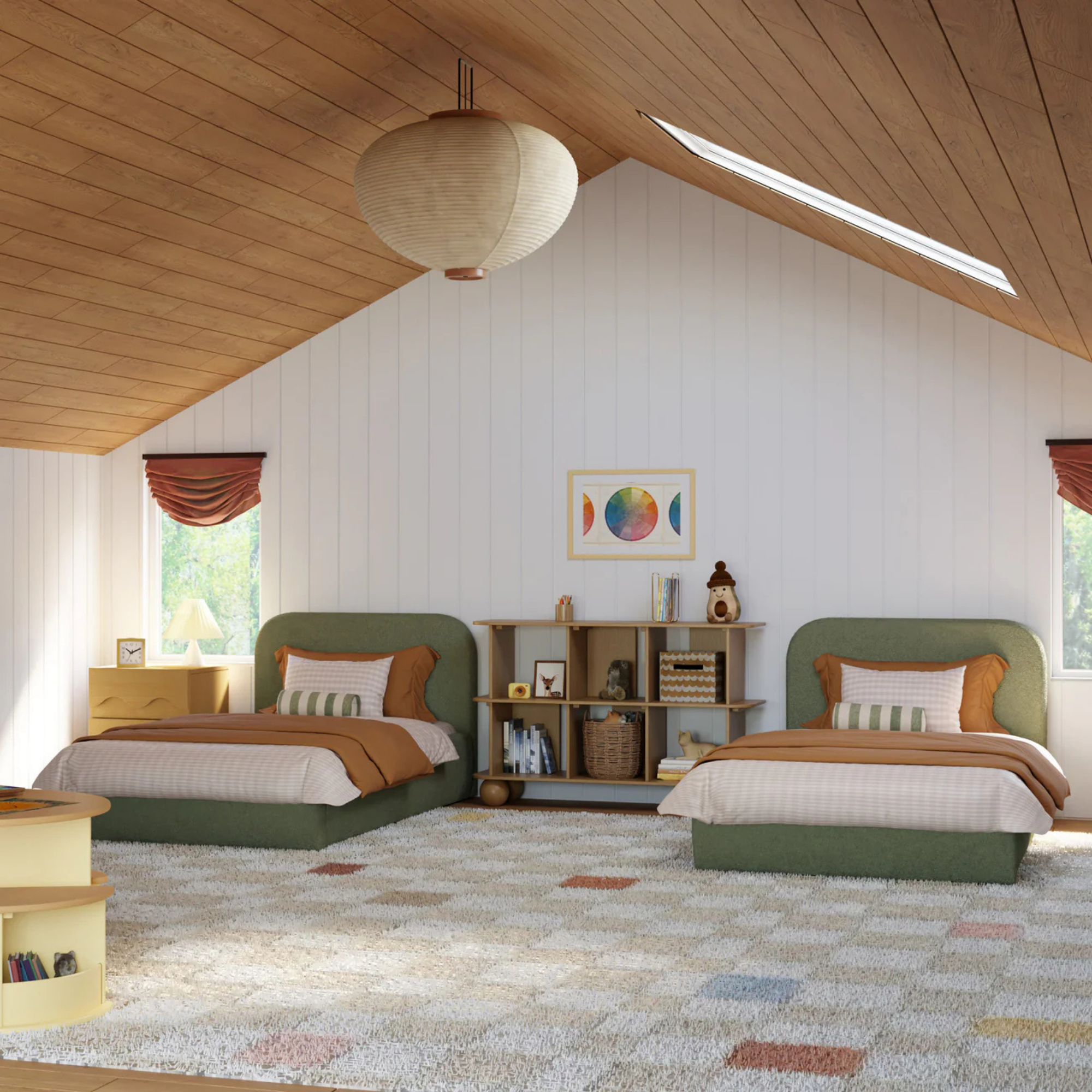 Cozy meets design in the Nara Twin Bed, crafted to bring modern style and kid-friendly comfort into their first real bed. With its smooth curves and low-to-the-ground silhouette, Nara makes the big-kid transition feel stylish and exciting. Fully wrapped in fabric for a clean, tailored look, it’s as polished as it is practical. Add optional bed guardrails on either side for extra peace of mind.