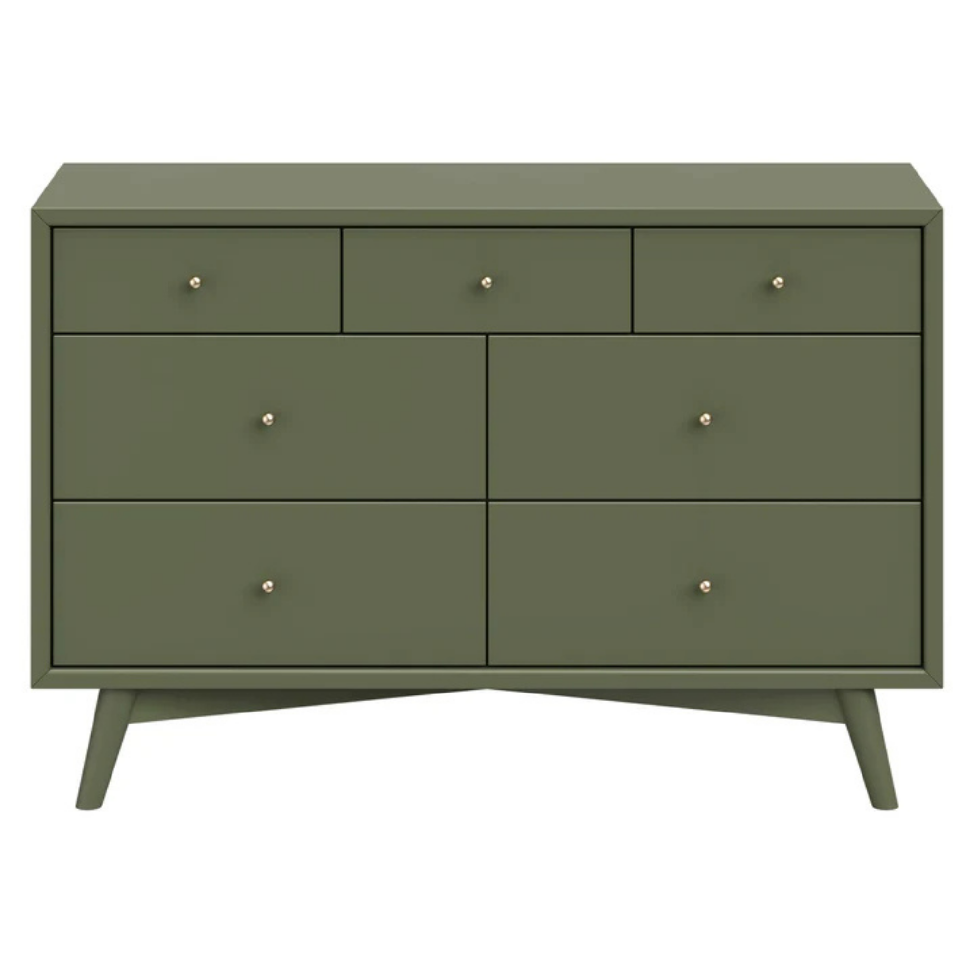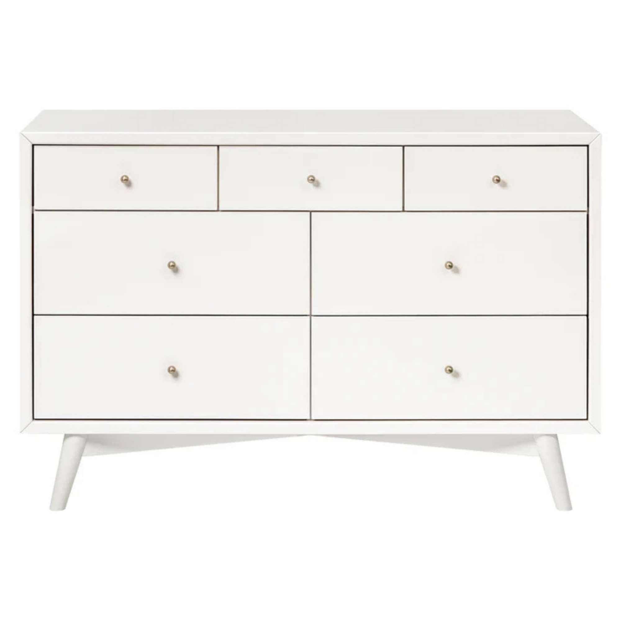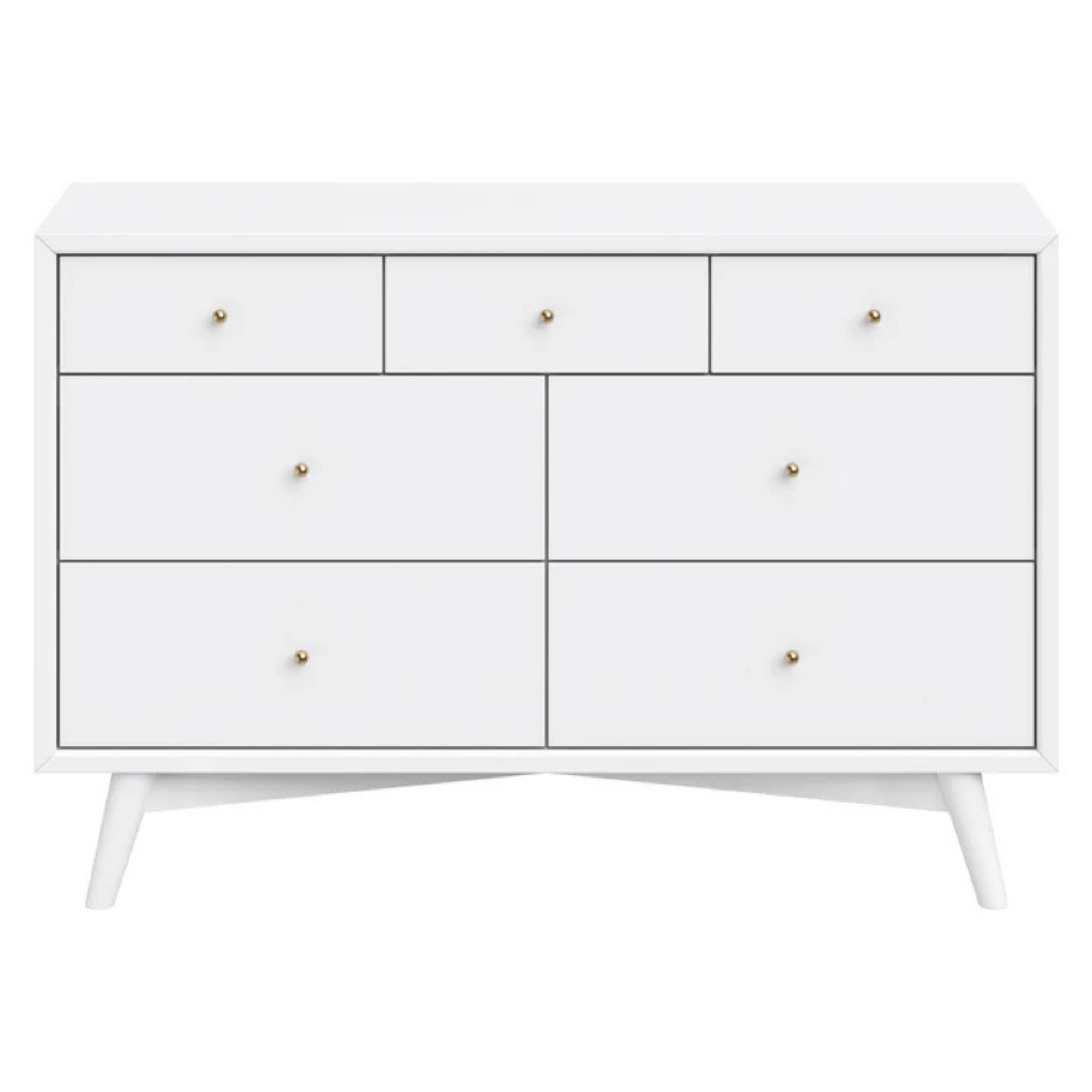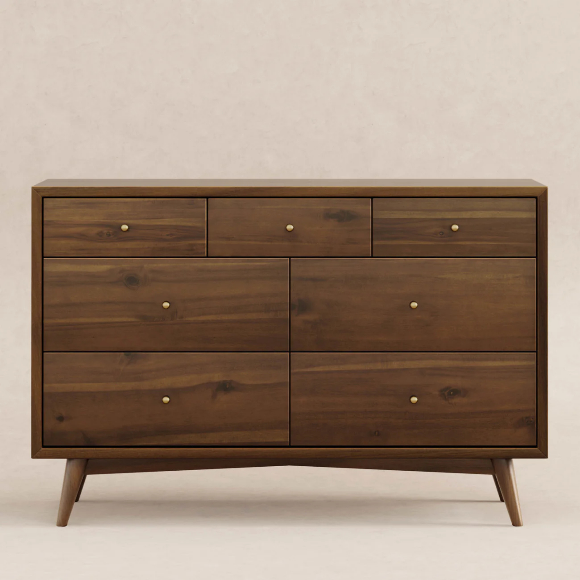 The Palma 7-drawer Double Dresser is a sophisticated mid-century inspired design with tapered legs, brushed metal hardware, and smooth-glide drawers. It's a versatile modern piece, providing ample storage space with three top drawers and four larger bottom drawers.