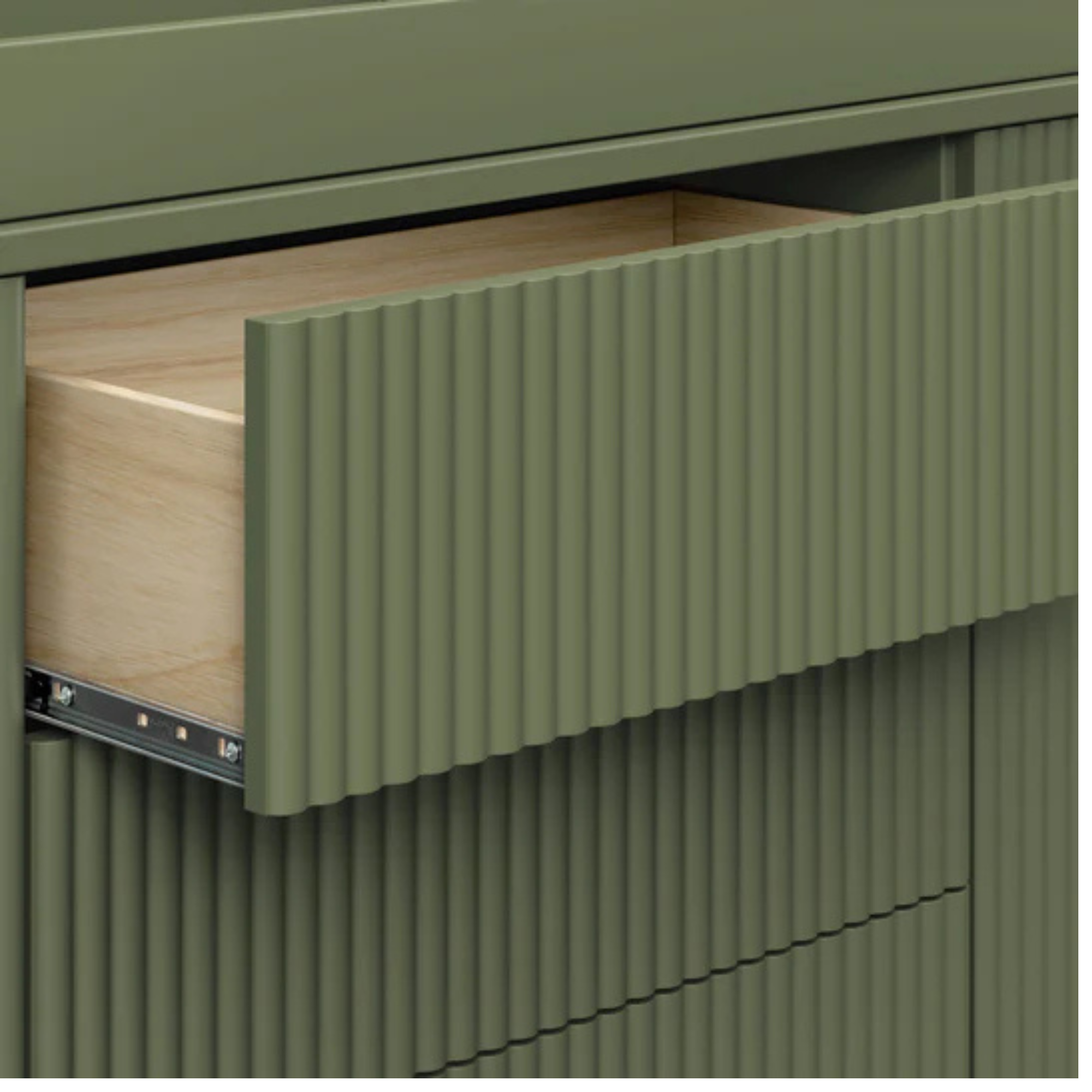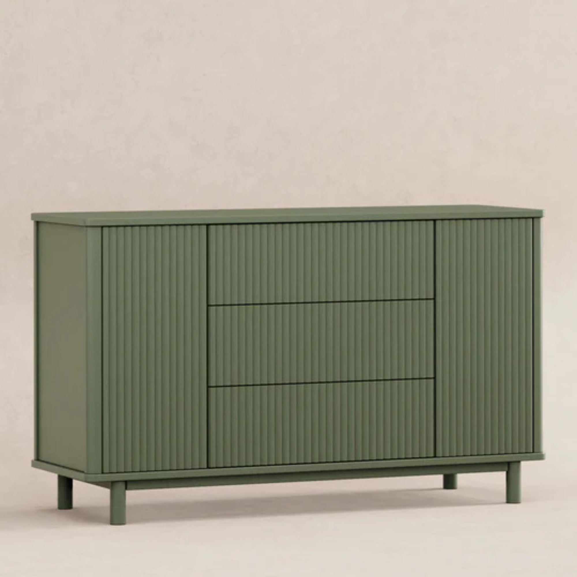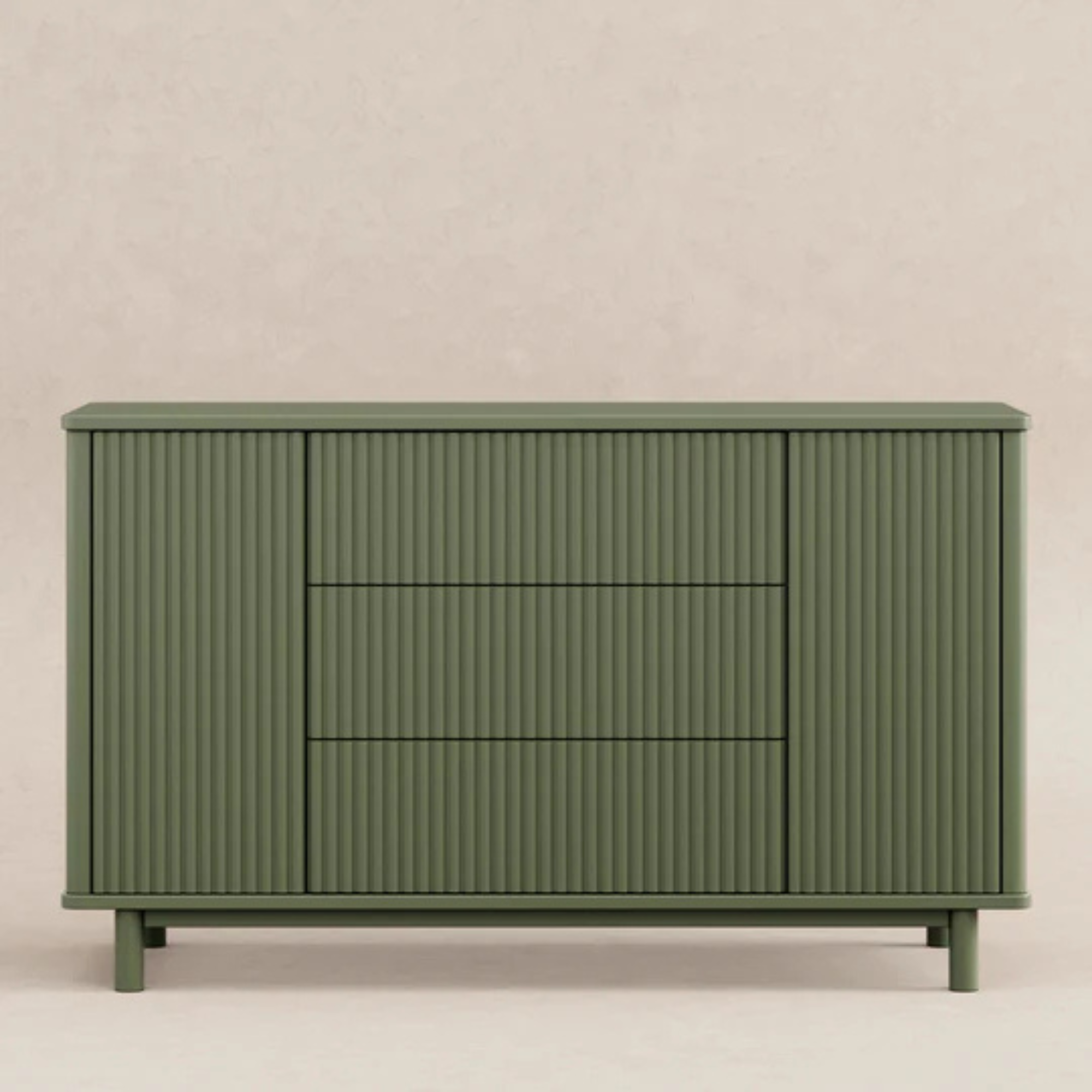 The timeless Pogo Tambour Assembled Dresser exudes modern elegance with its textured fluted tambour paneling, smooth, rounded edges, and elevated silhouette. Designed for the nursery but beautiful enough for use throughout the home, it features push to open smooth-gliding drawers, spacious side cabinets, included anti-tip kit for safety, and best-of-all, it arrives fully assembled, ready out of the box.
