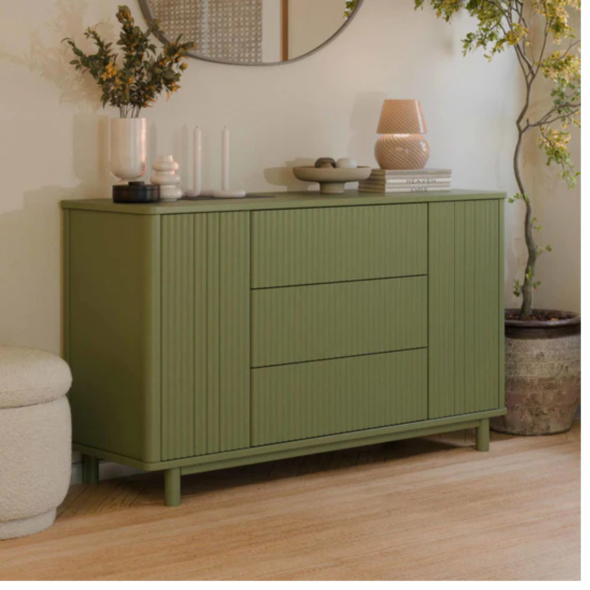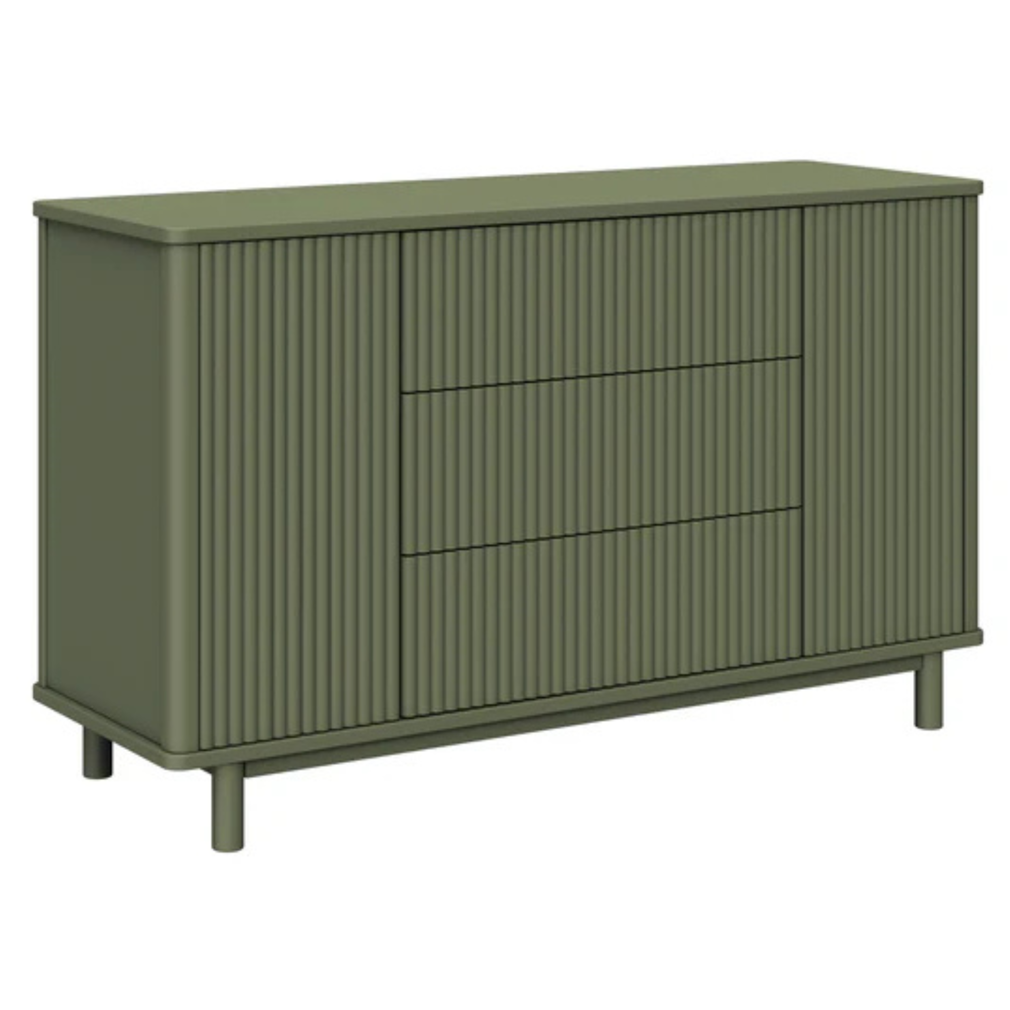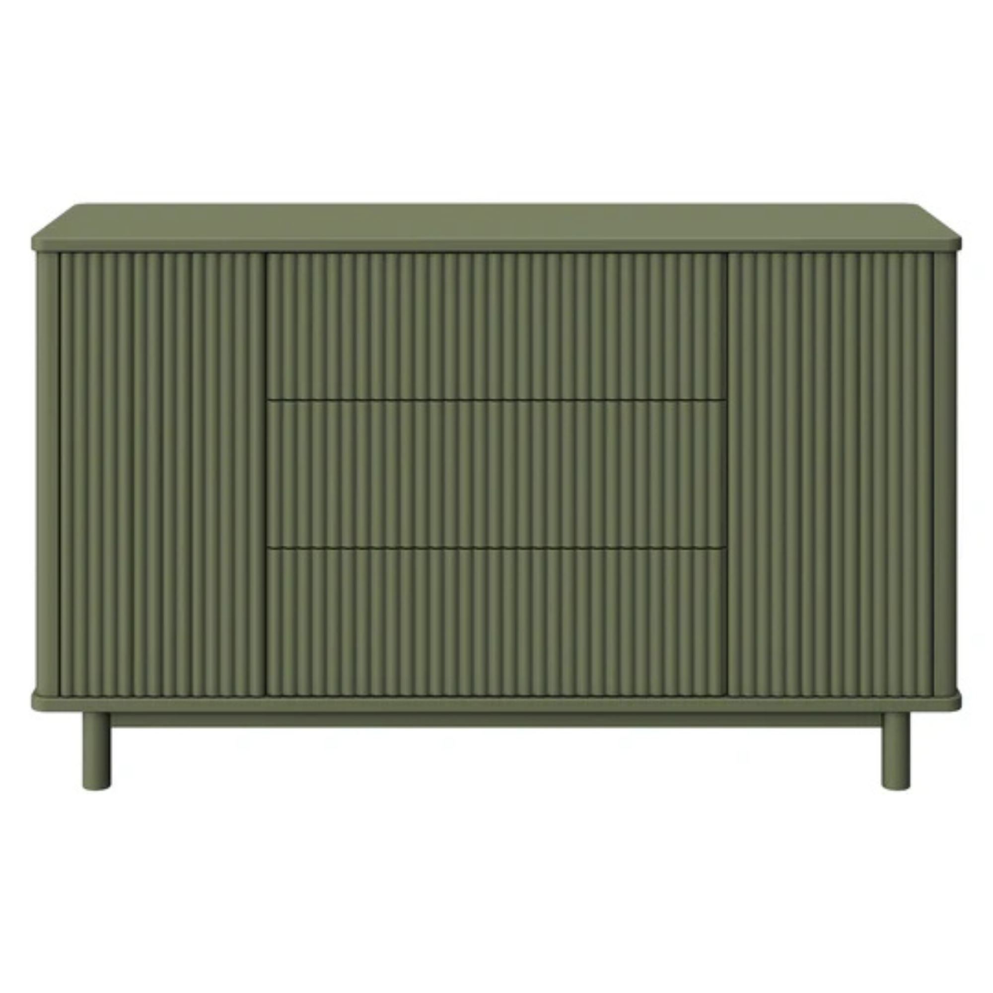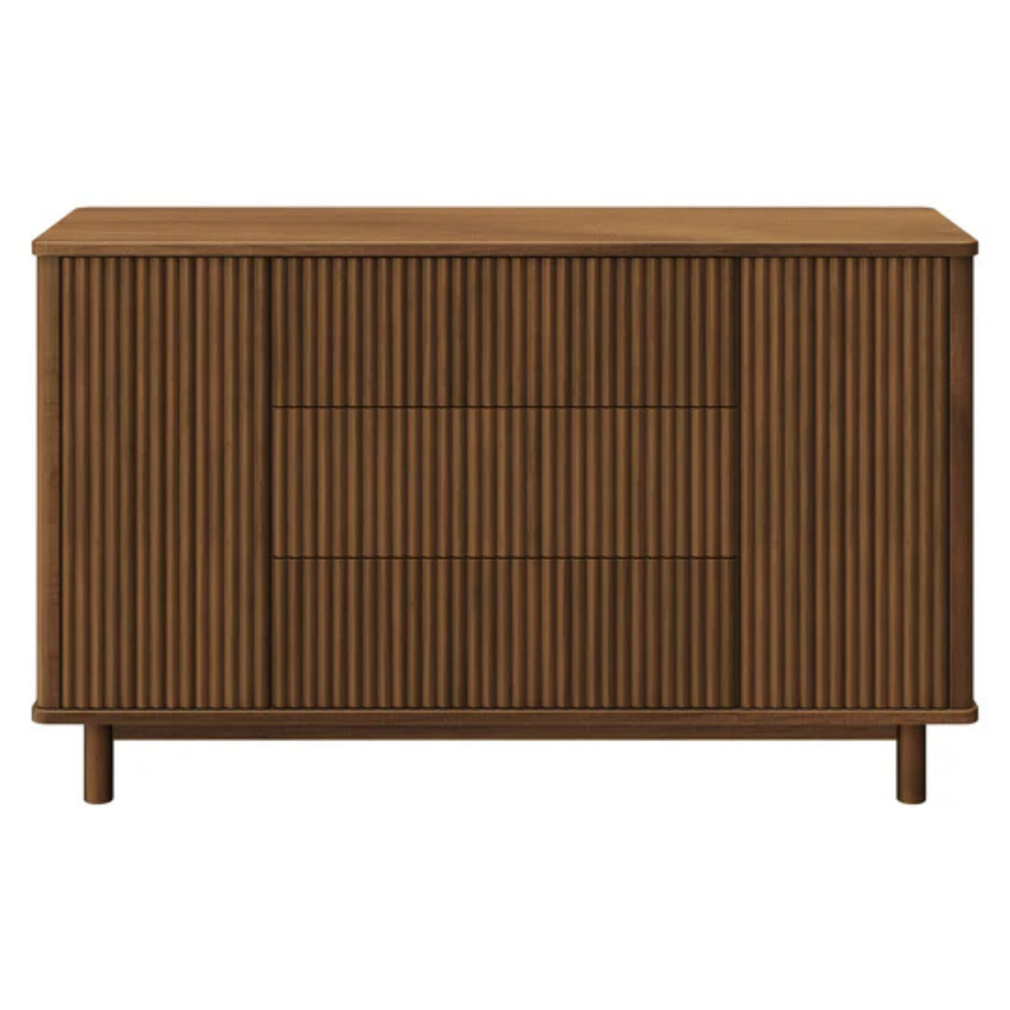The timeless Pogo Tambour Assembled Dresser exudes modern elegance with its textured fluted tambour paneling, smooth, rounded edges, and elevated silhouette. Designed for the nursery but beautiful enough for use throughout the home, it features push to open smooth-gliding drawers, spacious side cabinets, included anti-tip kit for safety, and best-of-all, it arrives fully assembled, ready out of the box.