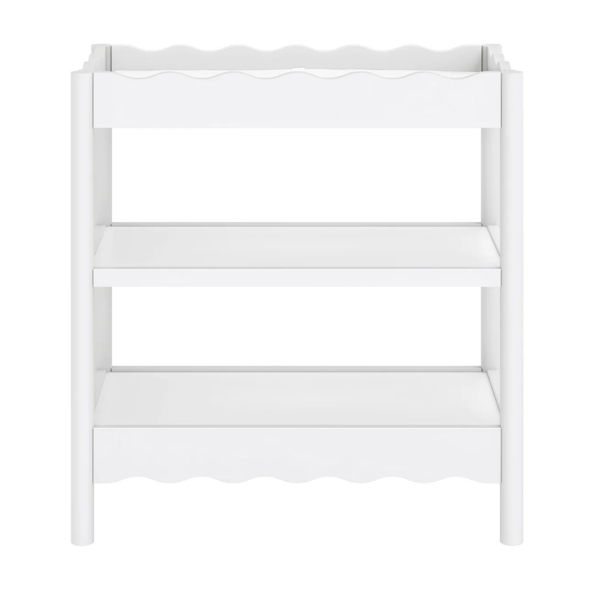 With rounded posts and wave-like edges, the Swell Changing Table has a modern appeal with an ocean-inspired design that pairs perfectly with your Swell Crib. It features two spacious, open shelves to keep all your baby’s diaper changing needs within easy reach for convenient changings.