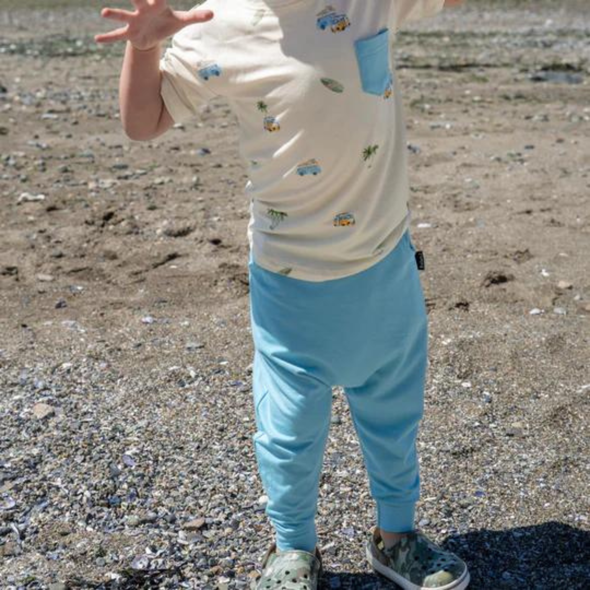 Elastic waisted pants made in premium Bamboo feature a drop crotch harem style and front pockets. An elastic waistband with a functional drawstring makes these easy to dress busy toddlers. Bamboo fabric has moisture wicking properties and is naturally temperature regulating making these a great daywear style.