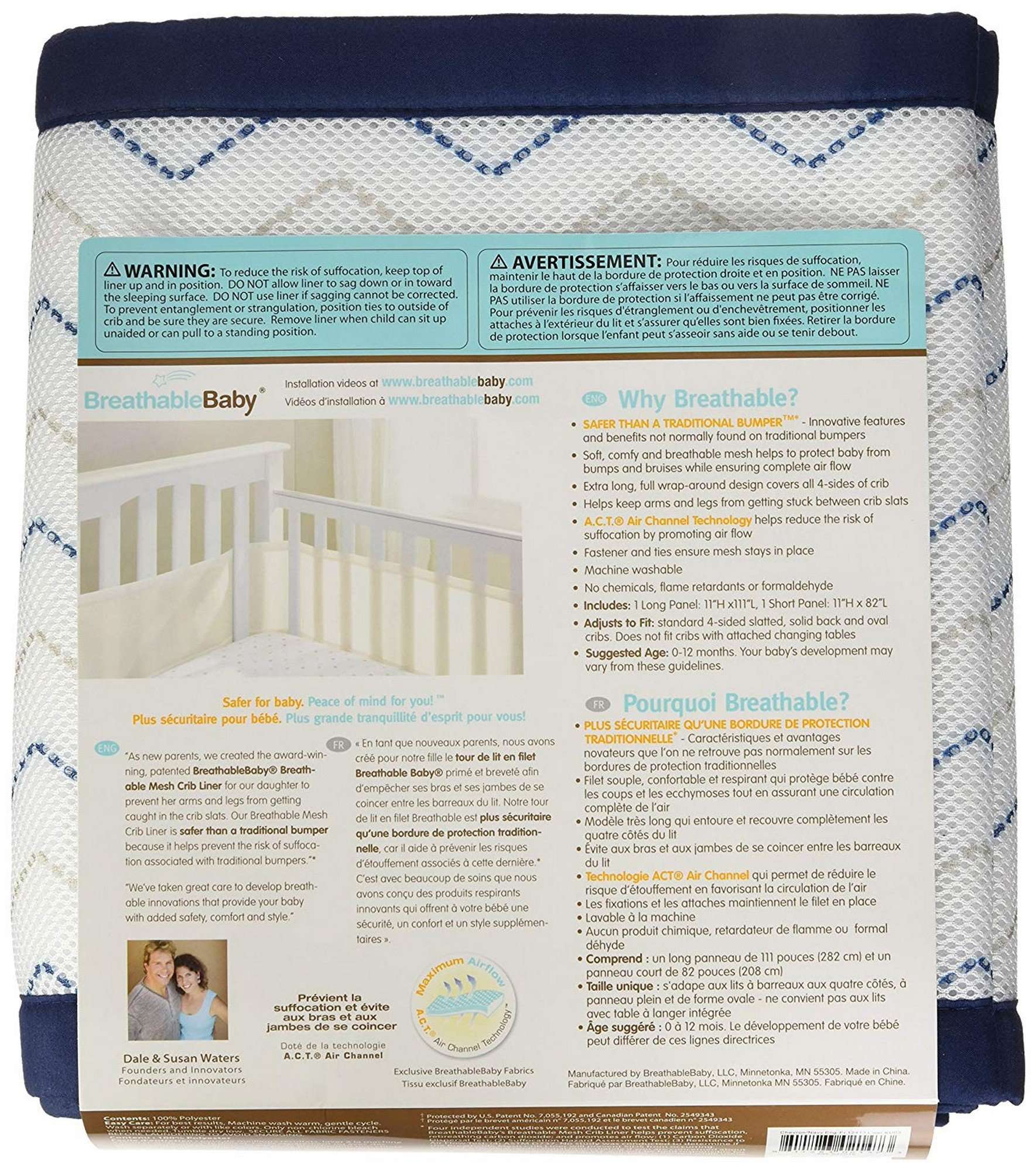 The award-winning, patented, BreathableBaby Breathable Bumper reduces the risks of suffocation, entanglement and climbing. Made with exclusive fabric with A.C.T. Air Channel Technology that promotes air-flow and helps maintain air access. Soft and padded, keeps little limbs safely inside the crib. Tucks below mattress for extra protection. Hypoallergenic poly mesh is machine washable and fast drying. Imported. Fits Standard 4-sided Slatted Cribs.