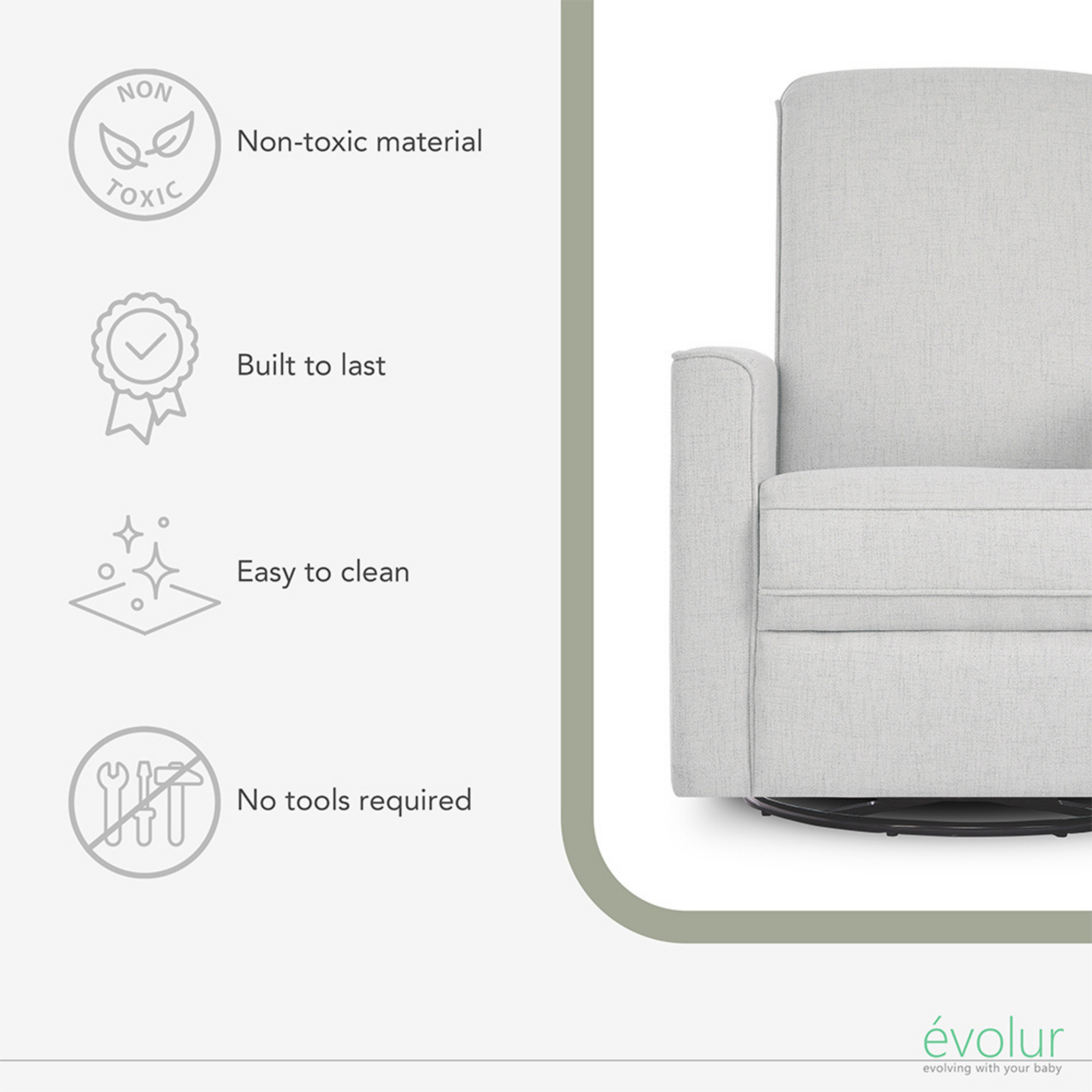 Pamper those aching muscles, nurse your baby or simply enjoy some downtime in the warm embrace of the Evolur Raleigh Basic Glider. From plush seating to smooth gliding motions and an easy to use reclining feature, the Raleigh spells luxury and comfort like no other! The Raleigh features an ergonomic backrest support, multiple reclining positions, comfortable side rests and smooth gliding, 360° swivel, designed to provide maximum comfort to your body. To recline, simply push back against the back rest while using the easy-to-reach lever to adjust the footrest.