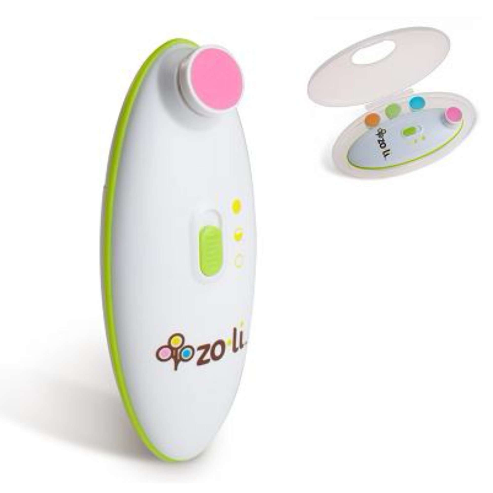 Buzz B is a battery operated nail trimmer. It safely trims nails with a gentle yet effective oscillating action. The cushioned pads are specially designed for baby's nails so it won't harm surrounding skin. With two different power settings, parents can control the speed. Buzz B includes 1 AA battery, 4 different pads of varying textures (2 infant / 2 toddler) and a compact case for easy portability or storage.