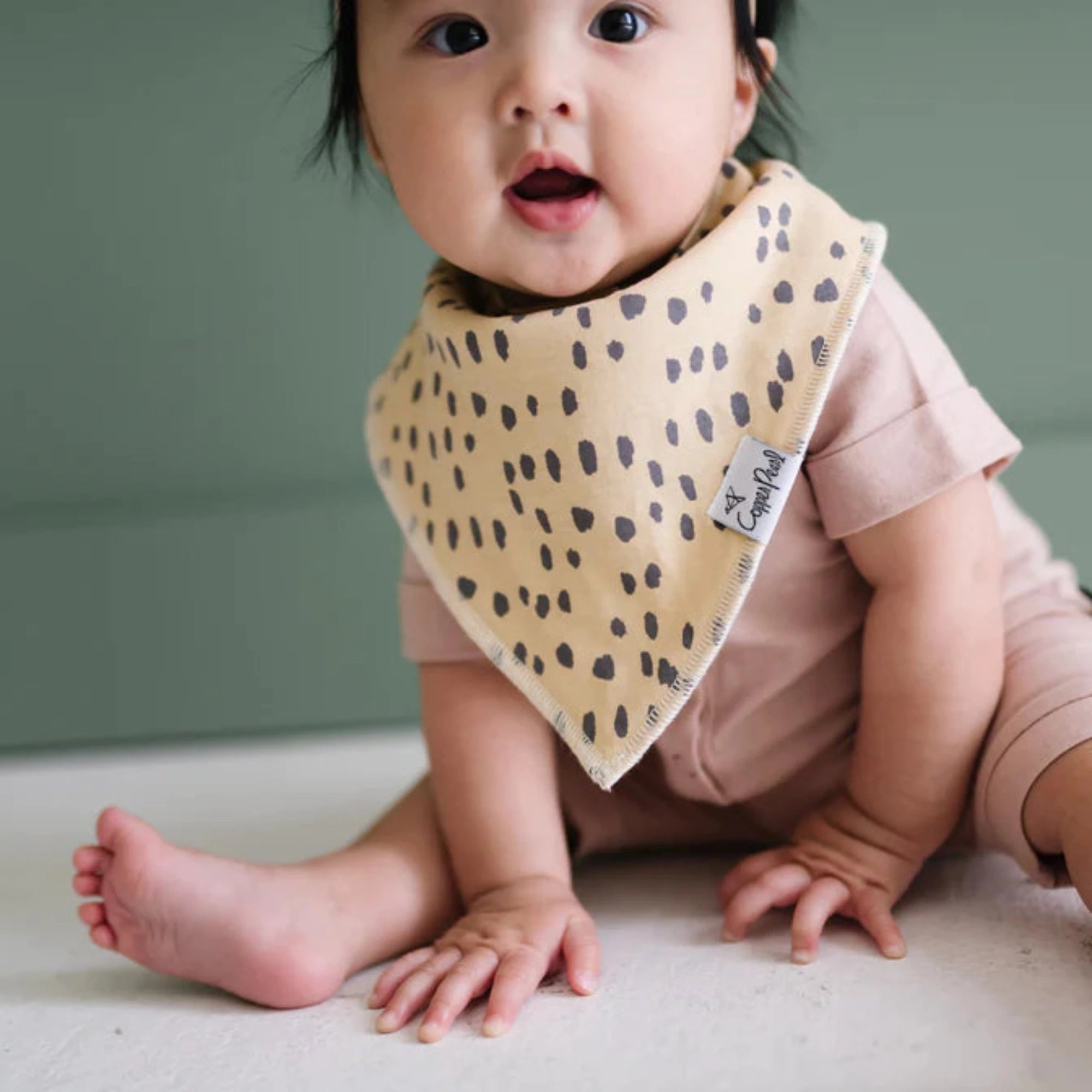 Absorbent cotton drool bibs! These stylish drool bibs from Copper Pearl are made of 100% absorbent cotton on the front and 100% polyester fleece on the back. The front of the baby bib is a stylish knit fabric and the back is a super soft fleece that keeps your baby completely dry even with the drooliest of babies.