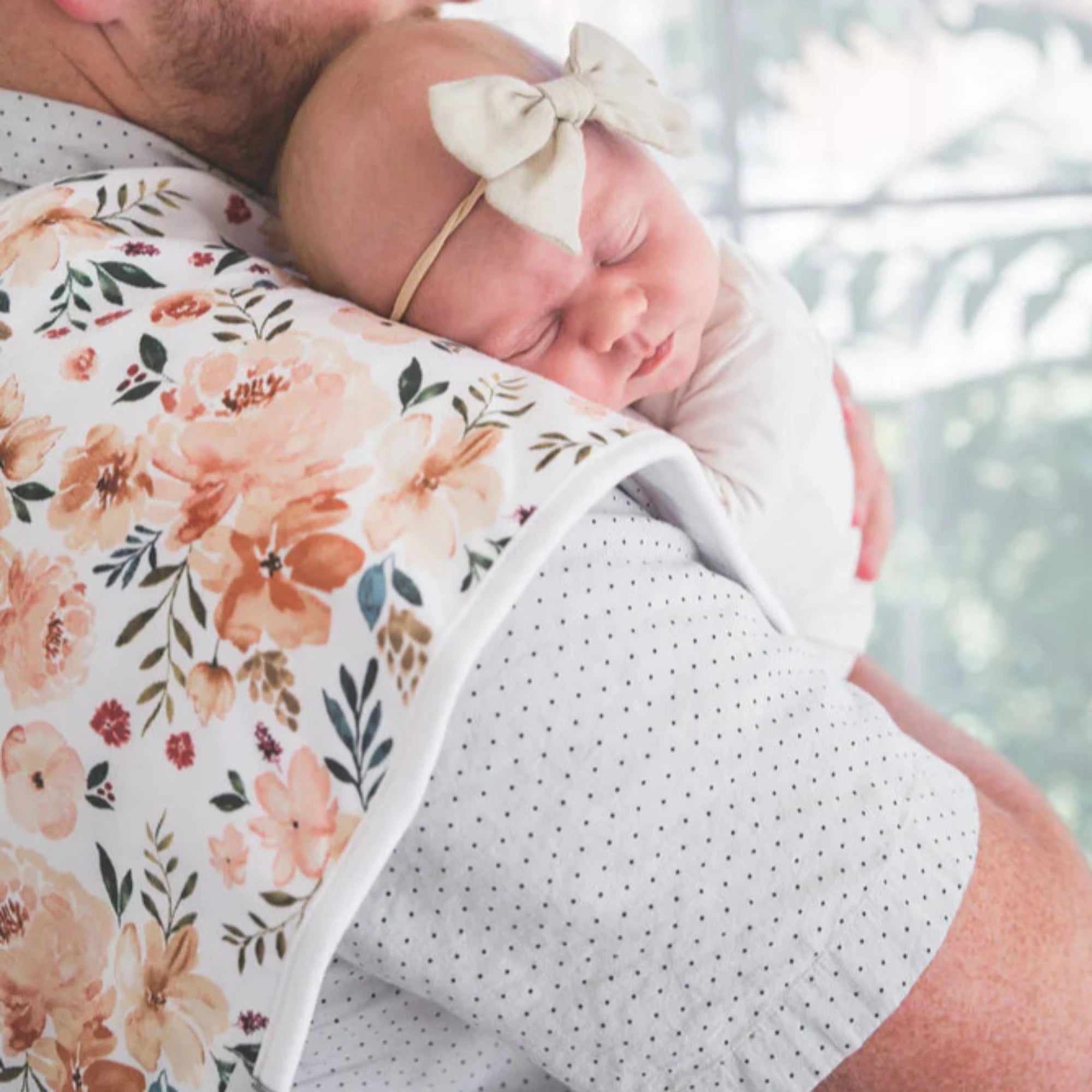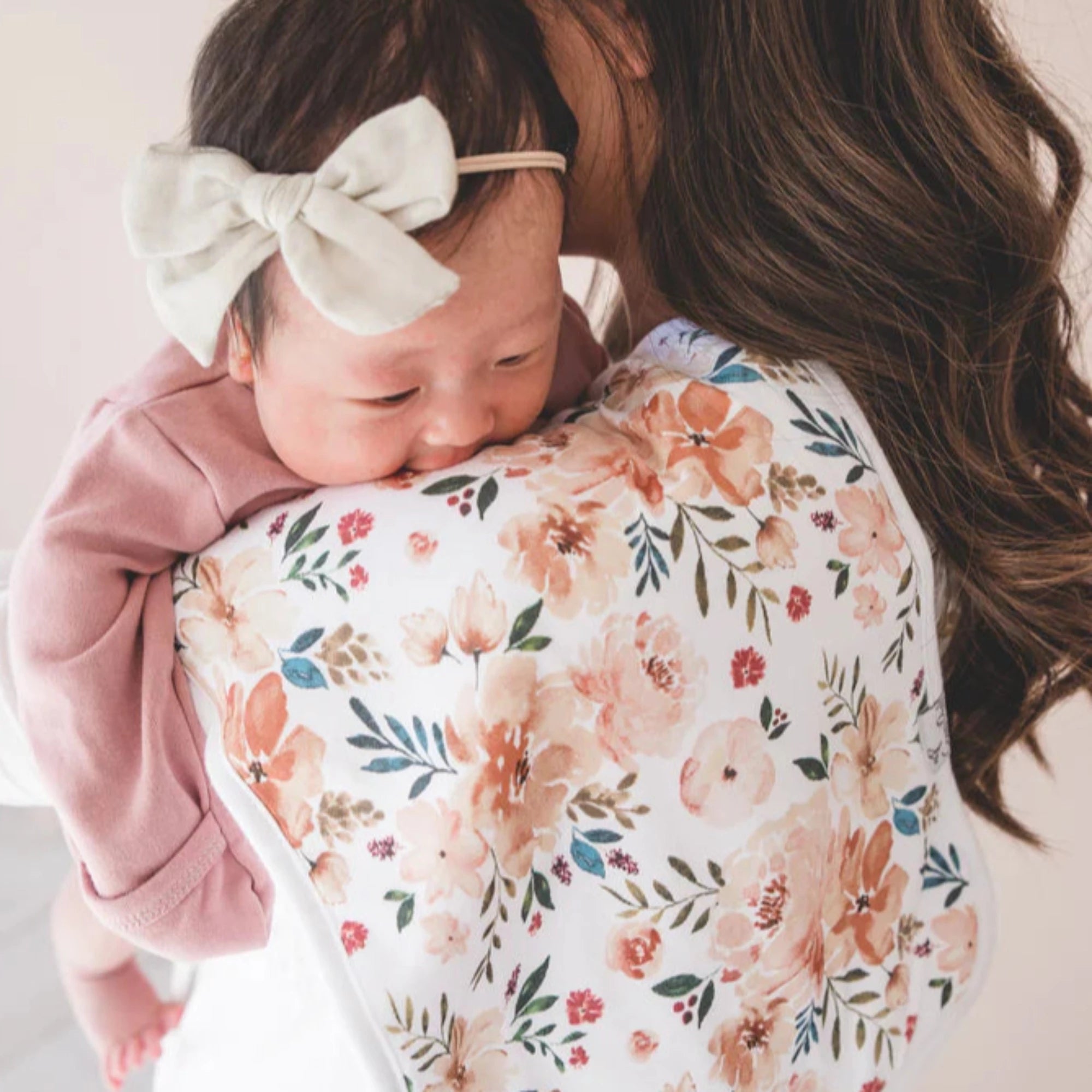 Copper Pearl's burp cloths are designed with the baby’s comfort in mind. That’s why we created them with 100% ultra-soft cotton layers on the front (patterned) and back (plain white). You can feel confident that the baby will feel cozy against your shoulder while burping.