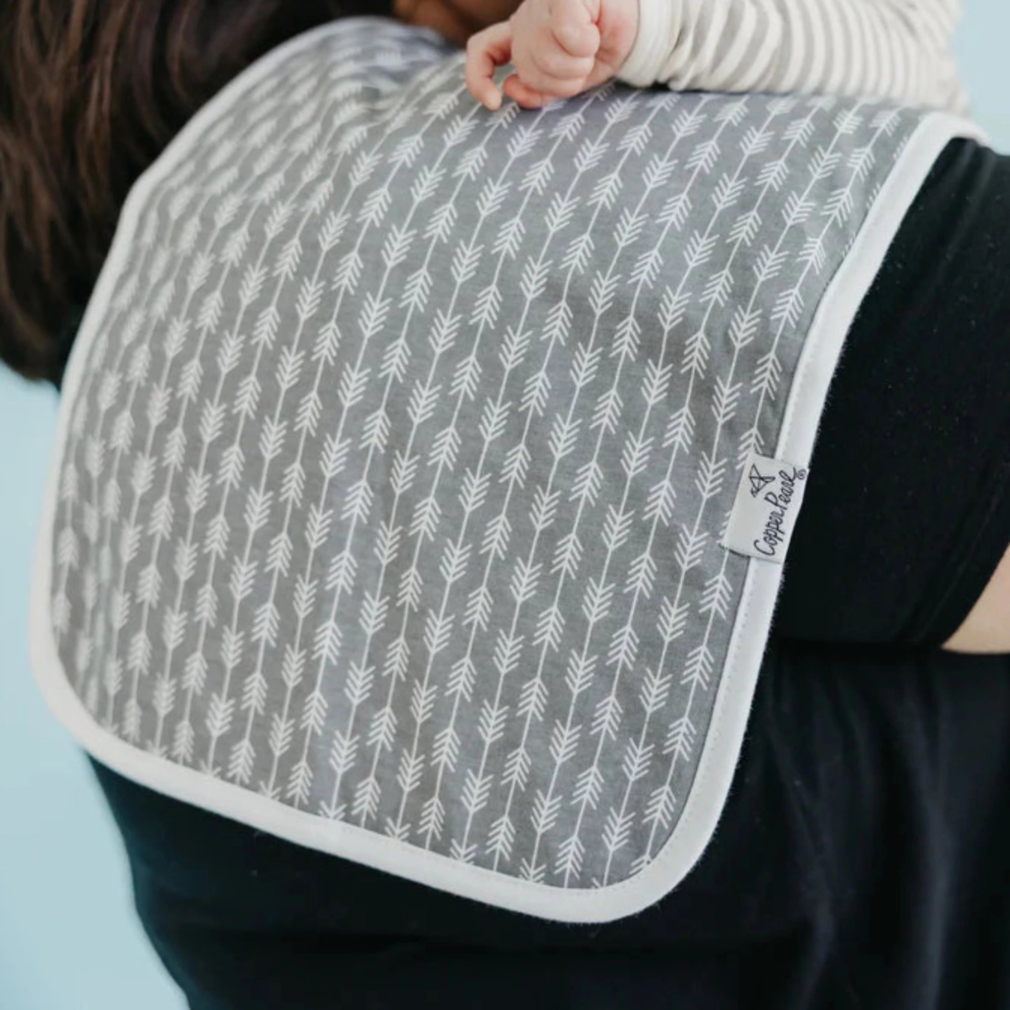 Copper Pearl's burp cloths are designed with the baby’s comfort in mind. That’s why we created them with 100% ultra-soft cotton layers on the front (patterned) and back (plain white). You can feel confident that the baby will feel cozy against your shoulder while burping.