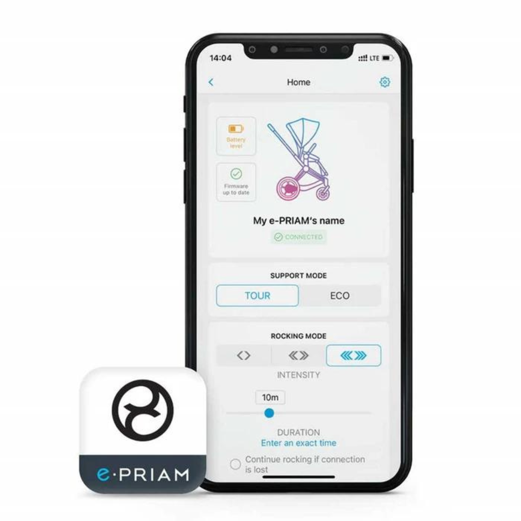 It’s the e-PRIAM stroller, upgraded: With its all-new and free-of-charge CYBEX App, you can activate the rocking function, control the level of support from the electric motors, and check your battery and firmware.