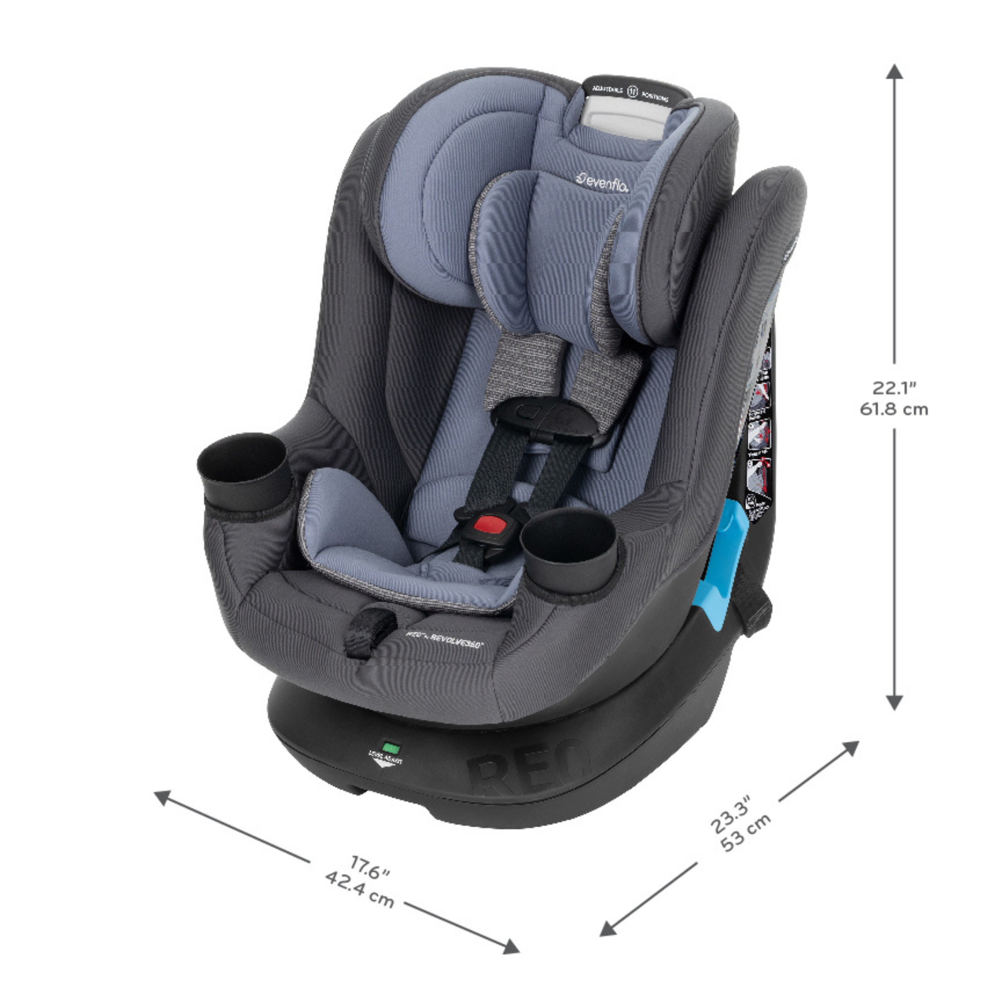 New parent jitters? Not your first rodeo? About to be a grandparent? Need a second seat? Whatever brings your search for a safe, easy-to-use car seat to Evenflo® ’s REO™ by Revolve360™ Rotational Convertible Car Seat, you’ve come to the right place! For practicality and real ease, there’s nothing better than one-hand, 360° rotation — no kidding. Shortens your reach. Helps to save your back. Simplifies getting your child in and out of the car. Secure, one-and-done LATCH installation with hassle-free hooks makes things easy from the outset. Then, when your little one is ready for forward-facing, just rotate — no uninstalling. The compact 17 in. wide footprint makes space for passengers without sacrificing your child’s safety or comfort. REO provides rear-facing mode for children 4 lb to 40 lb (17 in. to 43 in. tall) with optimal infant fit, and forward-facing mode for children from 30 lb to 40 lb (35 in. to 43 in. tall). An excellent and compact choice for grandparents, caregivers and secondary vehicles. 11-position headrest easily adjusts with one hand while the no-rethread harness adjusts in one step for comfort and security as your child grows. Includes 2 removable, dishwasher-safe cup holders.