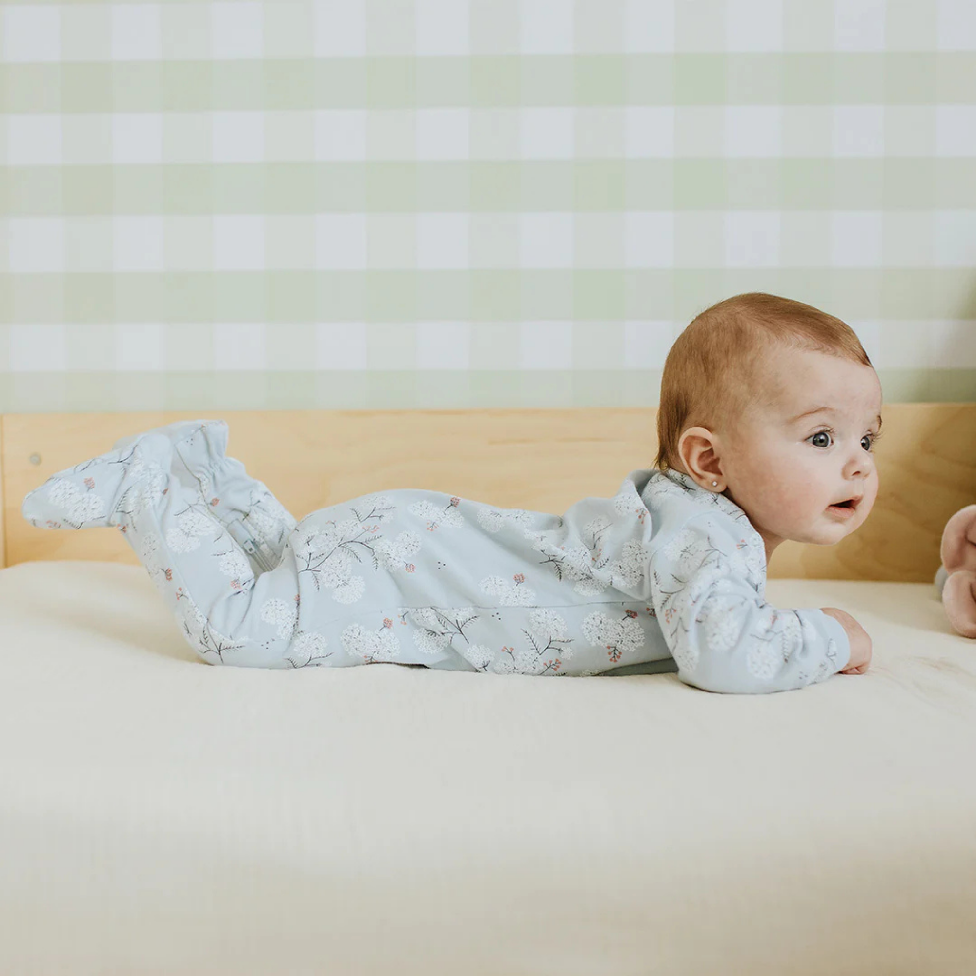Take the sunny days of spring to bed with this pretty Hydrangea print sleeper. With beautiful flowers and a color palette like a perfect blue sky, the sleeper makes a great gift idea for expecting parents. Made from organically grown cotton jersey, the sleeper is light and breathable, keeping her at just the right temperature through the night. The two-way zipper means baby can be changed without removing the whole suit. Matching PJs are available for older siblings so they can dive into the new season together.
